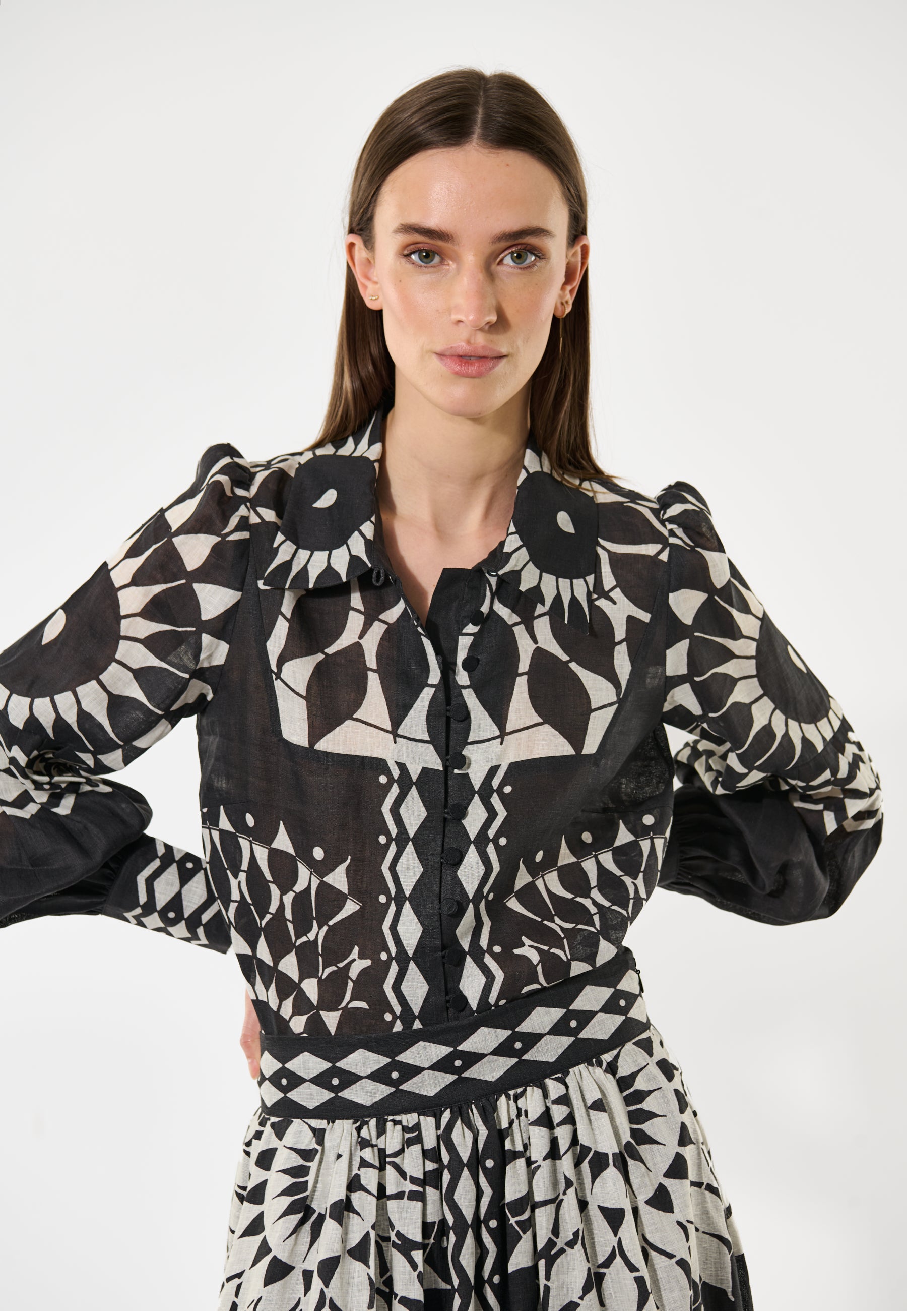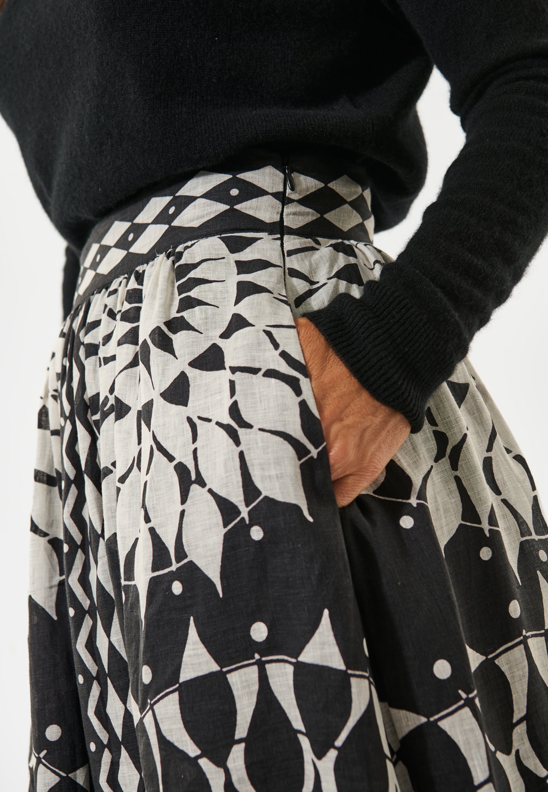 Smuk hør nederdel i 70´er inspireret sort/hvidt grafiskprint. Nederdelen bred linning, lommer, masser af vidde samt rynk under linningen. Den lukkes med en diskret lynlås-lukning i siden