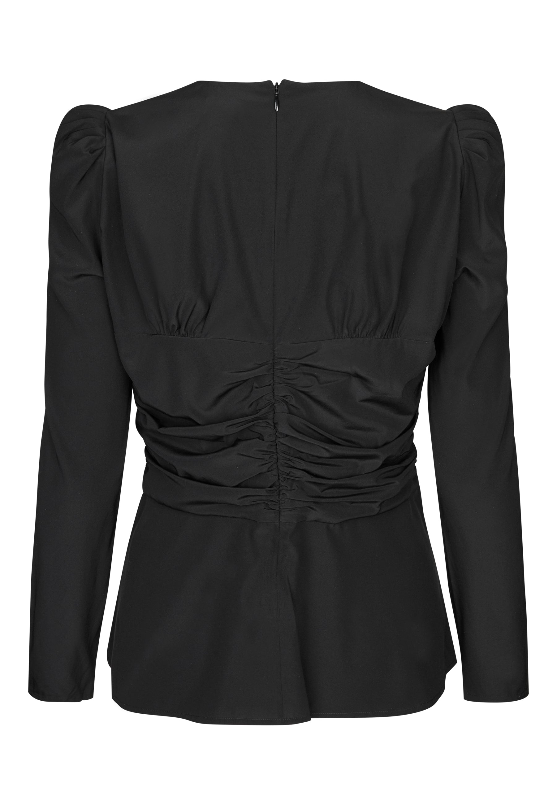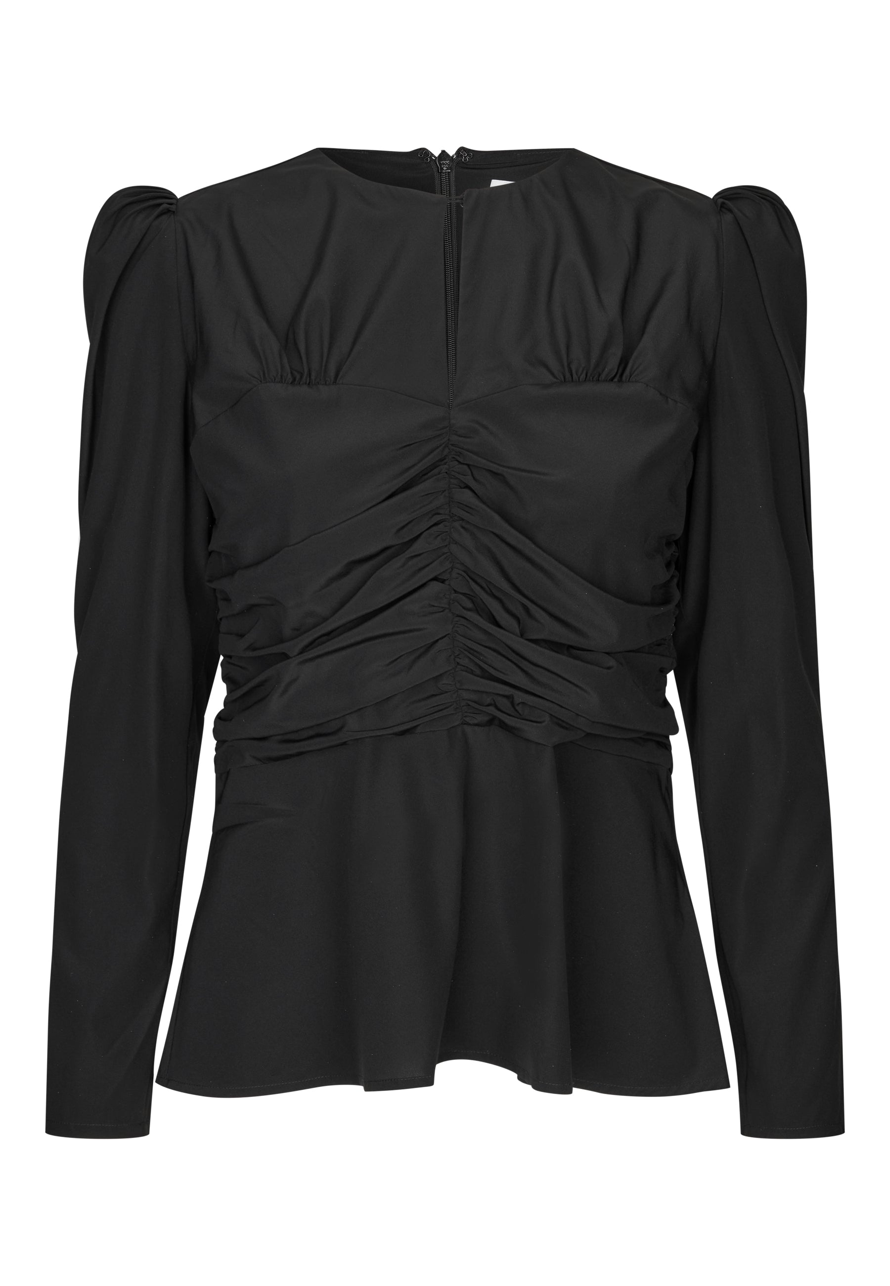 Smuk sort silkebluse med draperet taljestykke, rundhals med knap, pufærmer, samt lynlåslukning i ryggen.