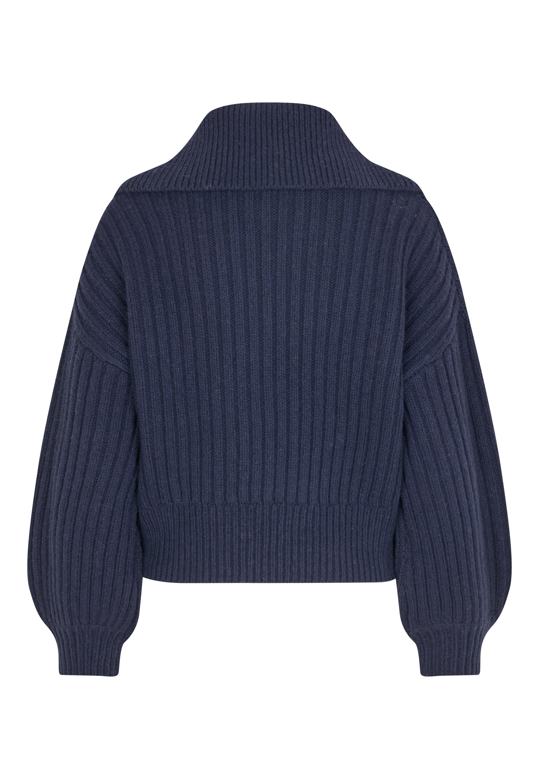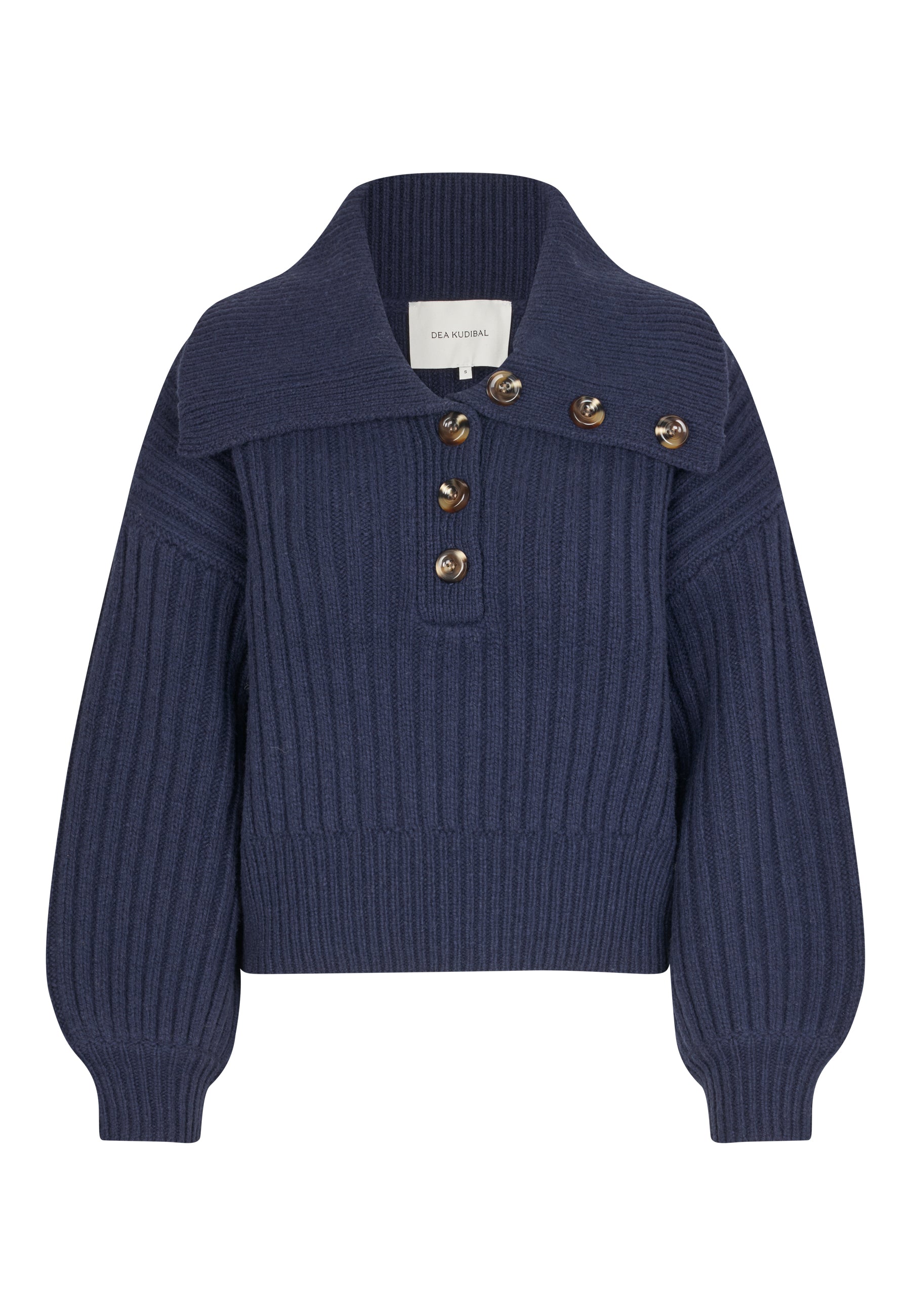Cool strik i bred rib. Strikken har knaplukning i halsen, stor krave og brede ærmer med rib-manchet.