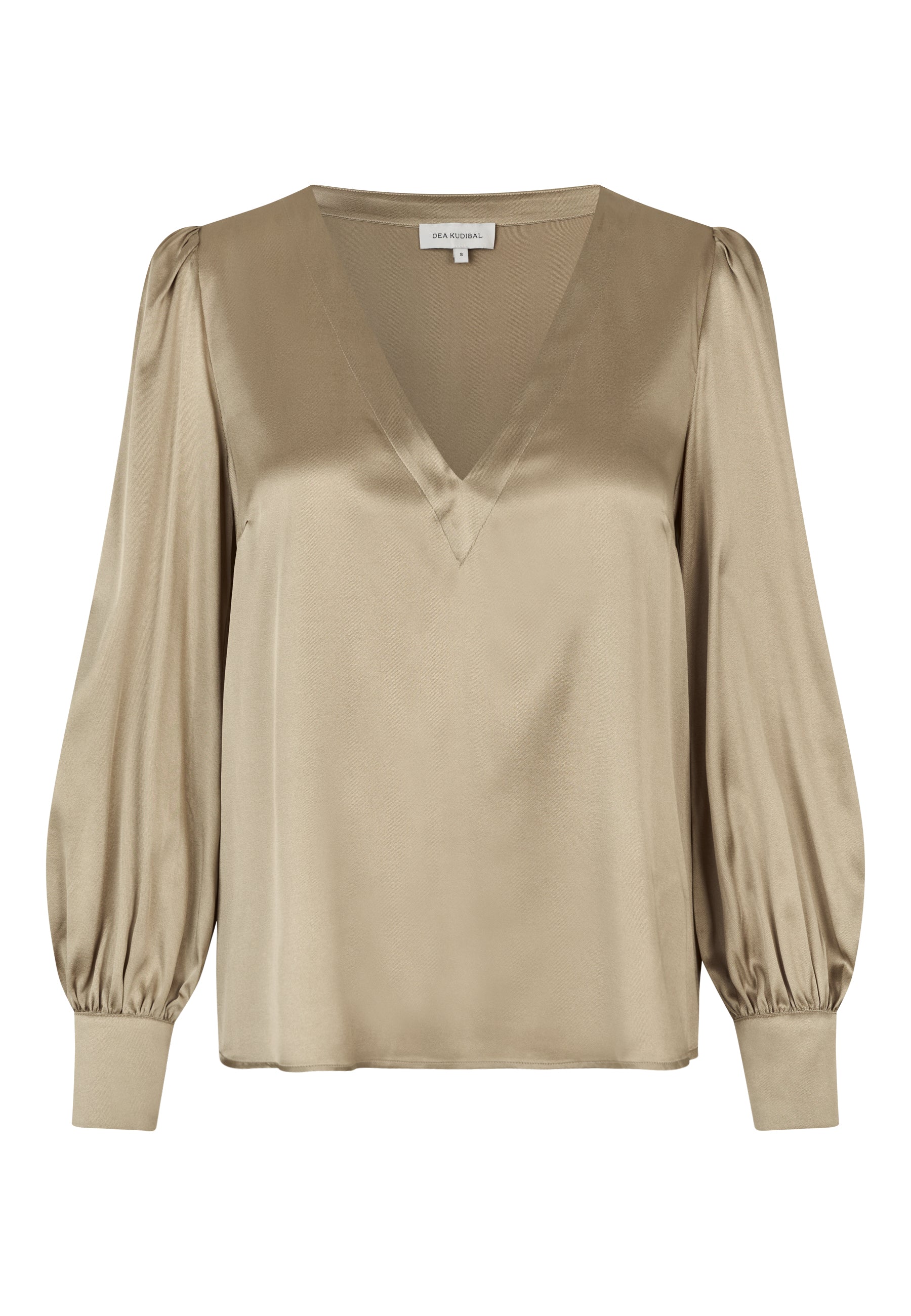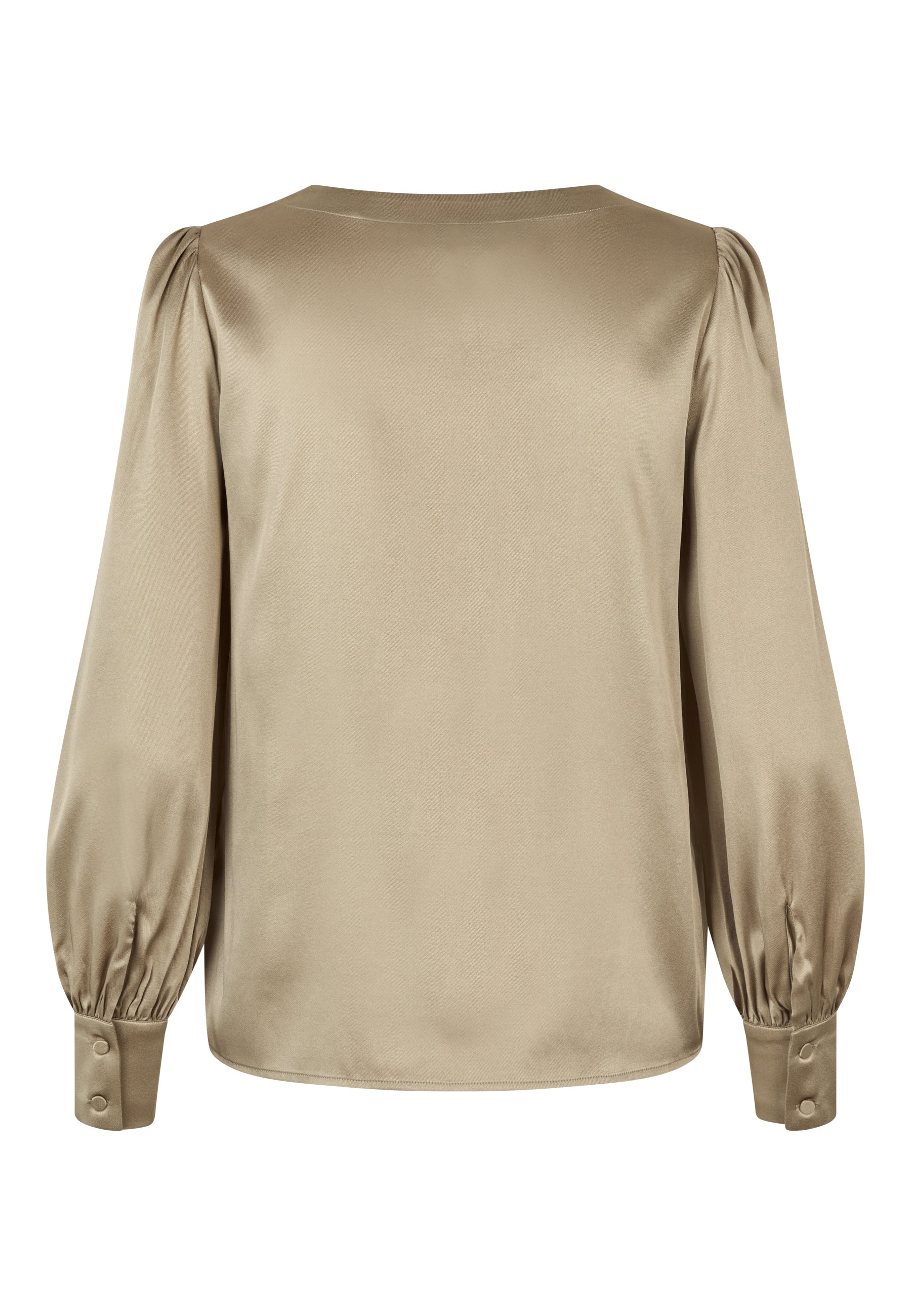 Silke tunika med V-udskæring, små rynk på skulderen, samt smukke manchetter med betrukne knapper.