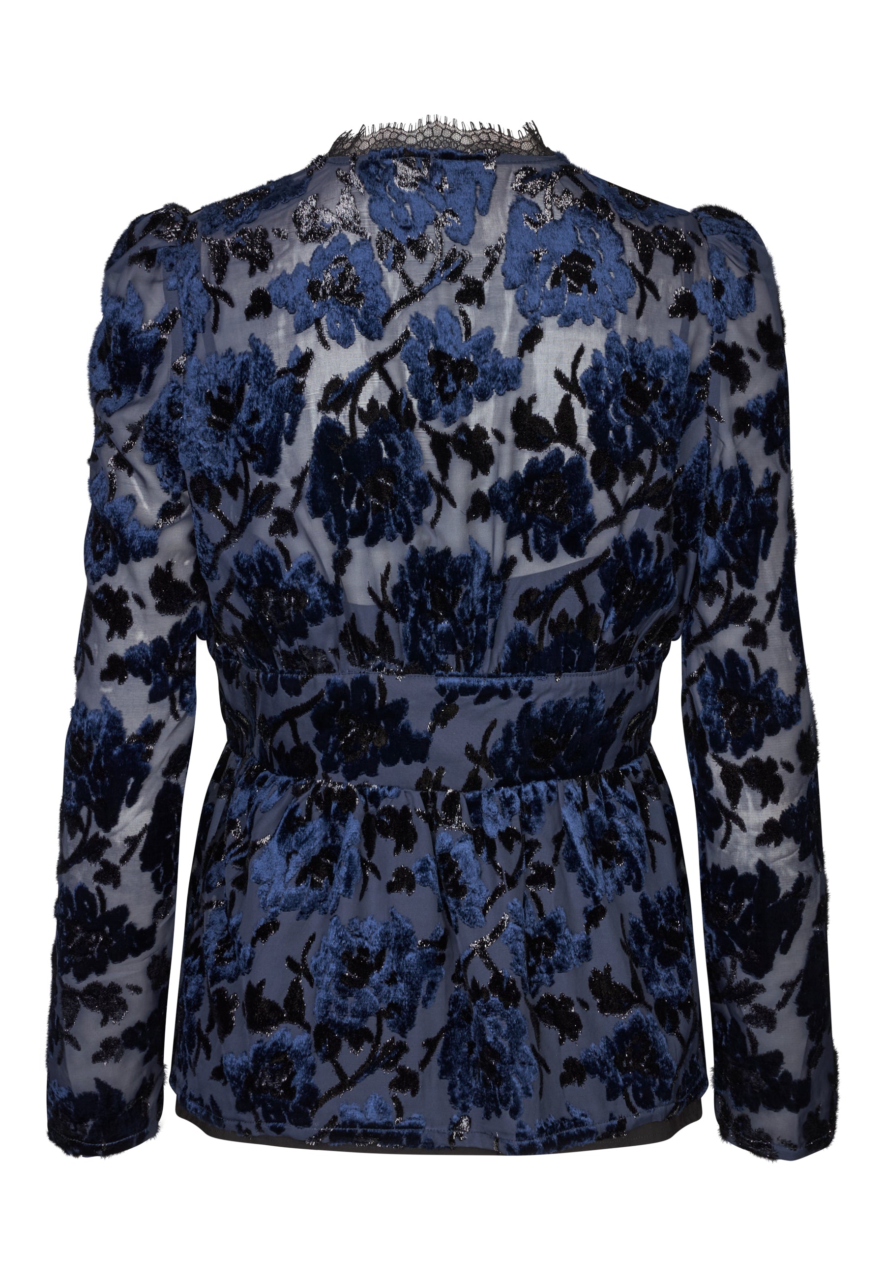 Smuk peplum bluse i midnatsblå burn-out silkevelour. Blusen har lynlås lukning i siden, en fin blondedetalje i halsudskæring, et bredt fast taljestykke, som giver den et feminint look og ærmer med let puf. Der medfølger en sort viscose top.