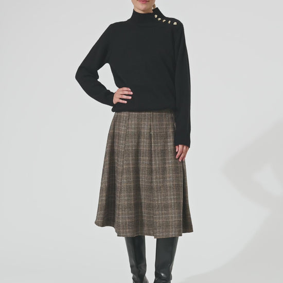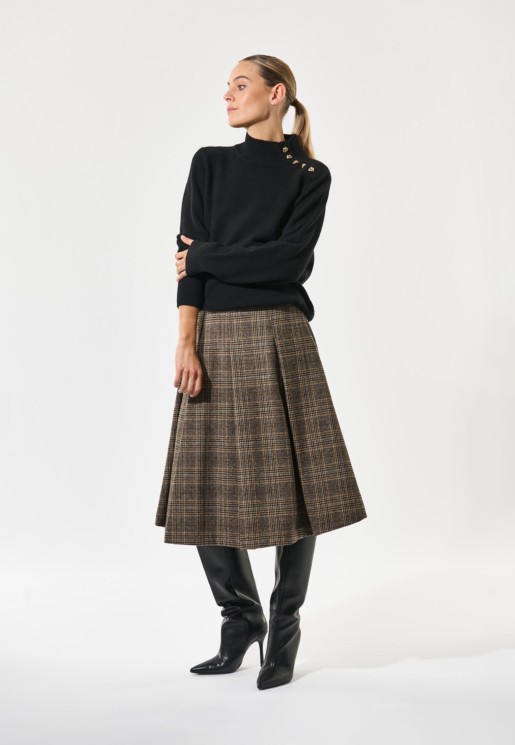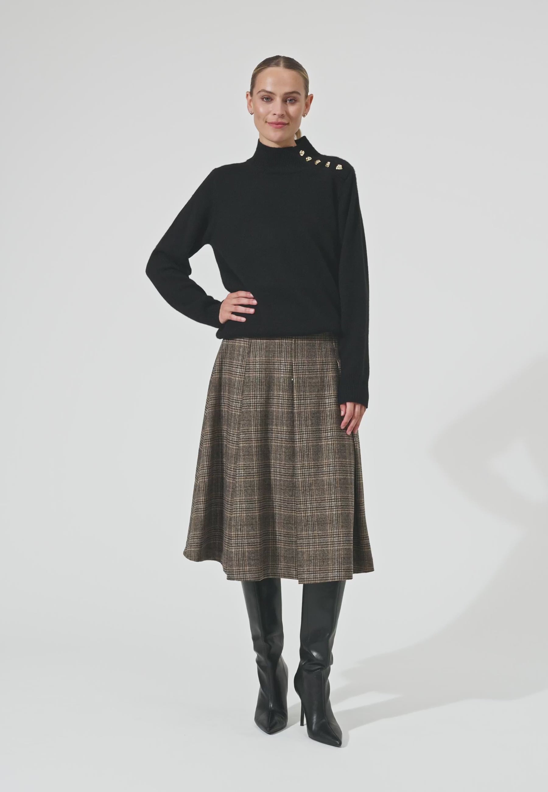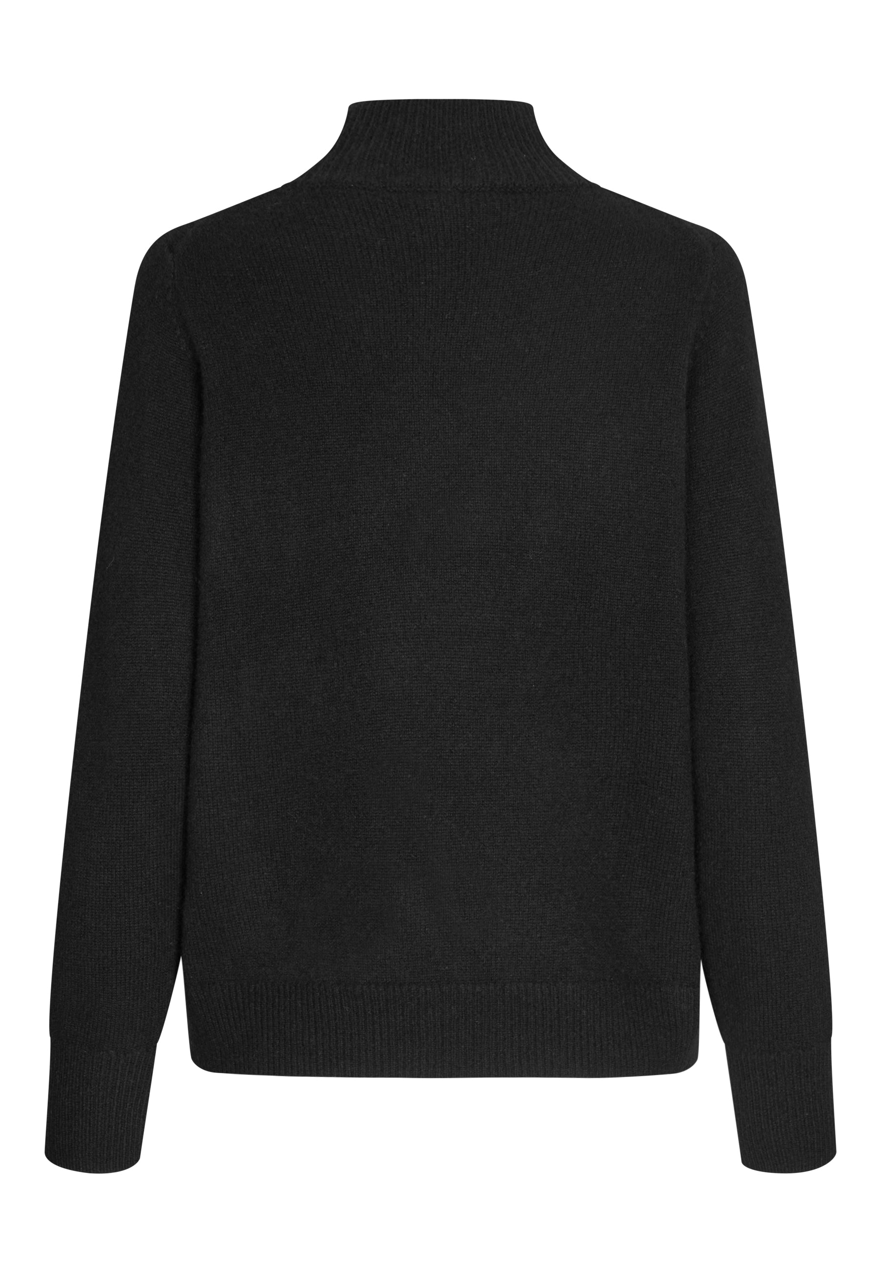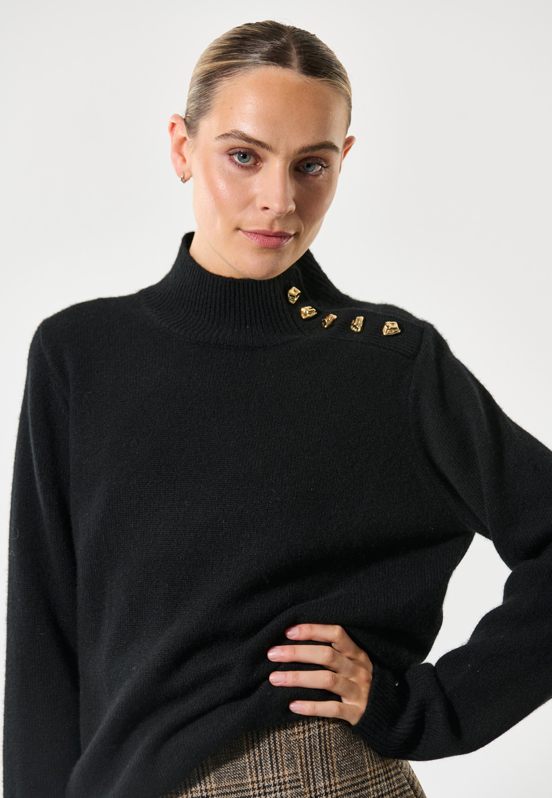 Sort cashmere bluse i et enkelt snit med turtleneck og lukning med smukke bankede gyldne knapper på venstre skulder.