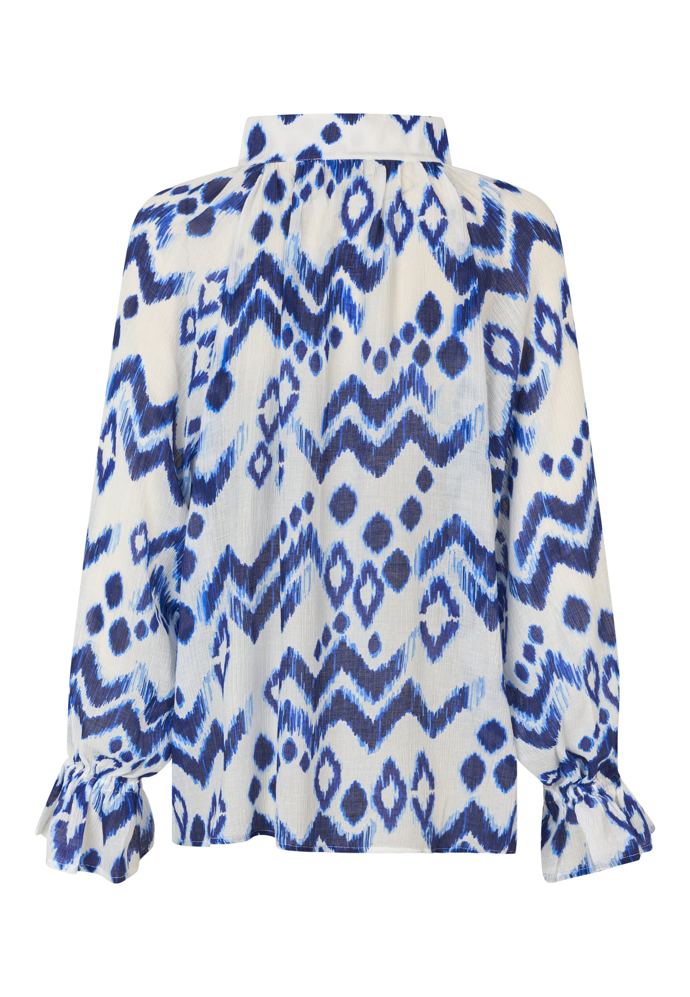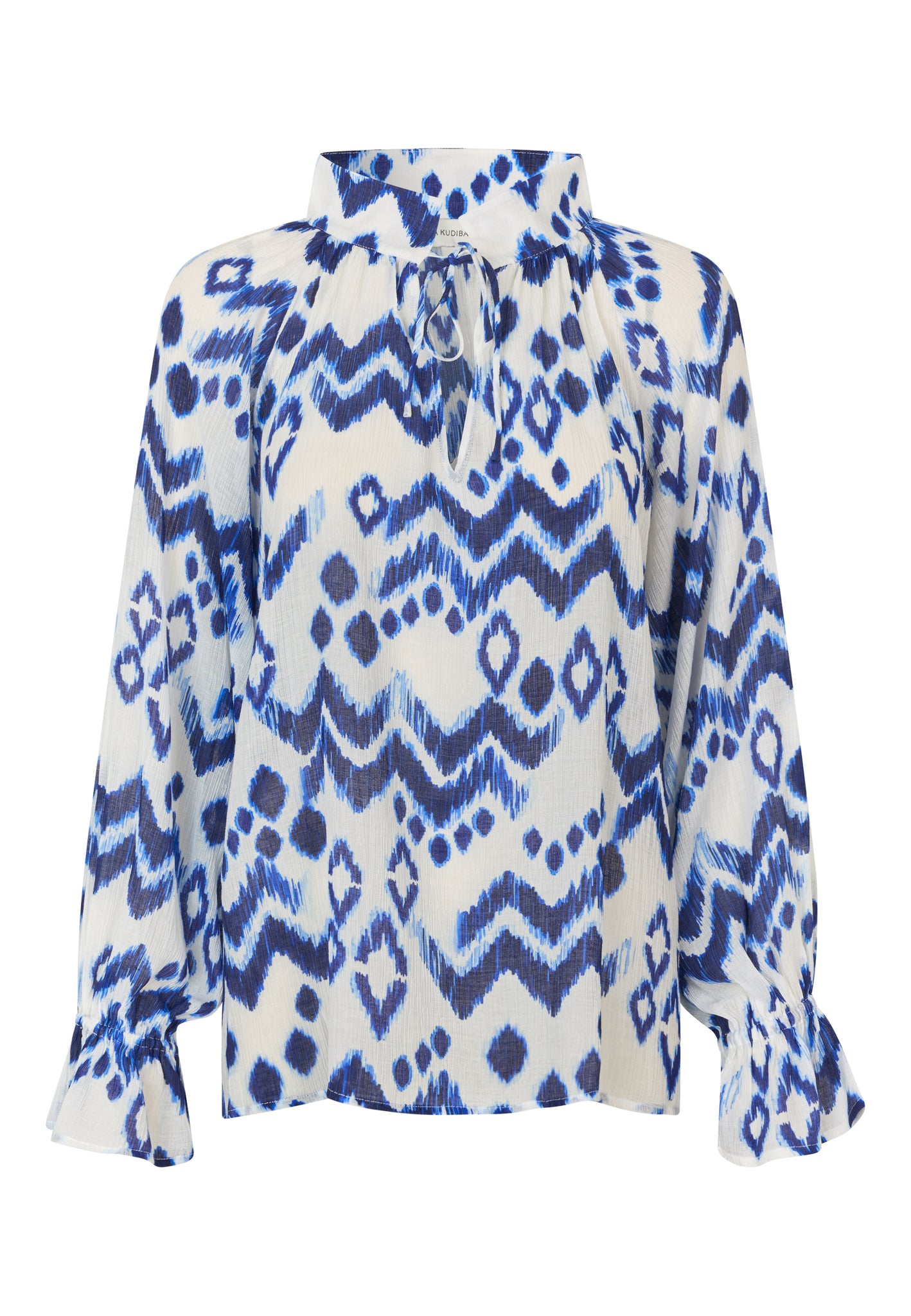 Skøn løs tunika med høj krave, raglanærmer, bindebånd i halsen og elastikmanchet.