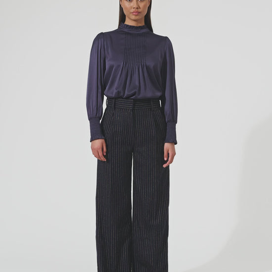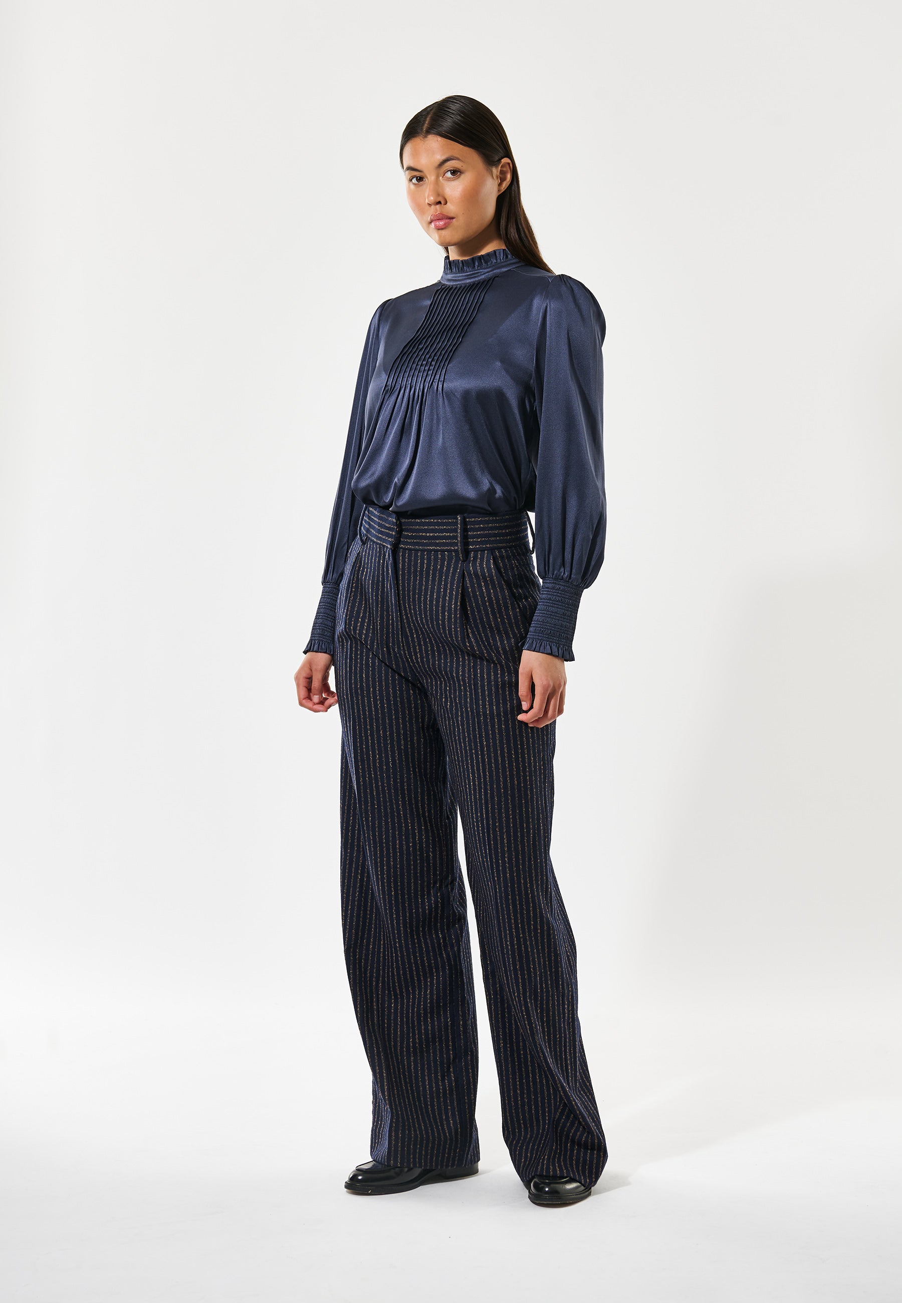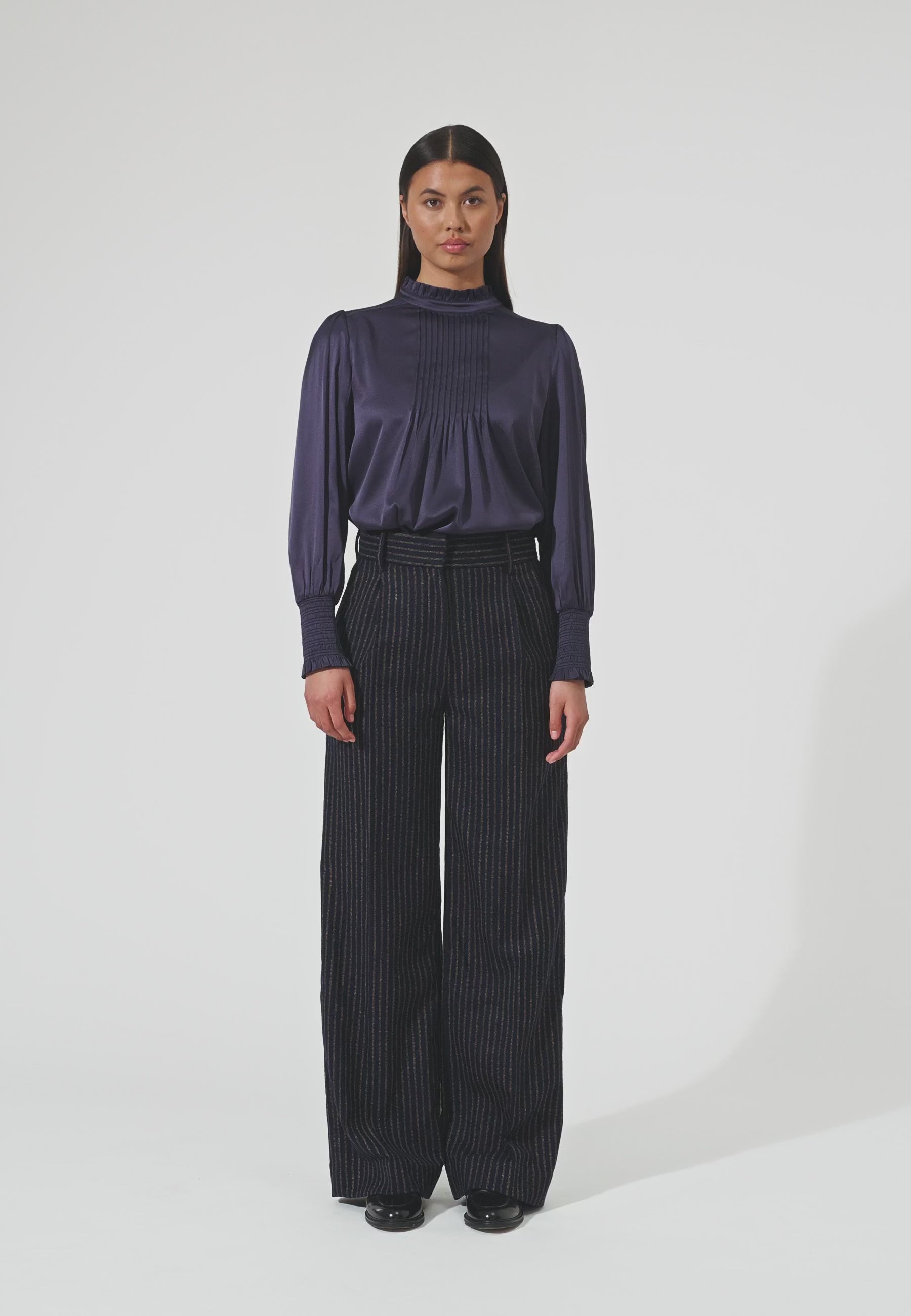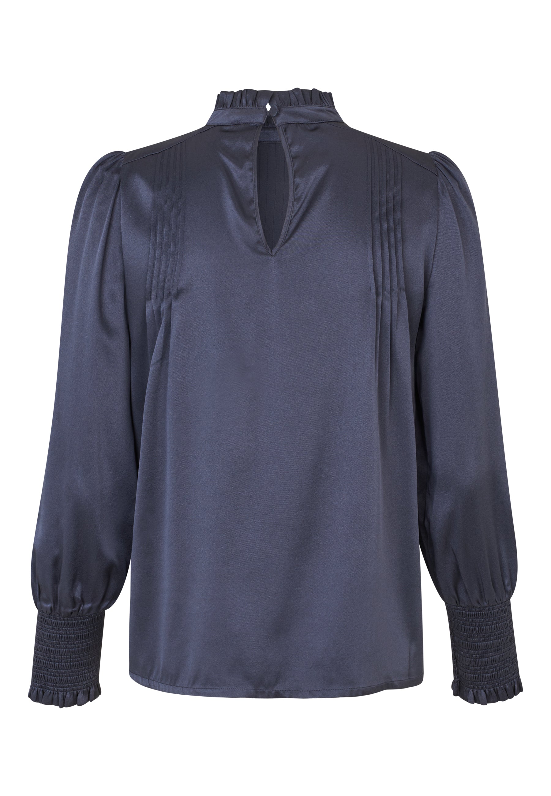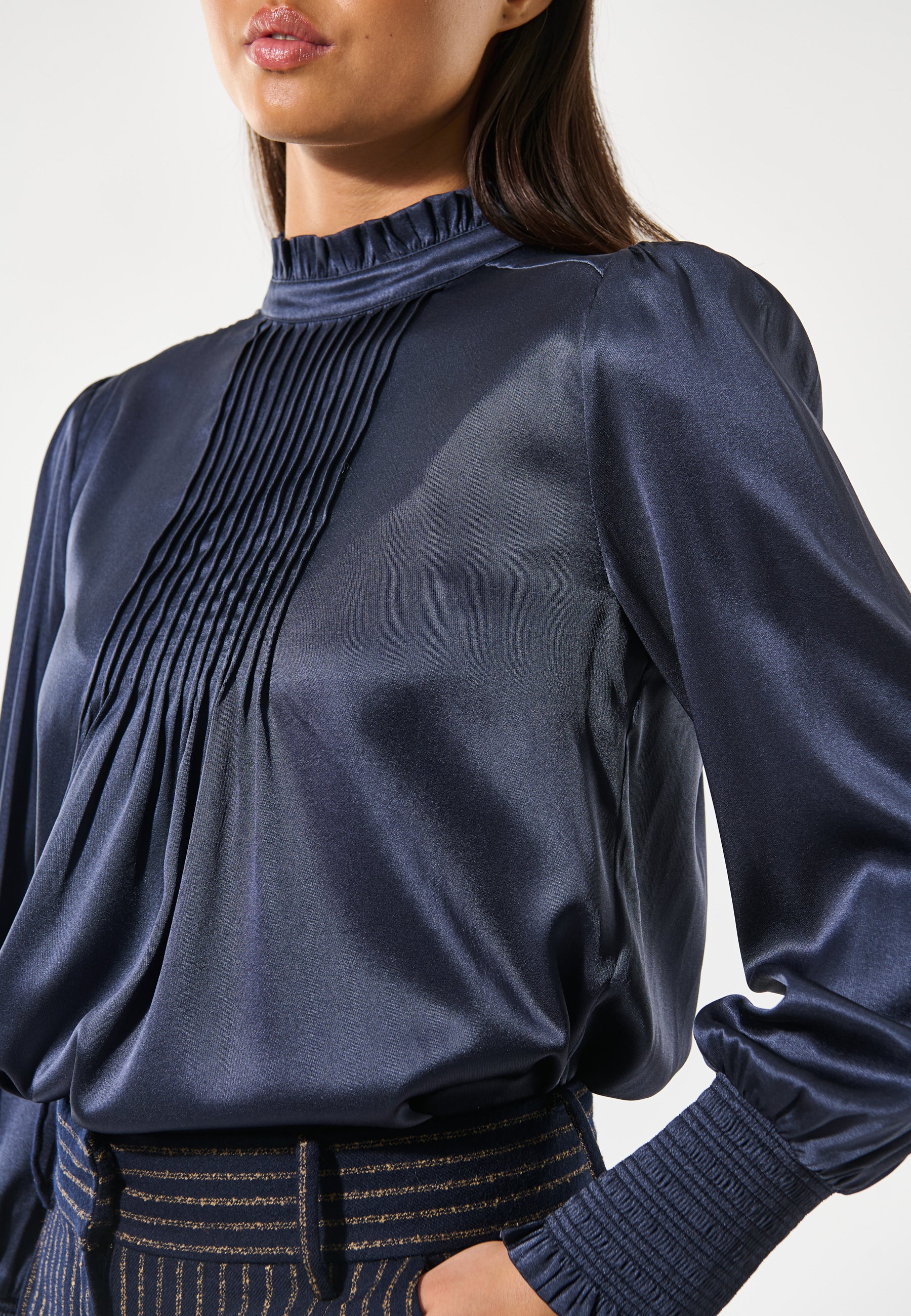 Smuk silketunika i klassisk mørkeblå farve. Tunikaen har høj krave med flæsekant, små læg på bryststykket, brede ærmer med puf og elastikmanchet. den lukkes i nakken med en lille betrukket knap.