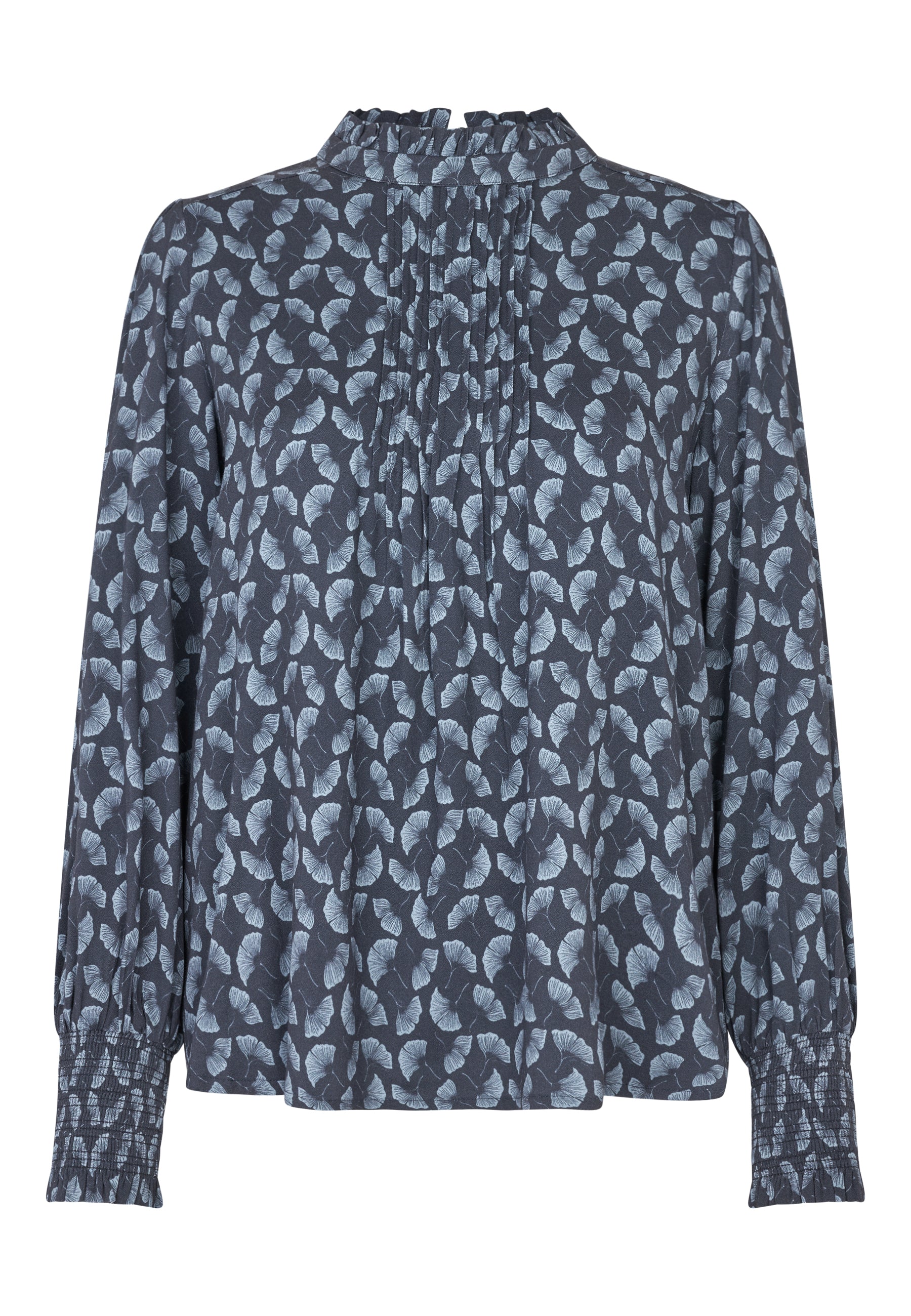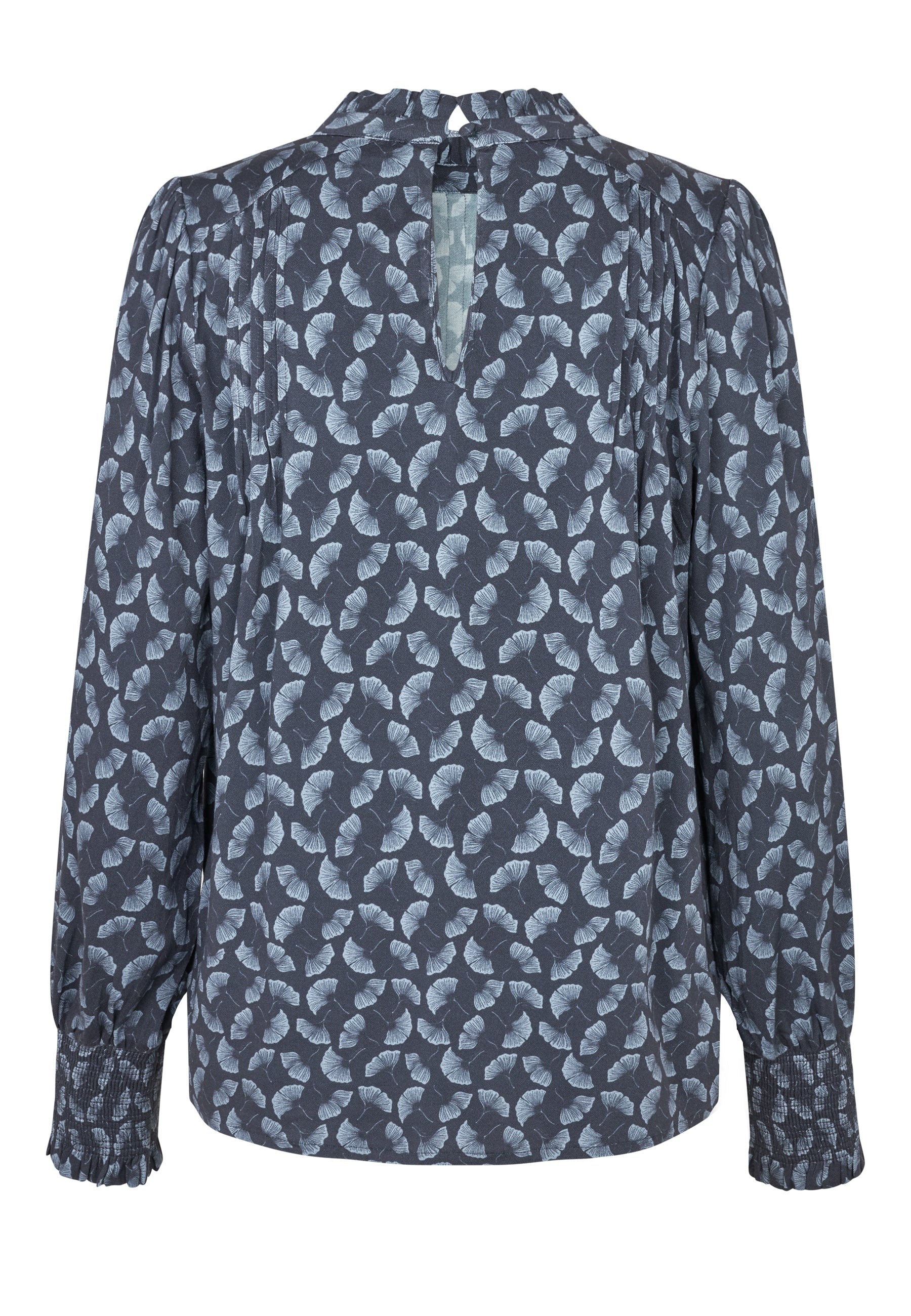 Smuk viscosetunika i et enkelt print bestående af enkle lyseblå blomster på mørkeblå bund. Tunikaen har høj krave med flæsekant, små læg på bryststykket, brede ærmer med puf og elastikmanchet. den lukkes i nakken med en lille betrukket knap.