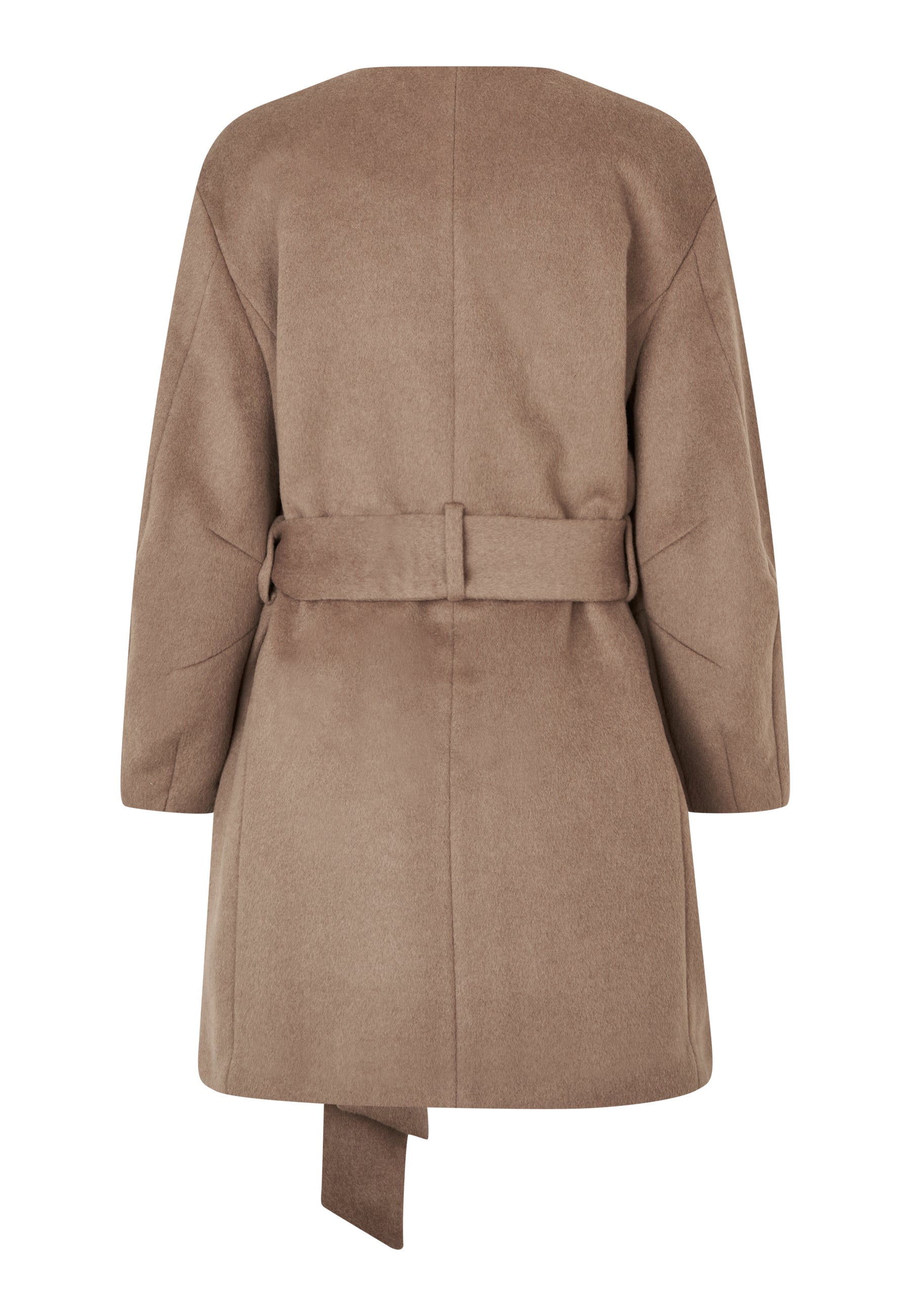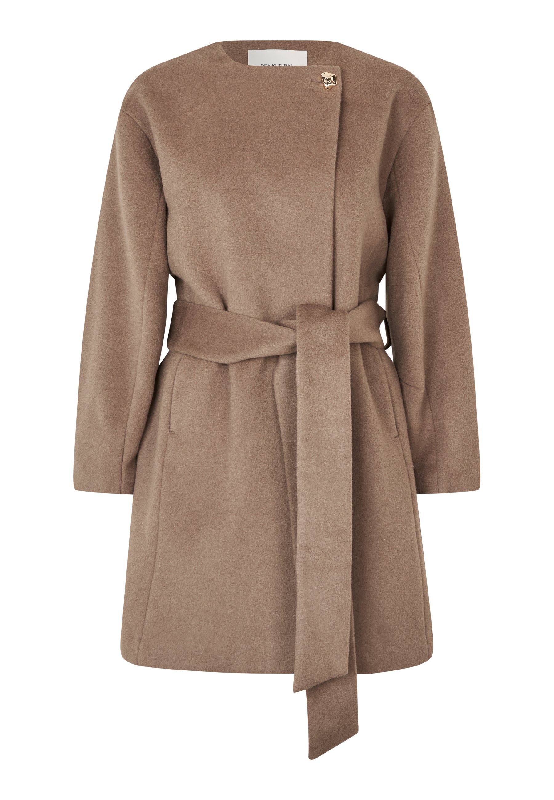 Lækker kort vinterfrakke i klassisk camelfarvet uldmateriale. Frakken har et løst snit og bredt bindebælte til at fremhæve taljen. Den har stiklommer, en asymmestrisk lukning som holdes på plads af en gylden banket knap samt et bred bindebælte. Ærmerne er volumiøse, men ved hjælp af fine indsnit smalle ved håndledet.