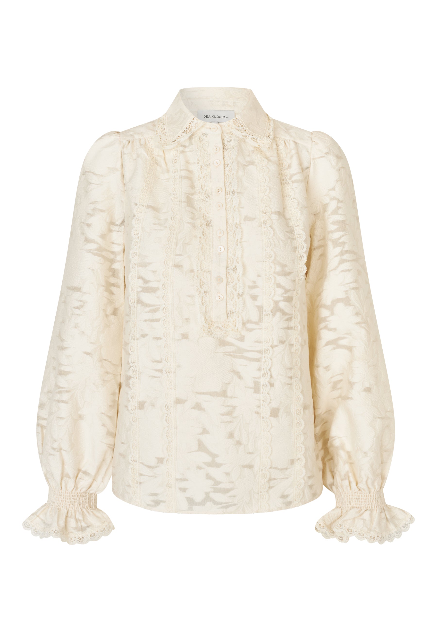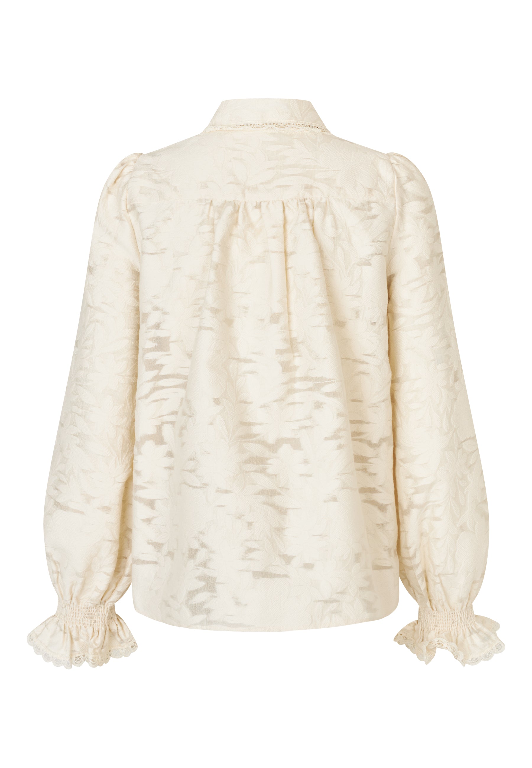 Skøn tunika i kraftigt burn-out materiale. Tunikaen har klassisk skjortekrave med kniplingsblonde, elastik manchet, pufærme og bærestykke med læg på ryggen.