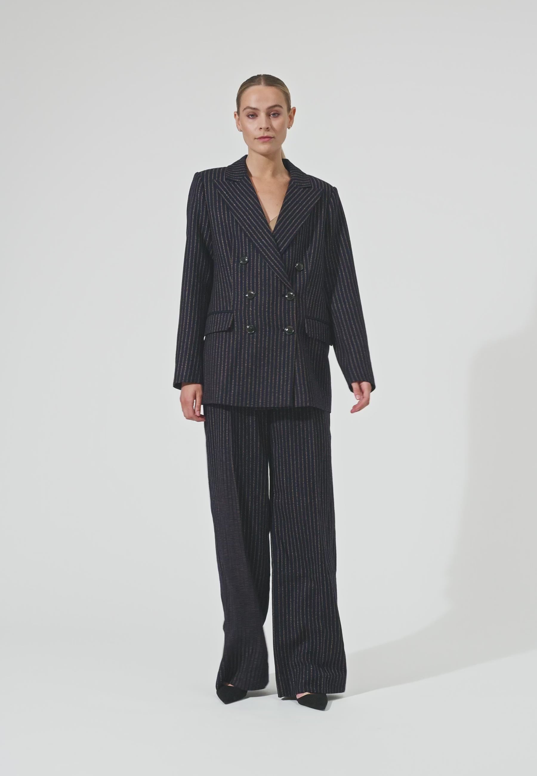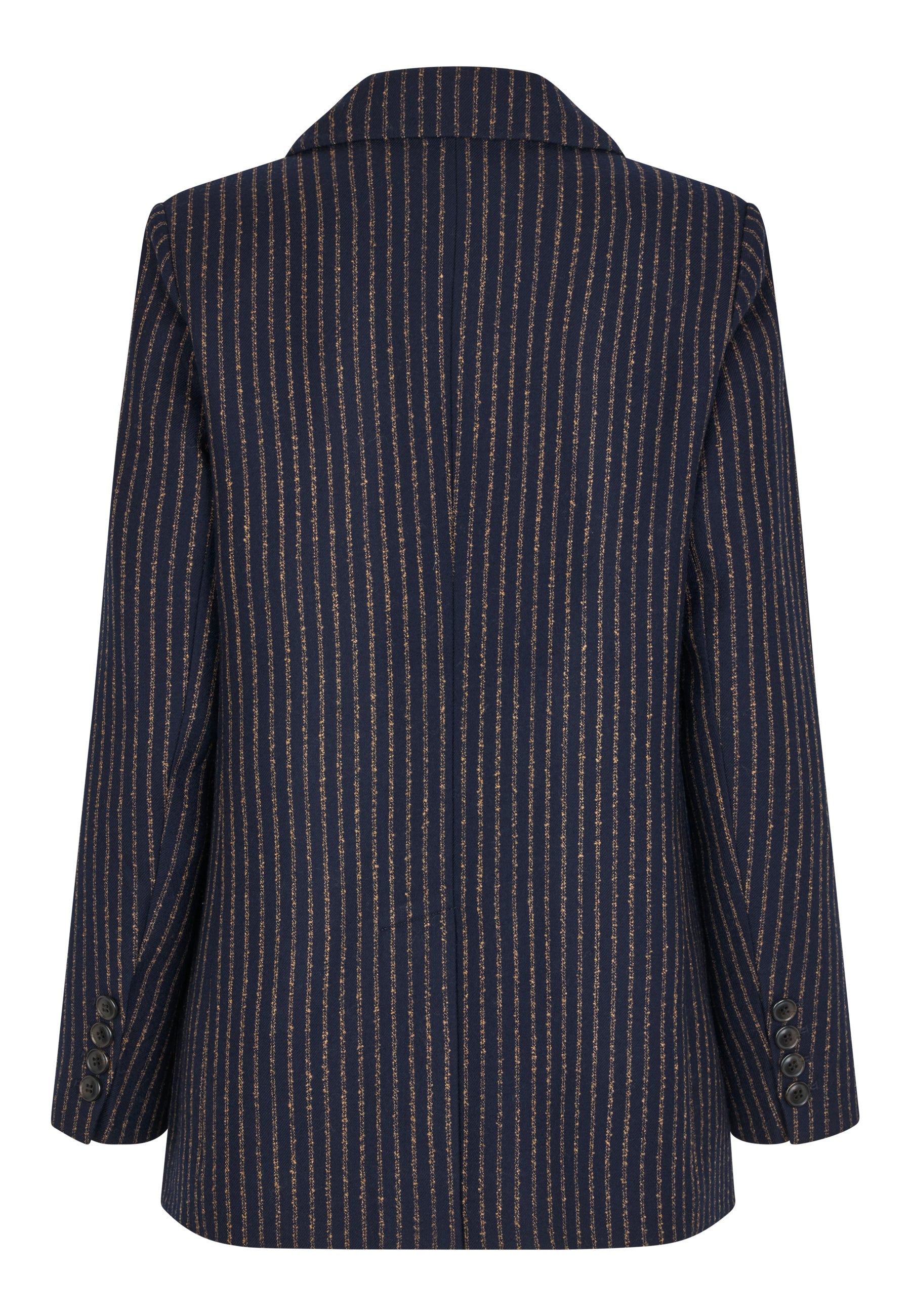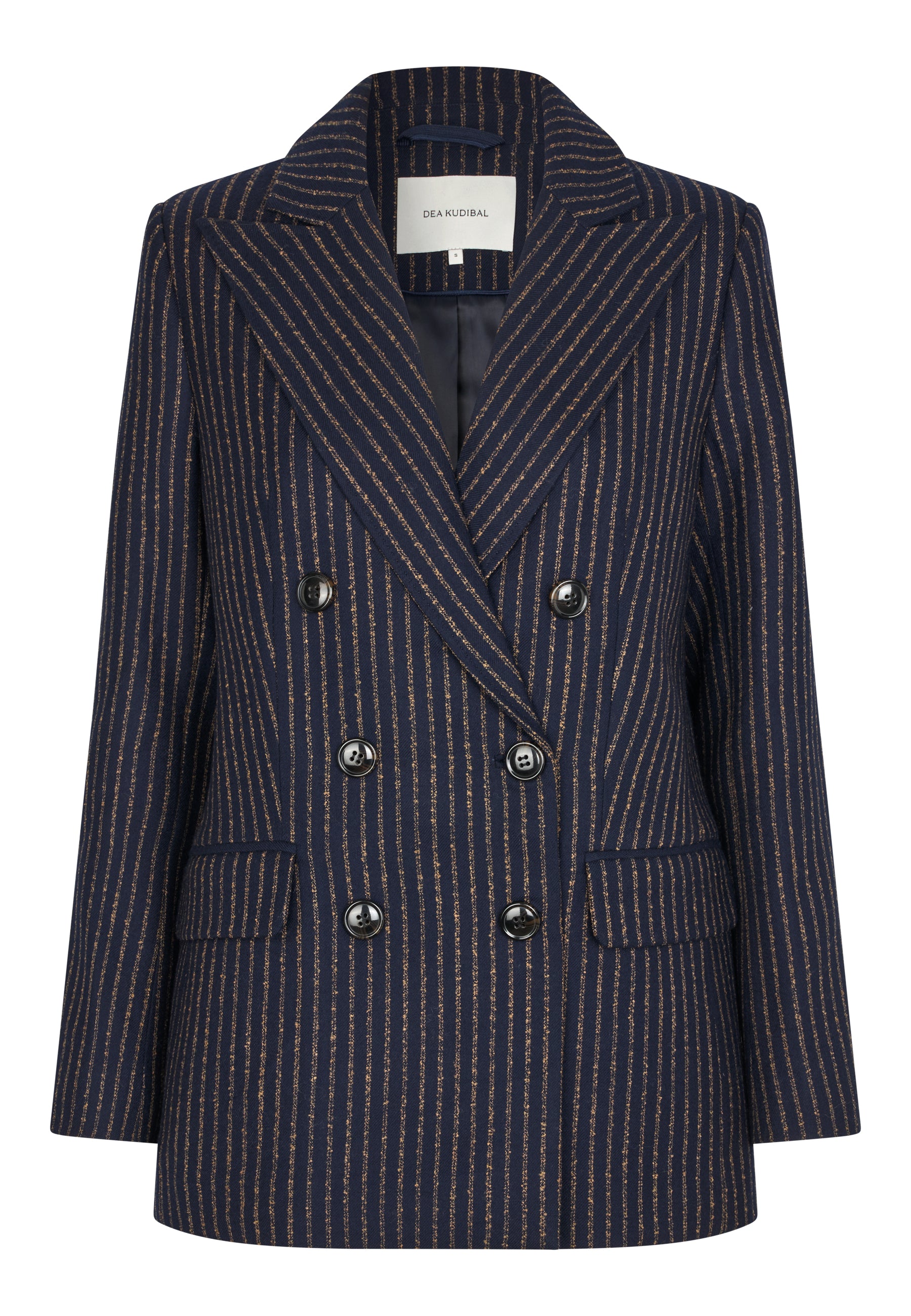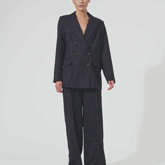 Cool klassisk dobbeltradet mørkeblå blazer med karamelfarvede striber. Blazeren har spidsrevers, lommer med klap og klassiske benknapper.