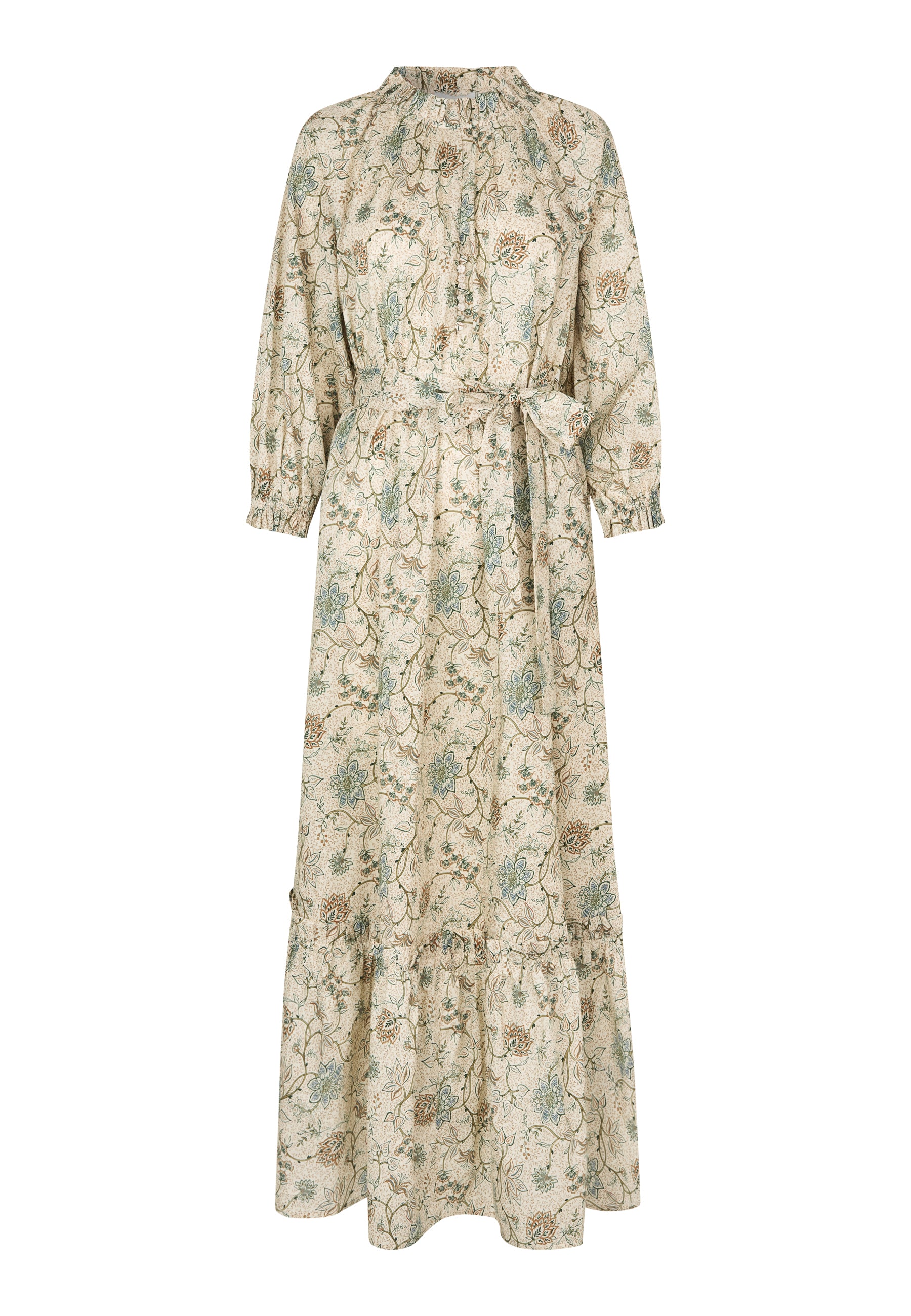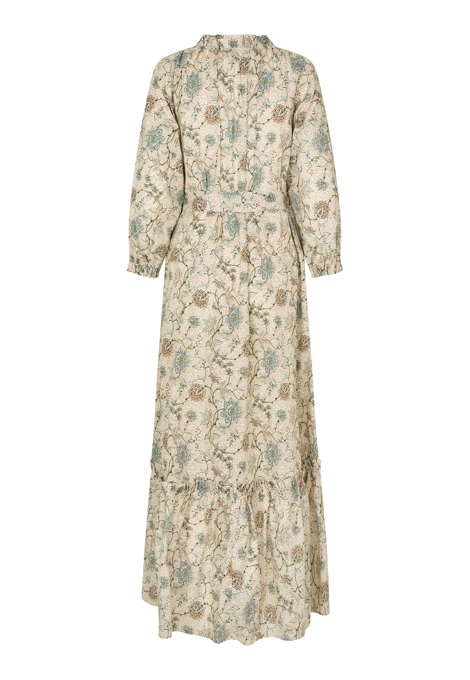 Skøn lang bomuldskjole i et løst look med bred flæsekant nederst. Kjolen i et 70ér inspireret blomsterprint bestående af grønne og gyldne farver på cremefarvet bund,