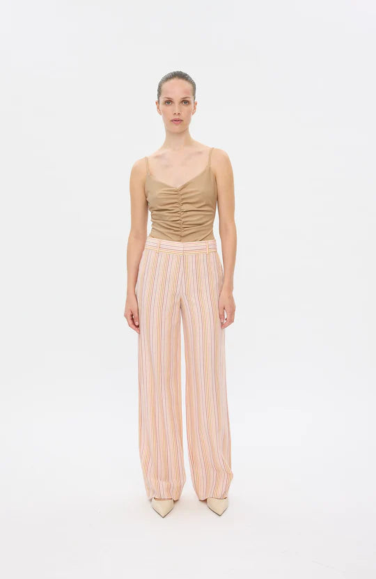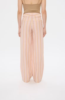 Skønne stribede bukser i et sommerligt "bæk og bølge" materiale. bukserne med bredde lige ben har fine sommer striber i lavendel, rosa, pink og karry på råhvid bund. Materialet er blødt, let og crepet.