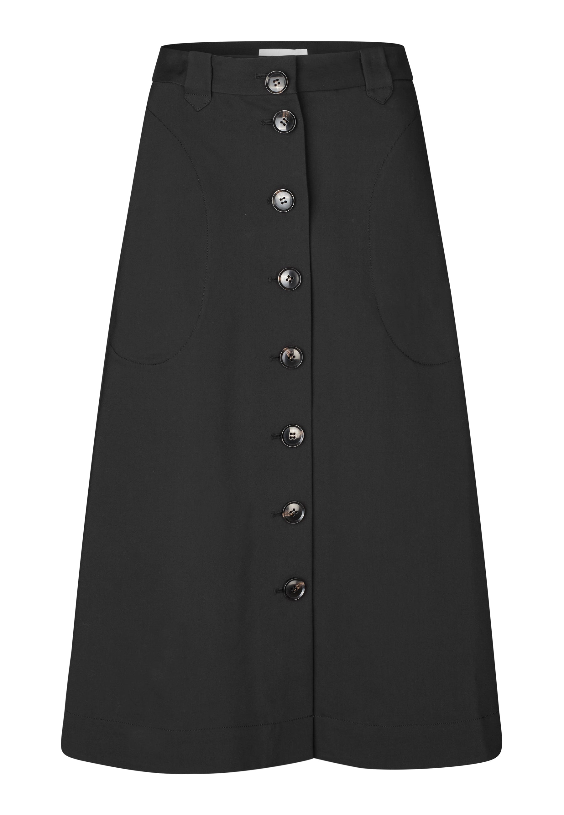 Skøn midi lang nederdel i blød bomulds-blanding med stretch. Nederdelen i et 70ér inspireret look med høj talje og skrålommer er gennemknappet med smukke ben-knapper fortil.