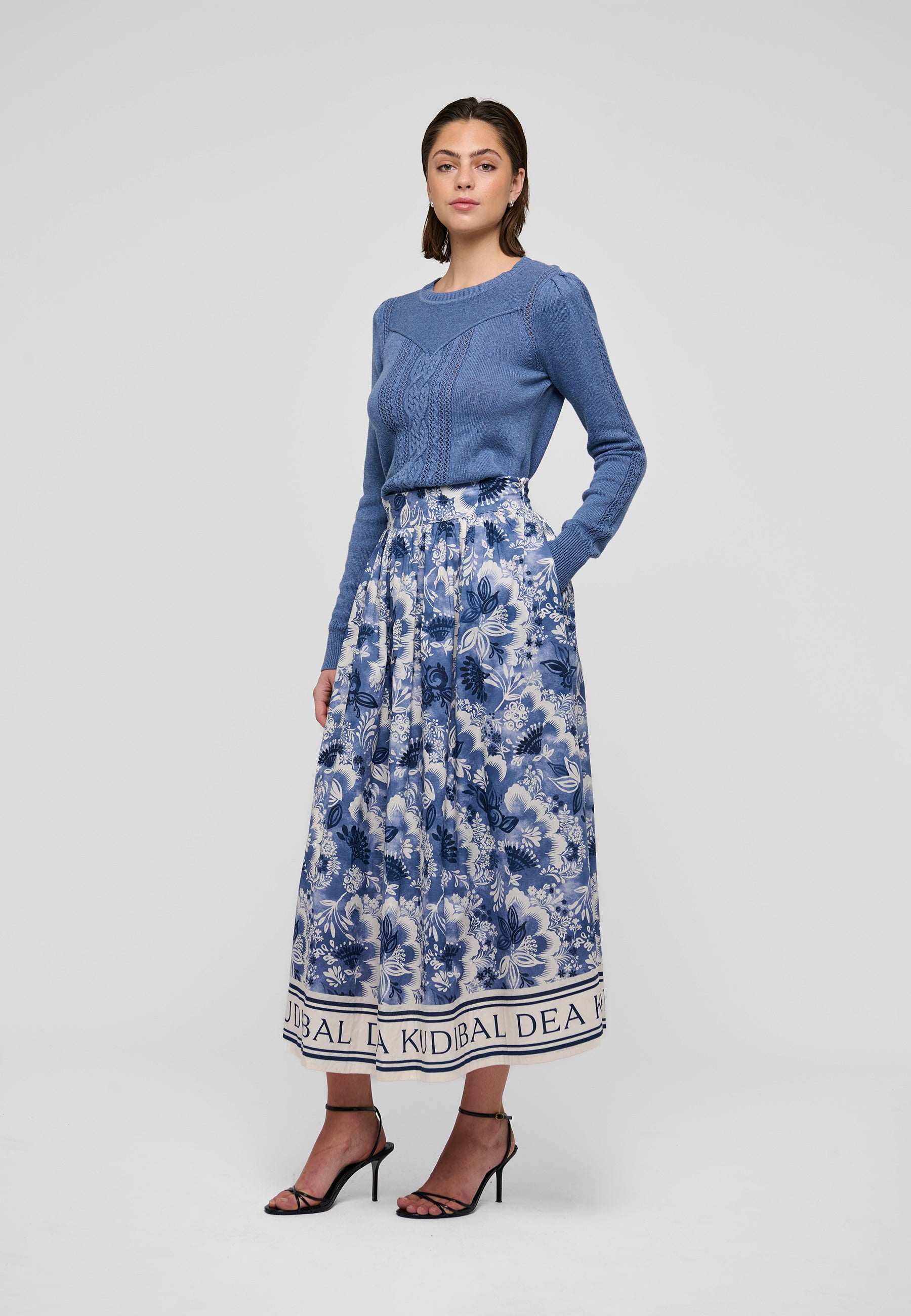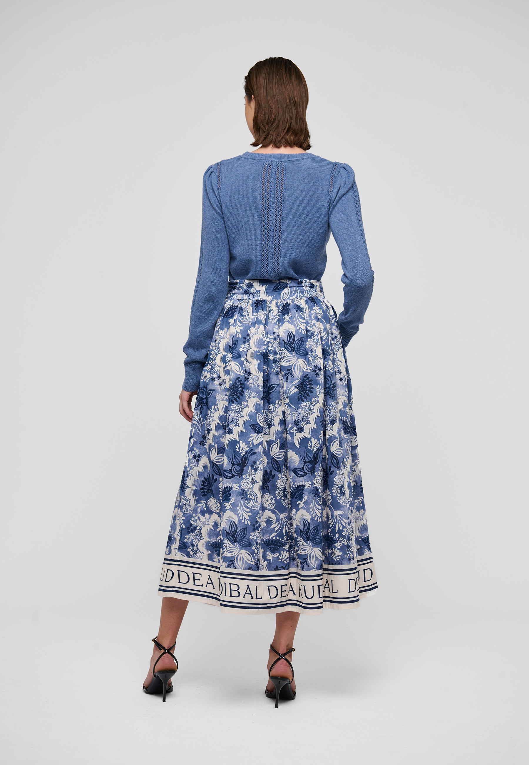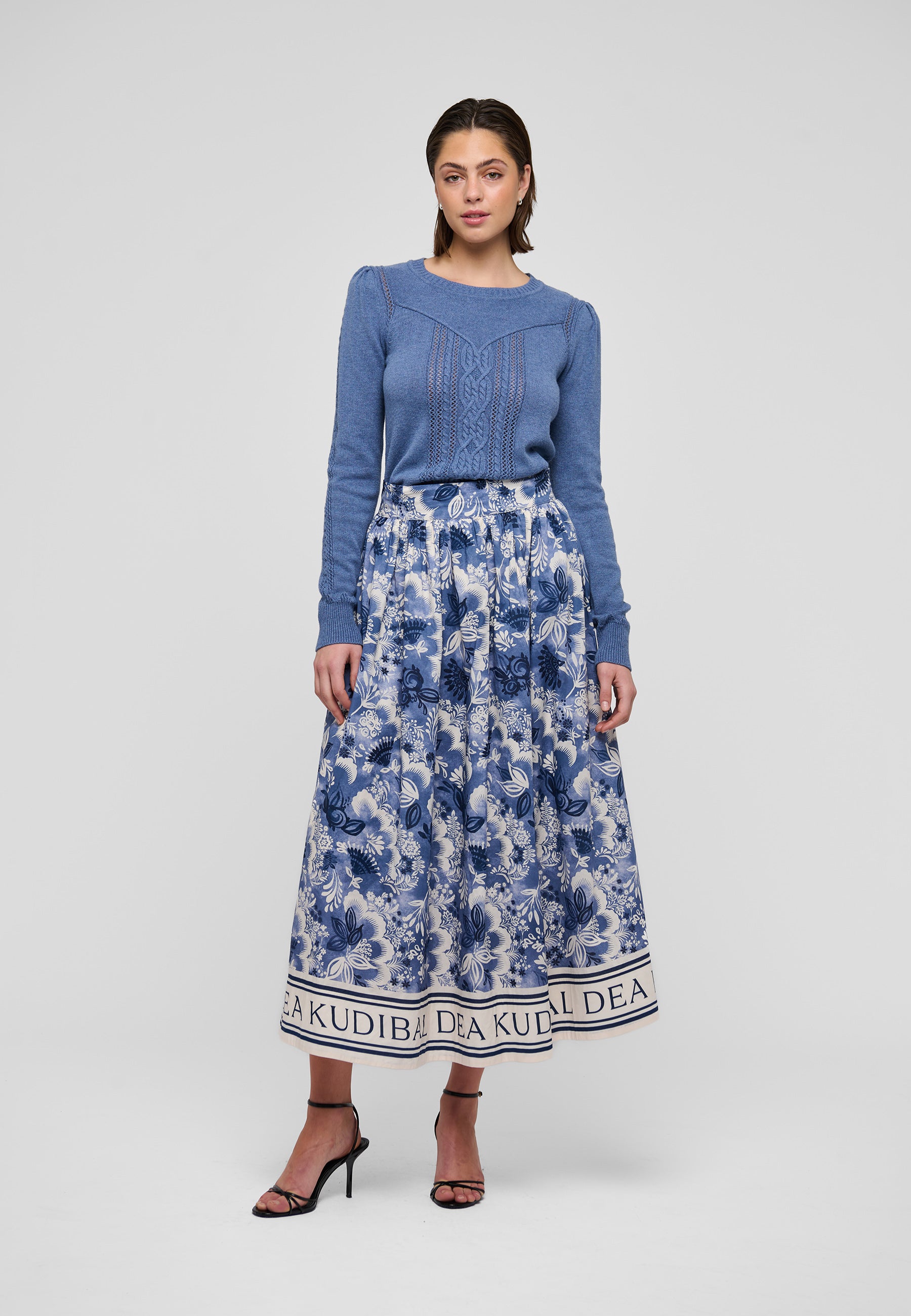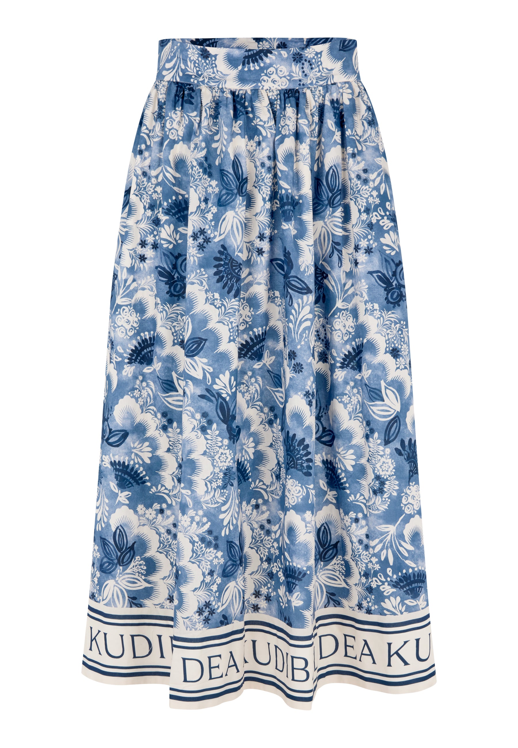 Skøn bomulds nederdel med linning, lommer, masser af vidde samt rynk under linningen. Den lukkes med en diskret lynlås-lukning i siden. Nederdelen er i et skønt abstrakt blomsterprint bestående af hvide og blålige nuancer, nederst har den en bord med logoprint.