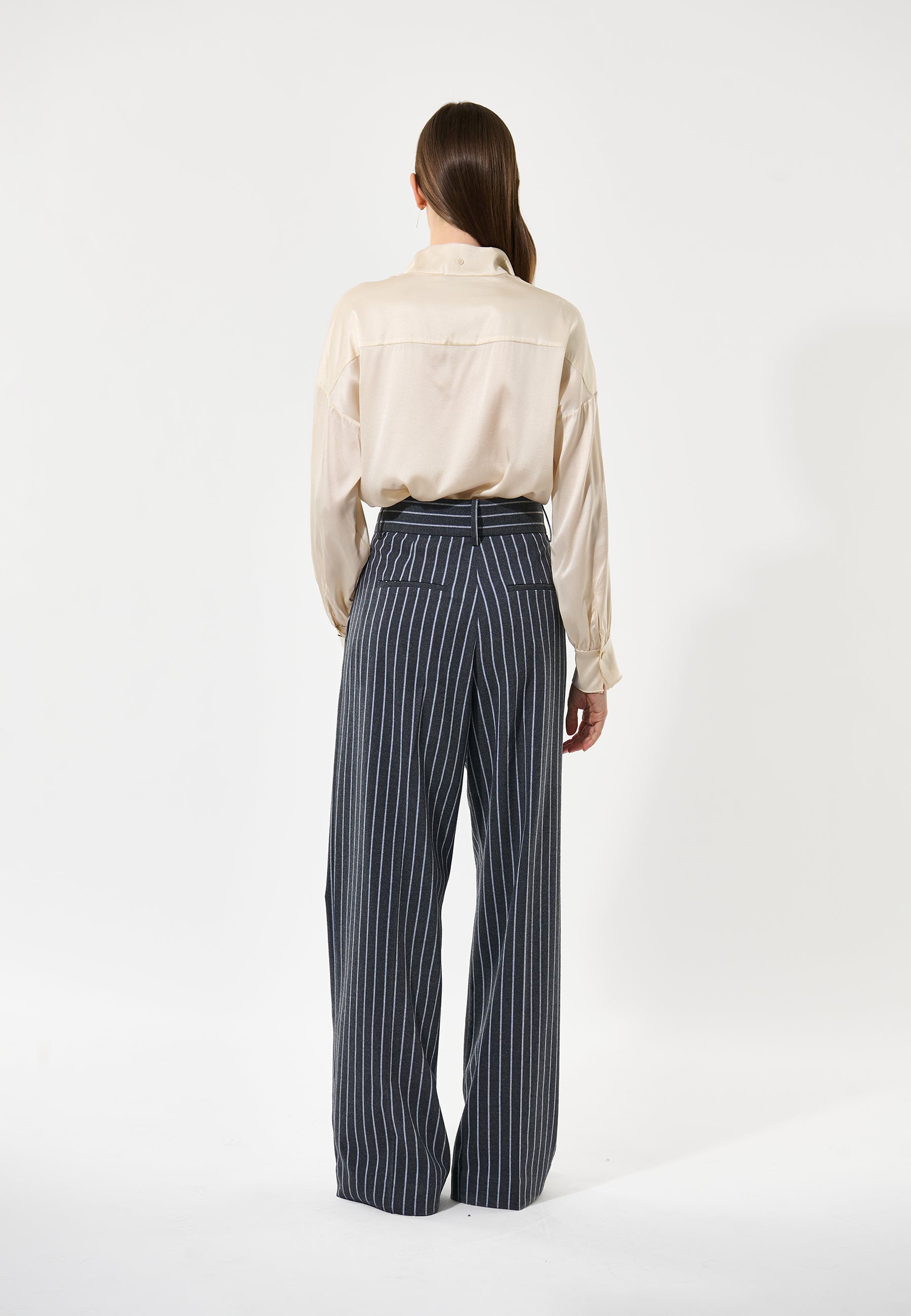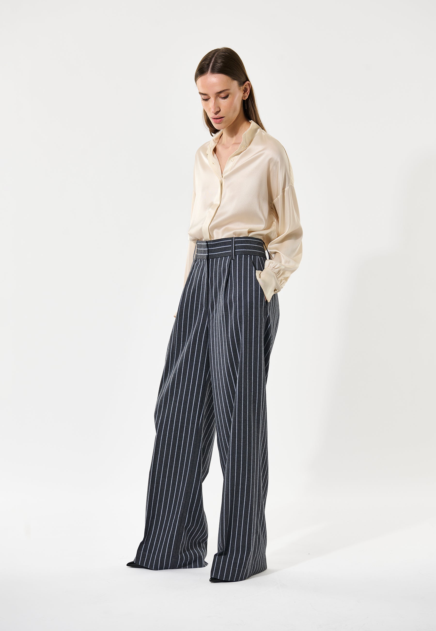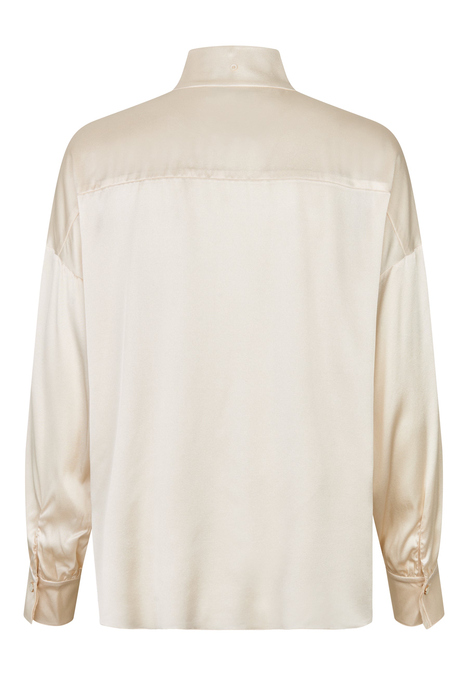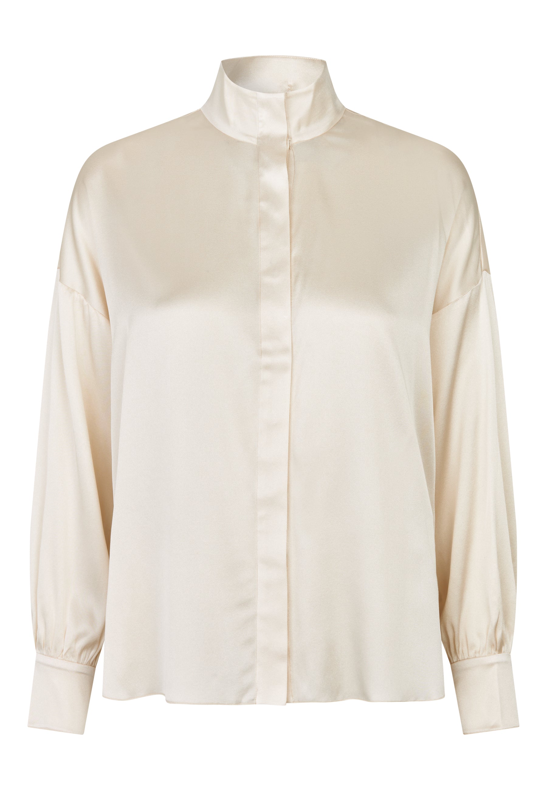 Smuk enkel silkeskjorte med skjult knapluning, høj kinakrave, lav skuldersøm og en fin manchet med dobbelt-lags detalje.