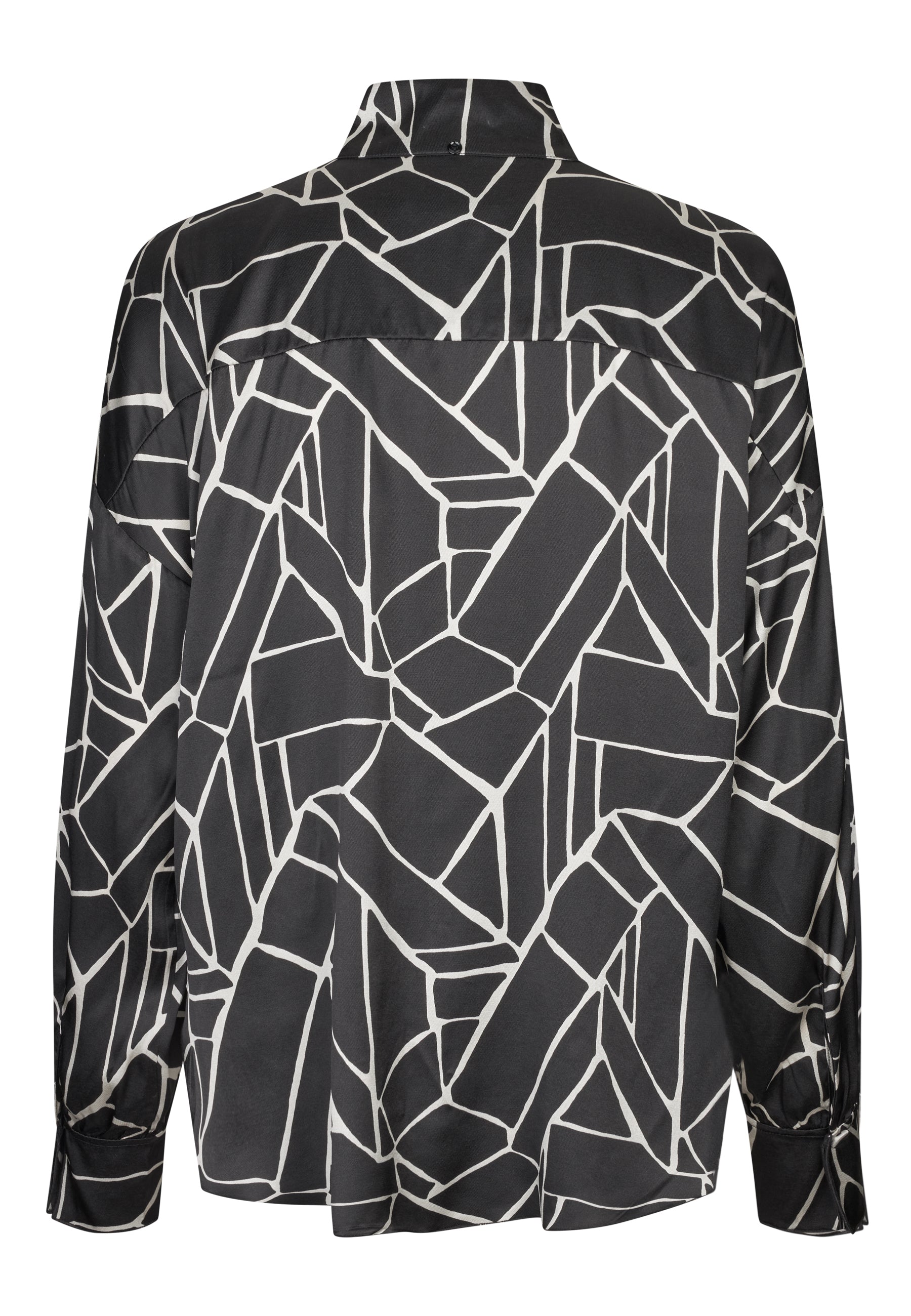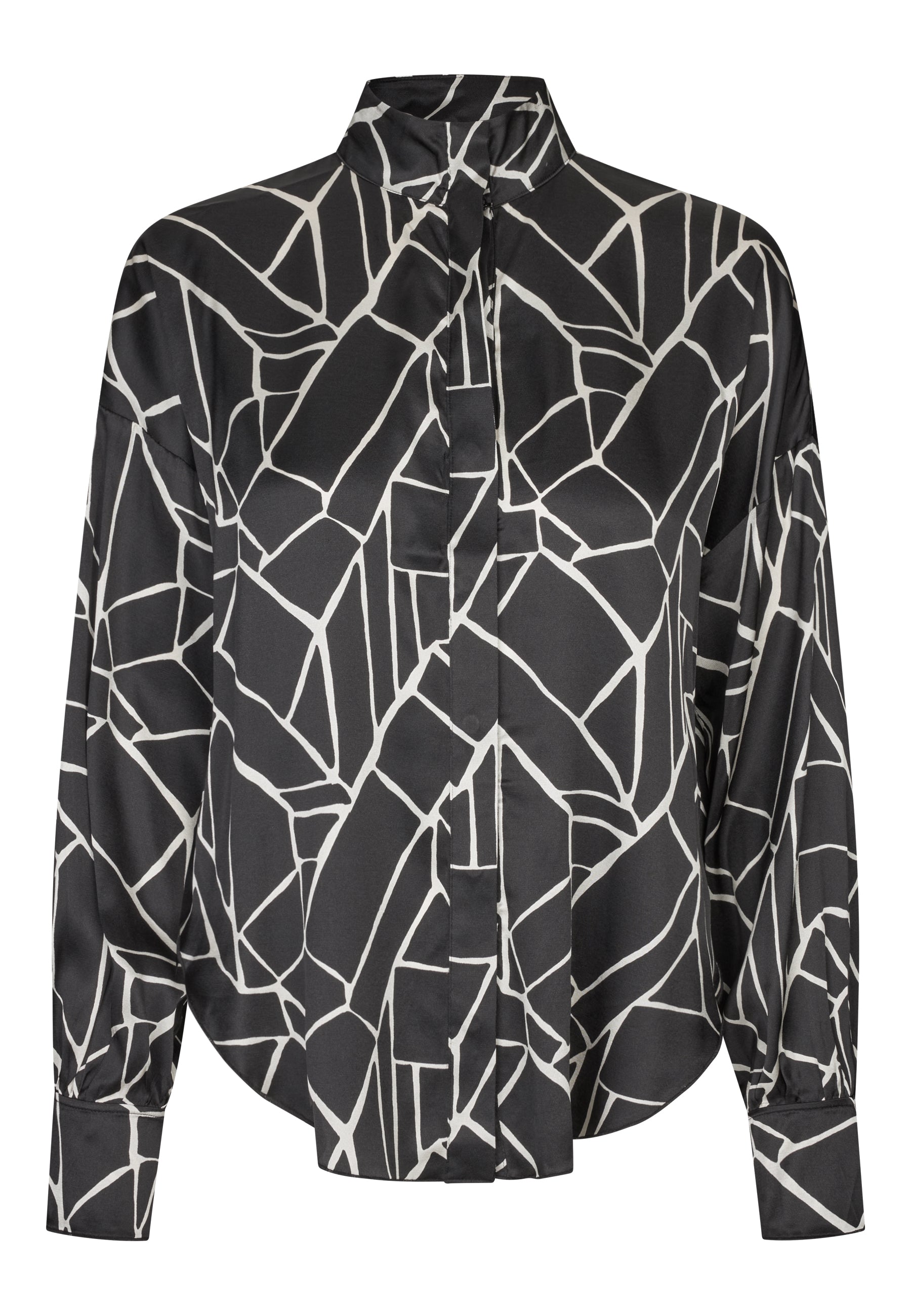 Smuk enkel silkeskjorte med skjult knapluning, høj kinakrave, lav skuldersøm og en fin manchet med dobbelt-lags detalje. Skjorten er i et cool sort/hvid grafisk print.