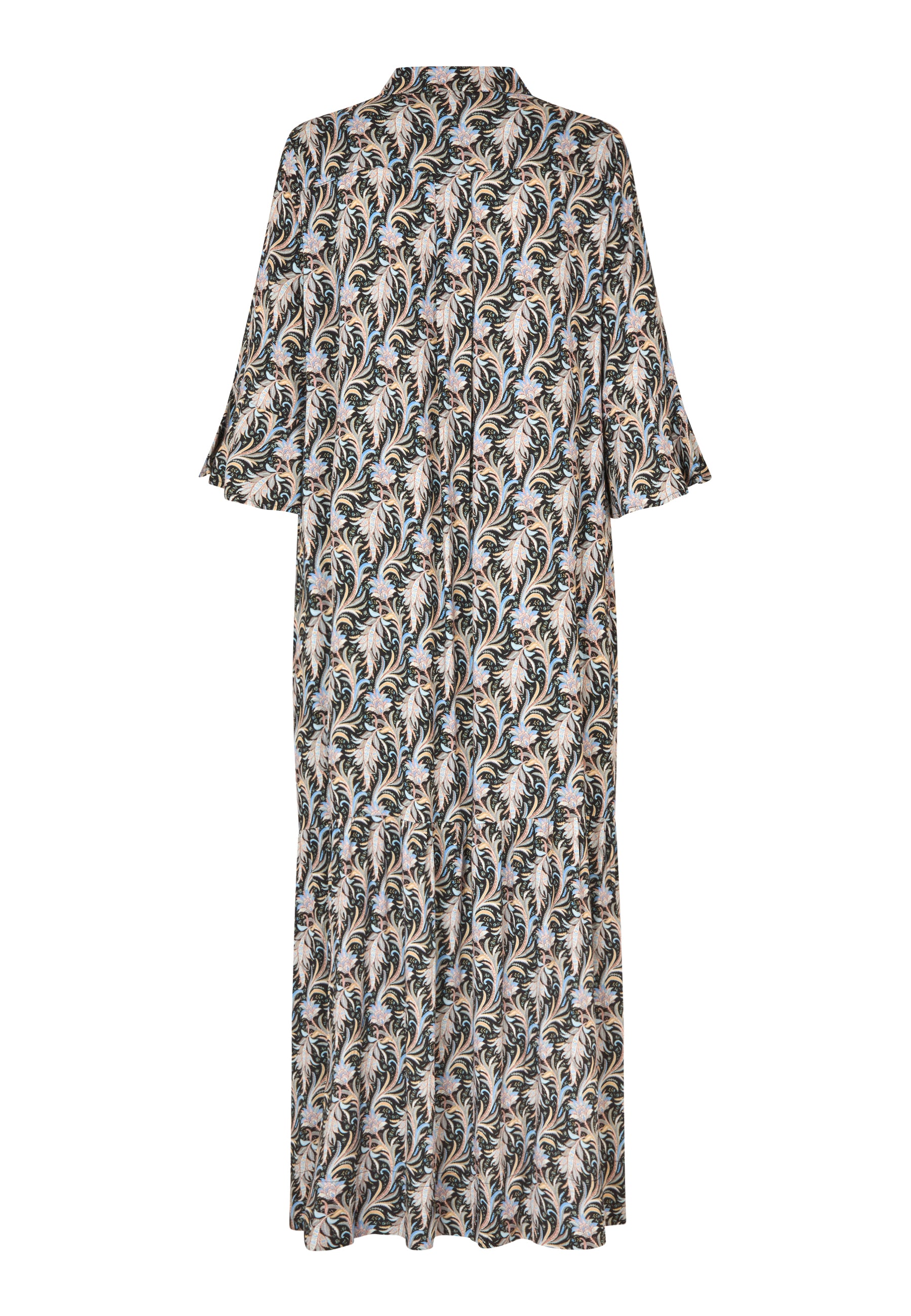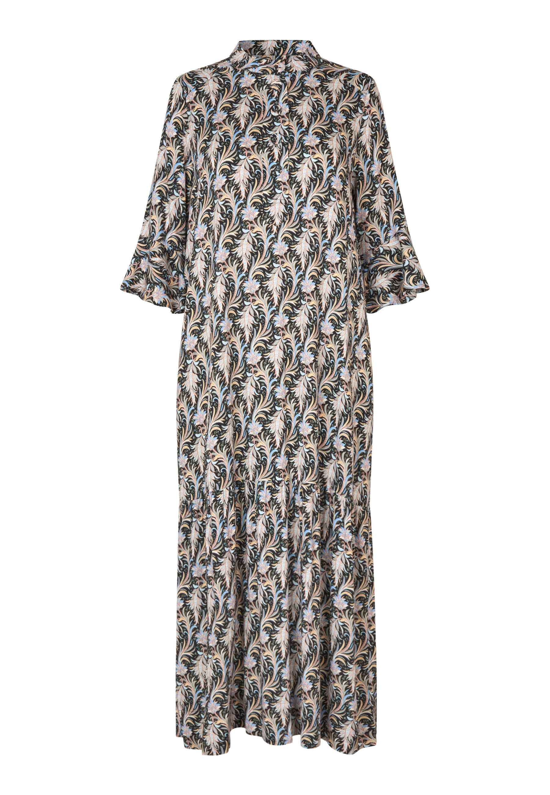 Skøn lang viskose i et smalt look med bred flæsekant nederst. Kjolen har stolpelukning, betrukneknapper, 3/4 ærme med flæsekant, og er i en lækker viscose stretch, med abstrakt blomster print i skønne pastel/gyldne farver