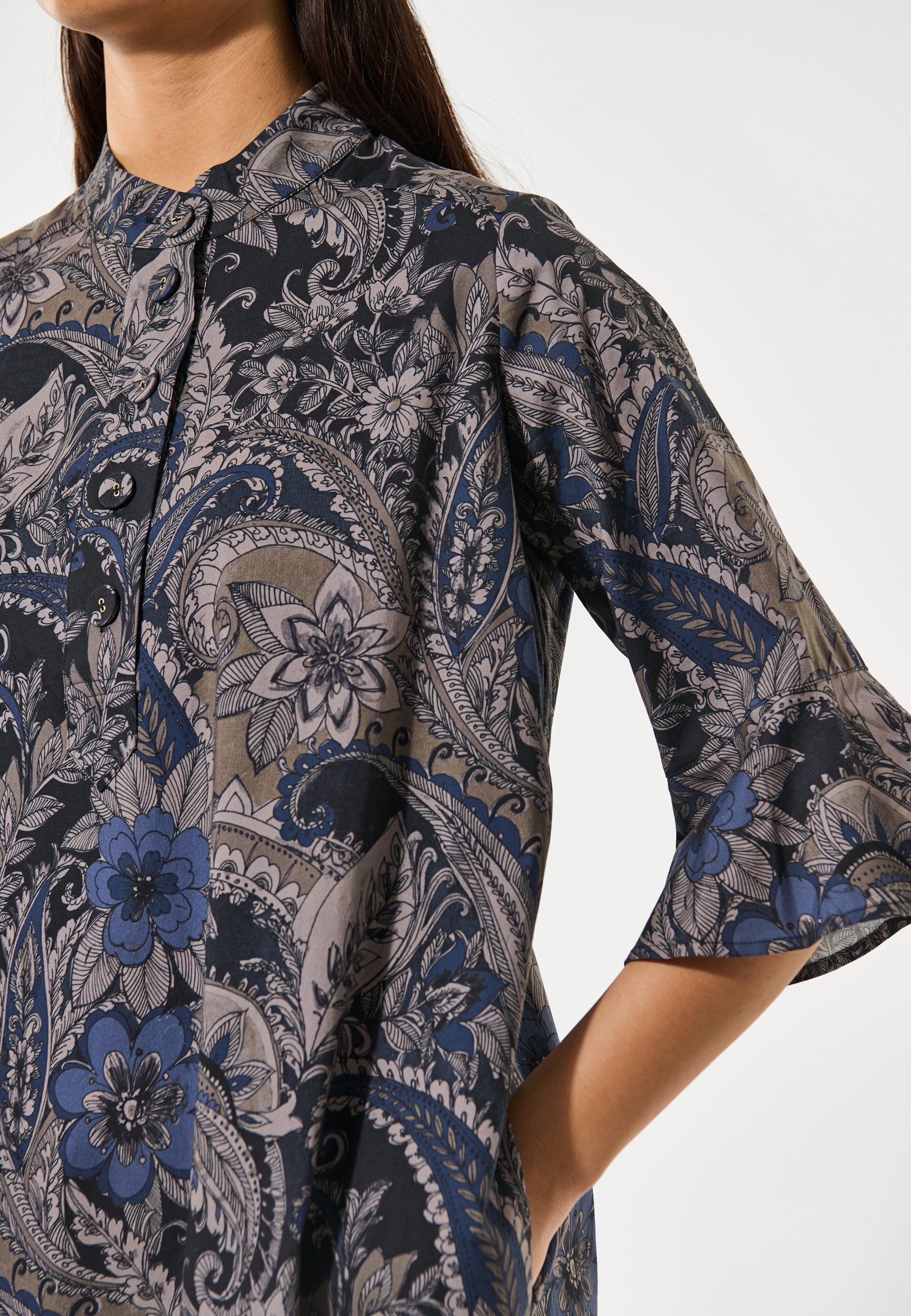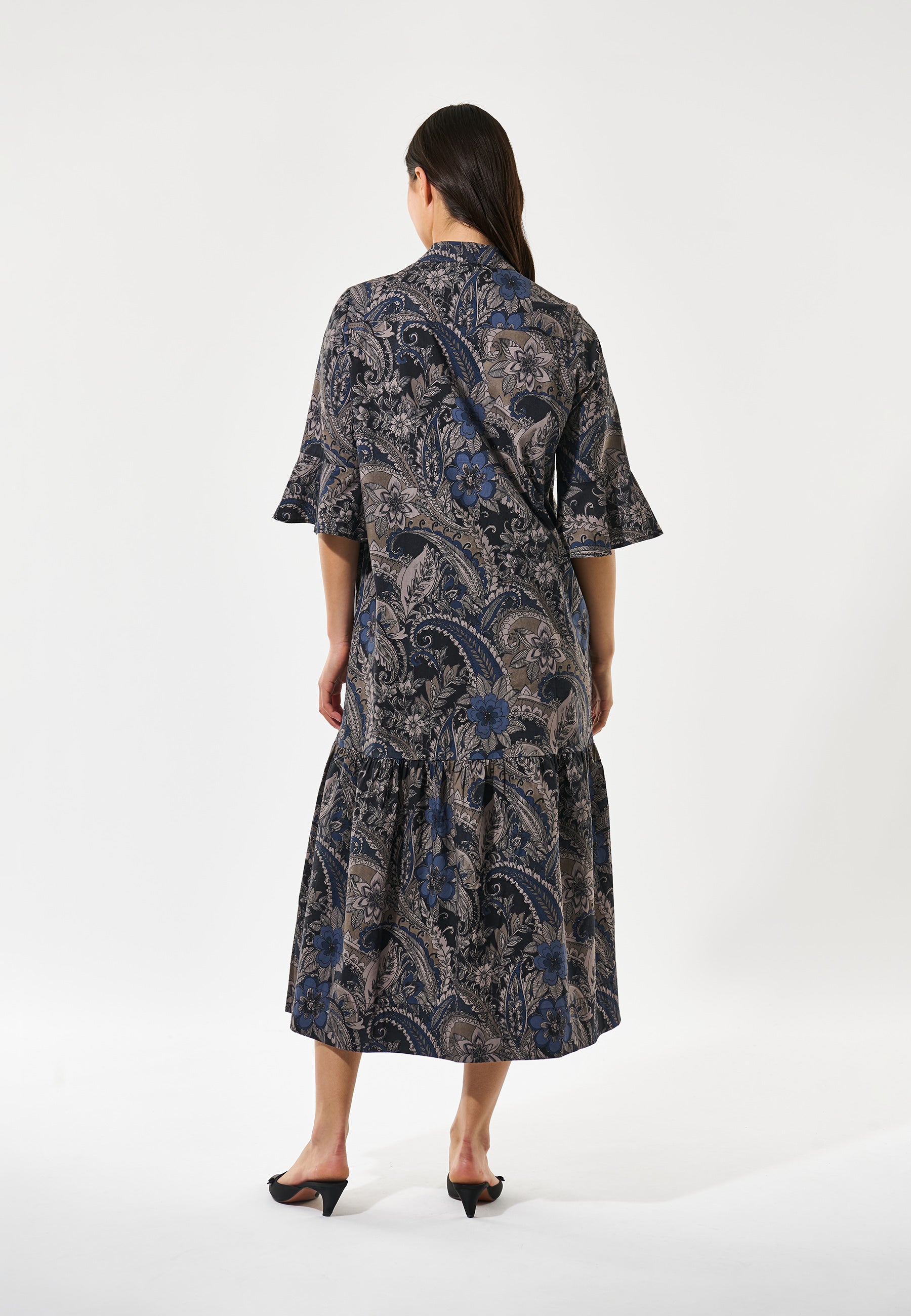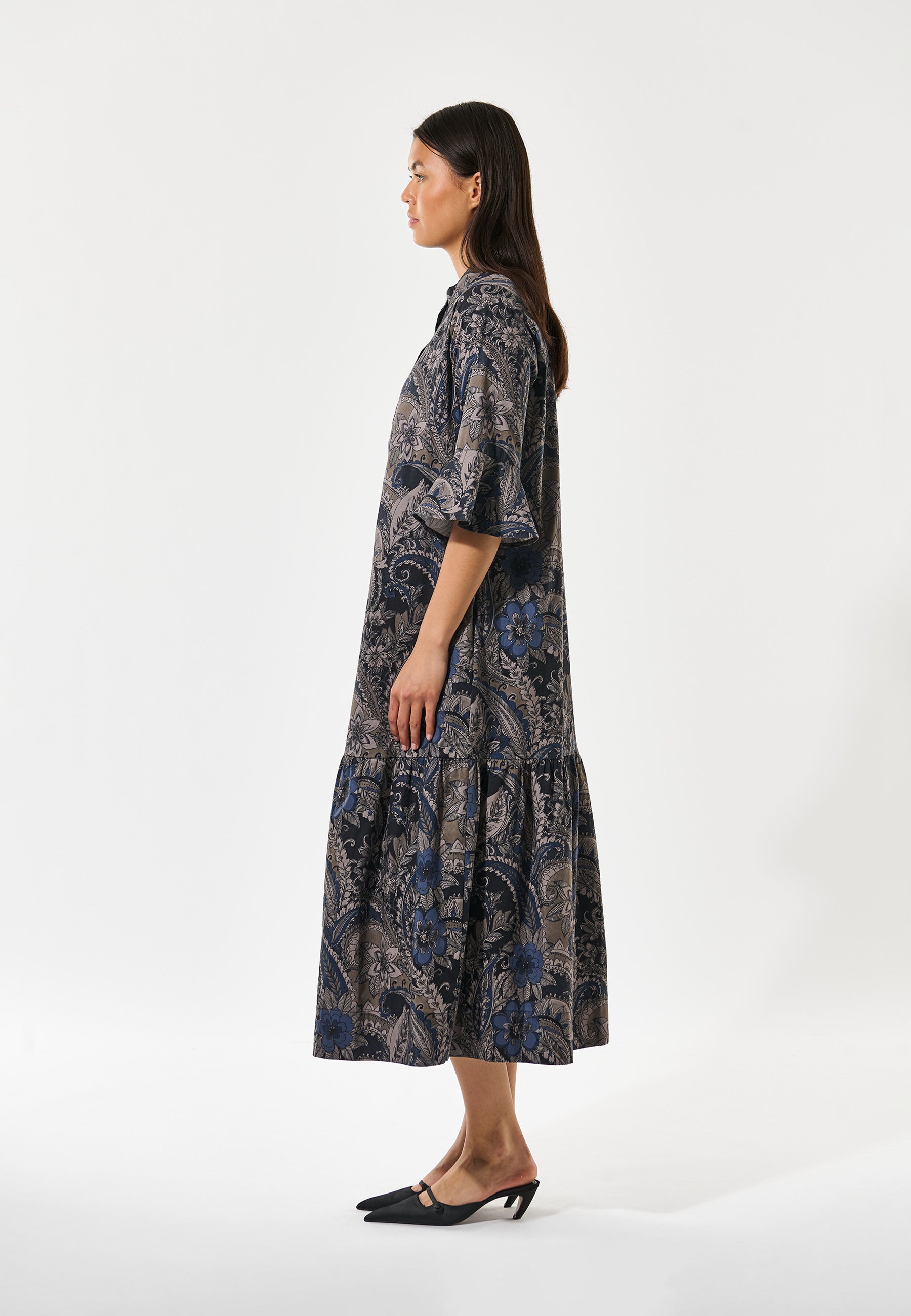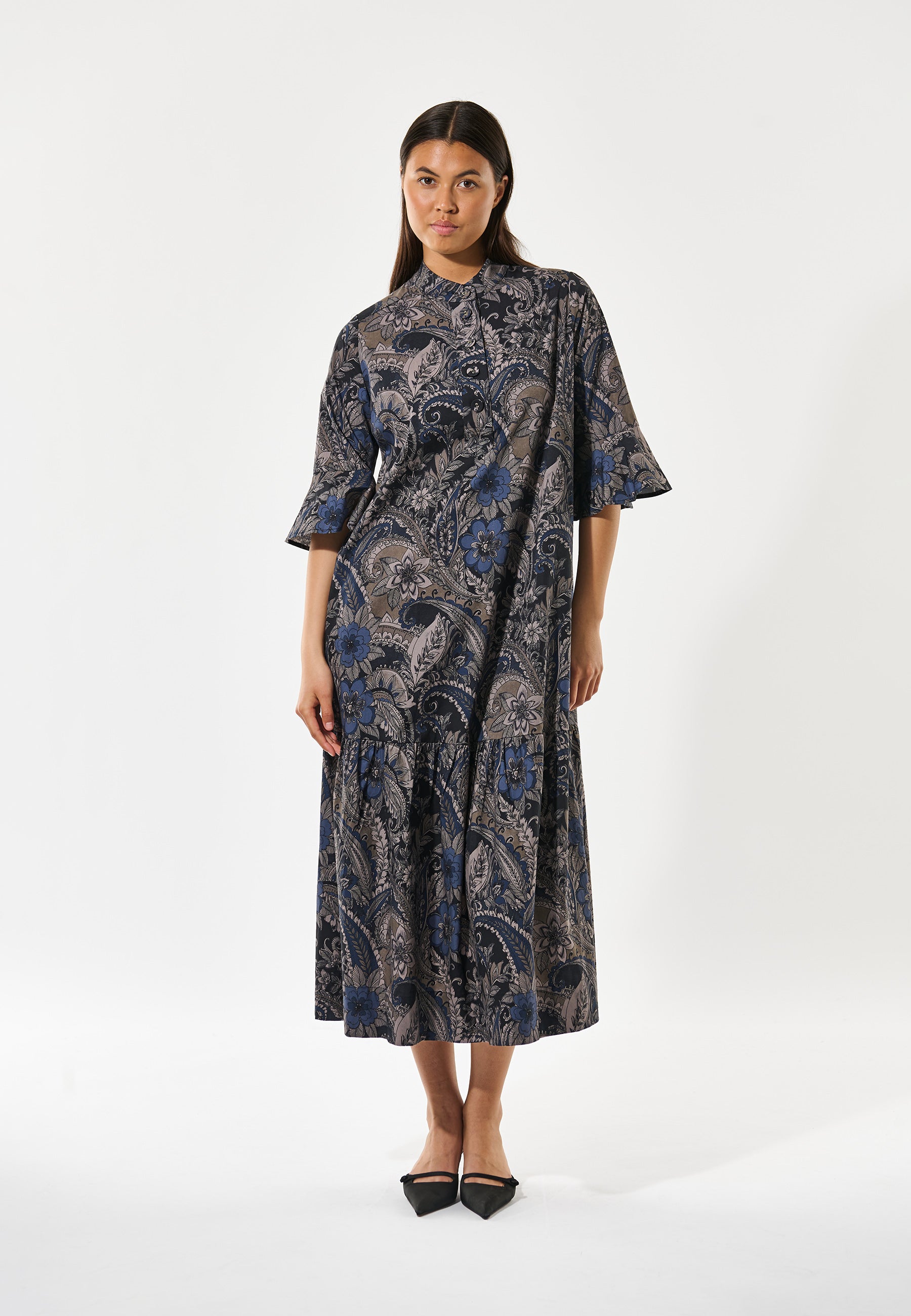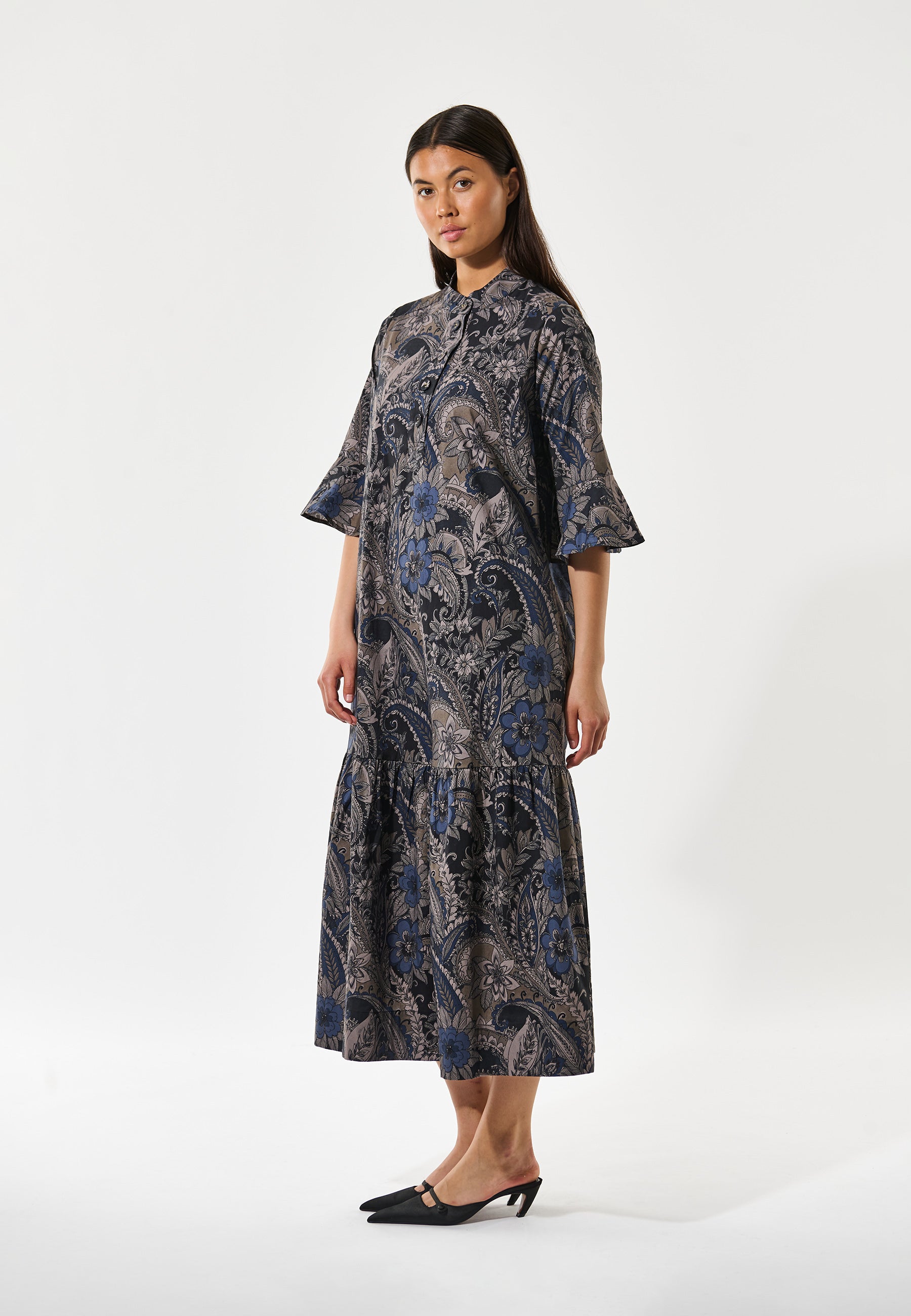 Skøn lang bomuldskjole i et smalt look med bred flæsekant nederst. Kjolen har stolpelukning, store flotte betrukneknapper, 3/4 ærme med flæsekant.