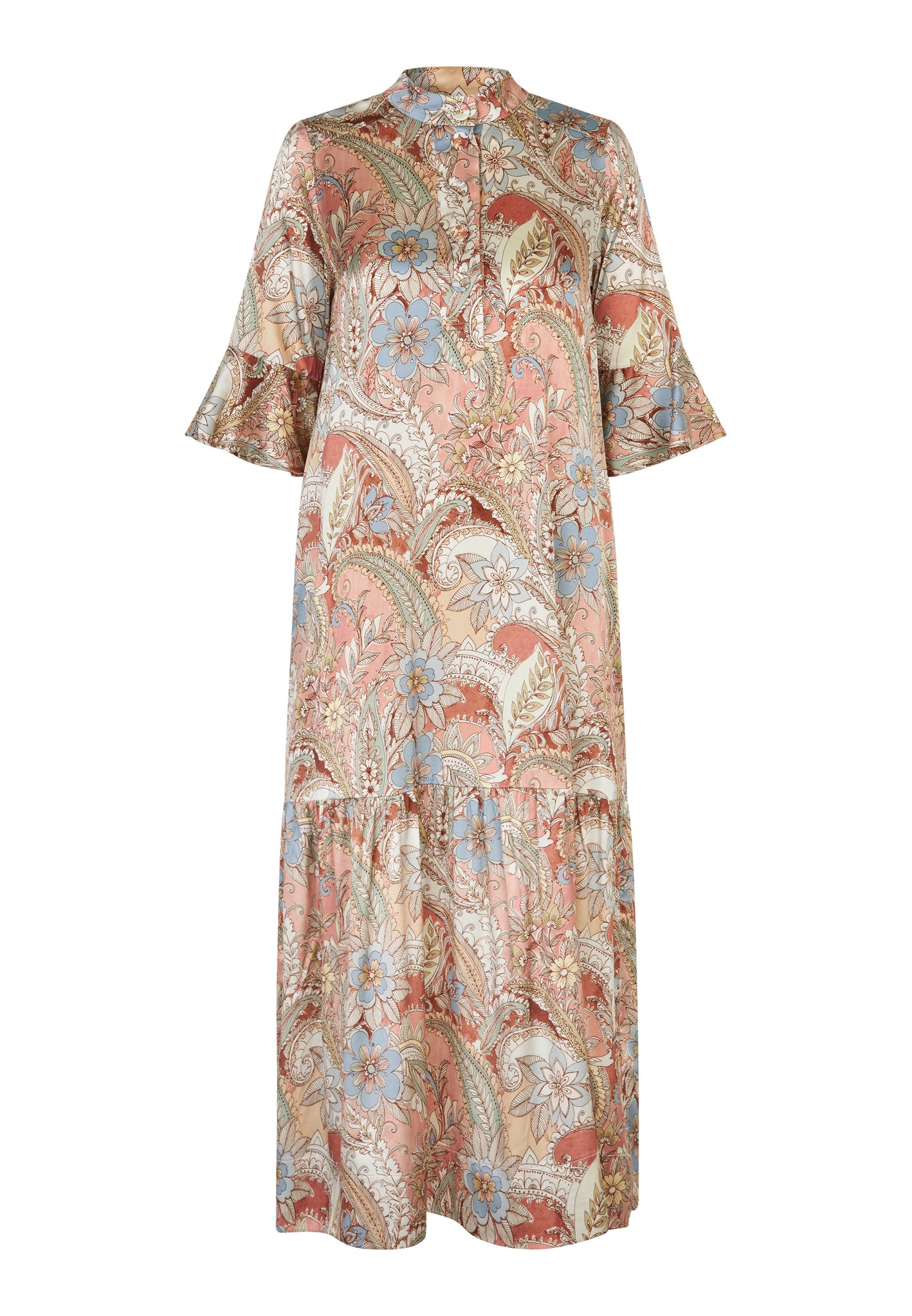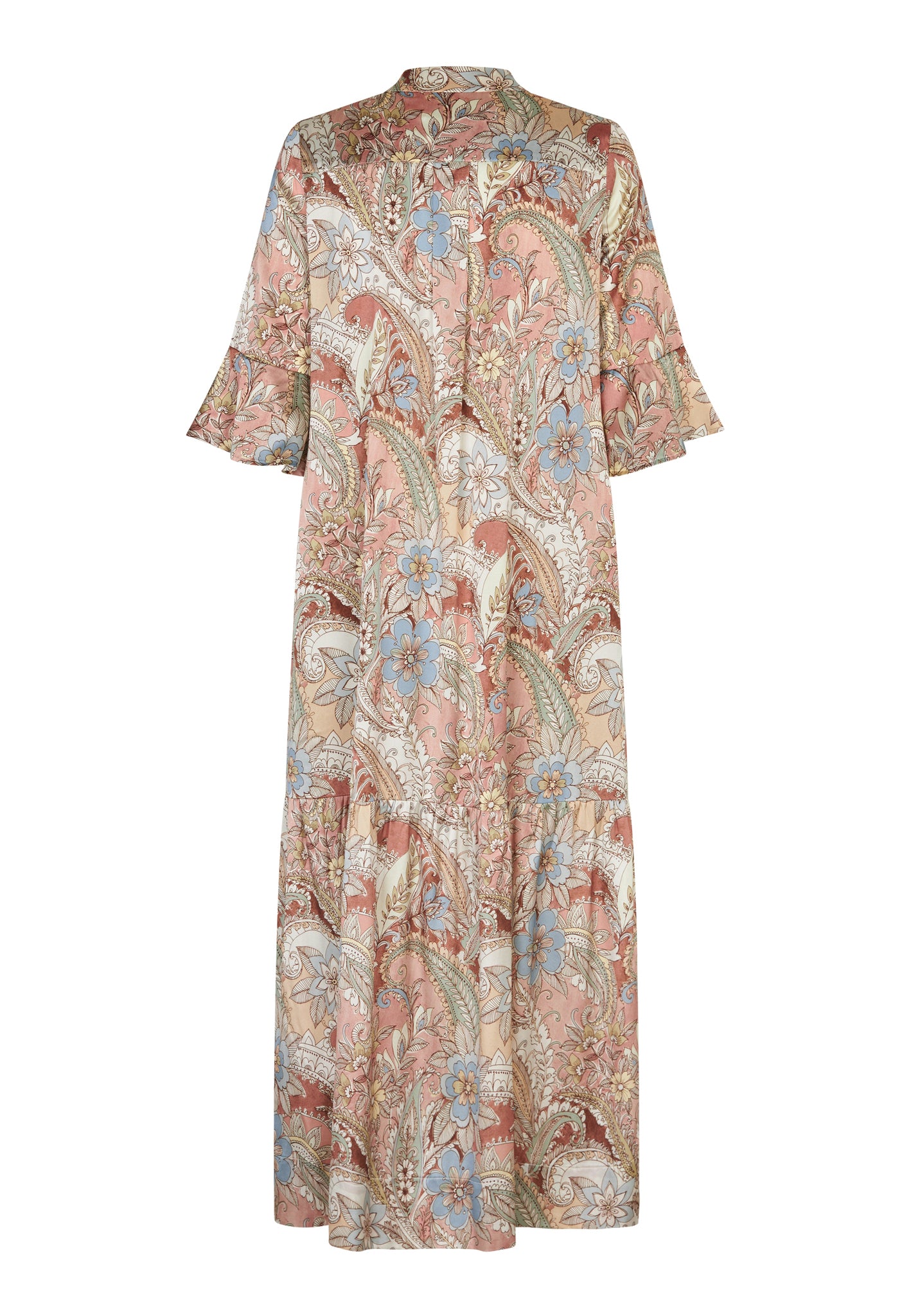 Skøn lang silkekjole i et smalt look med bred flæsekant nederst.  Kjolen stolpelukning, store flotte betrukneknapper, 3/4 ærme med flæsekant.