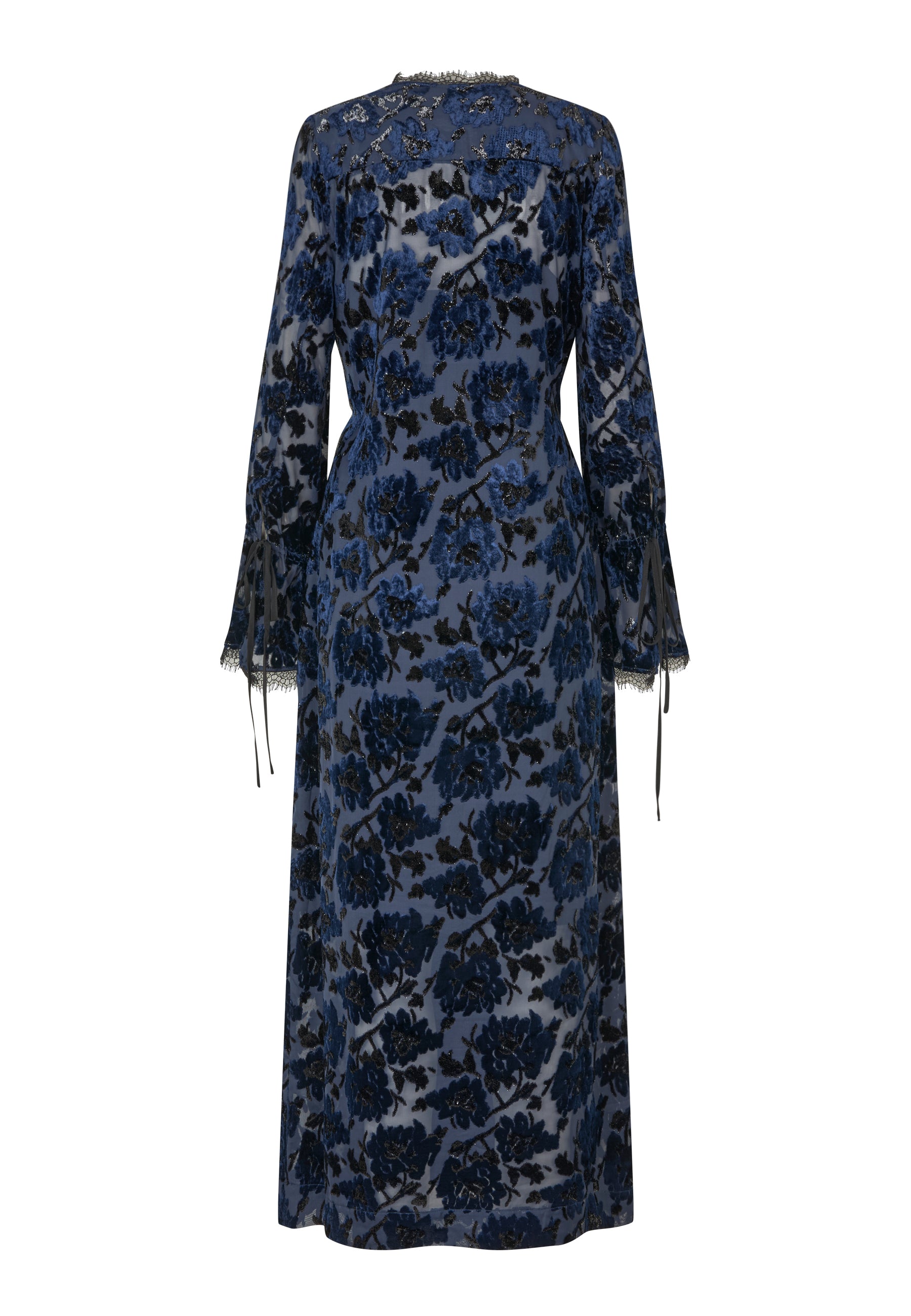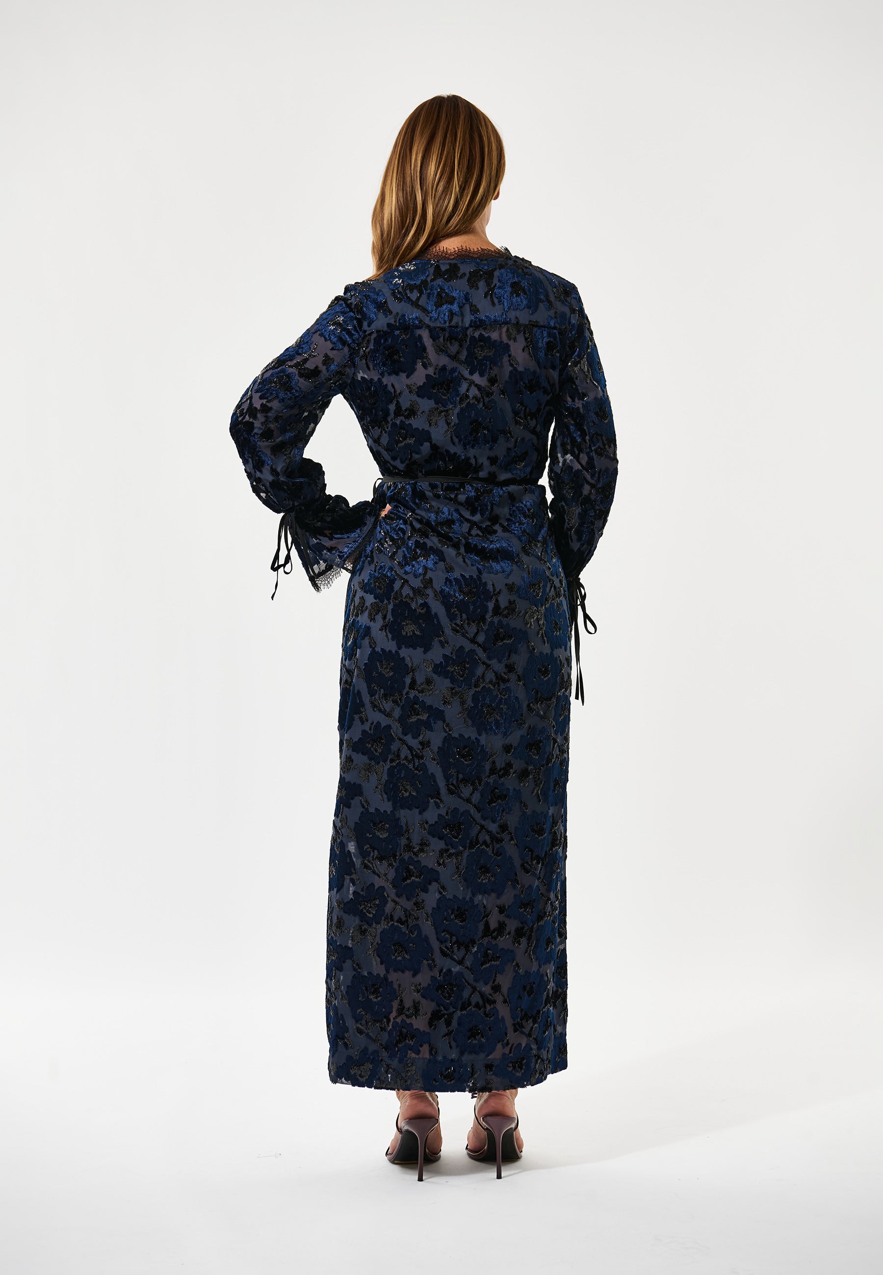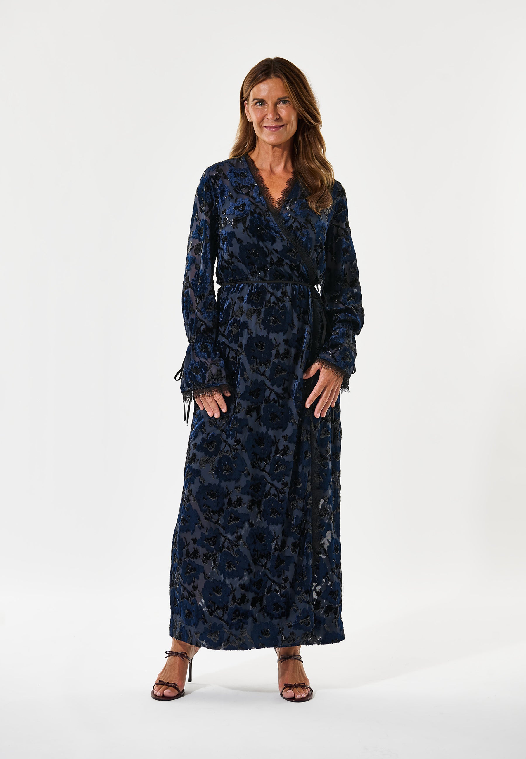 Smuk lang slå-om kjole burn-out silkevelour. Kjolen har en bred manchet som falder ud over hånden, og fin blondedetalje i halsudskæring og på manchet.
