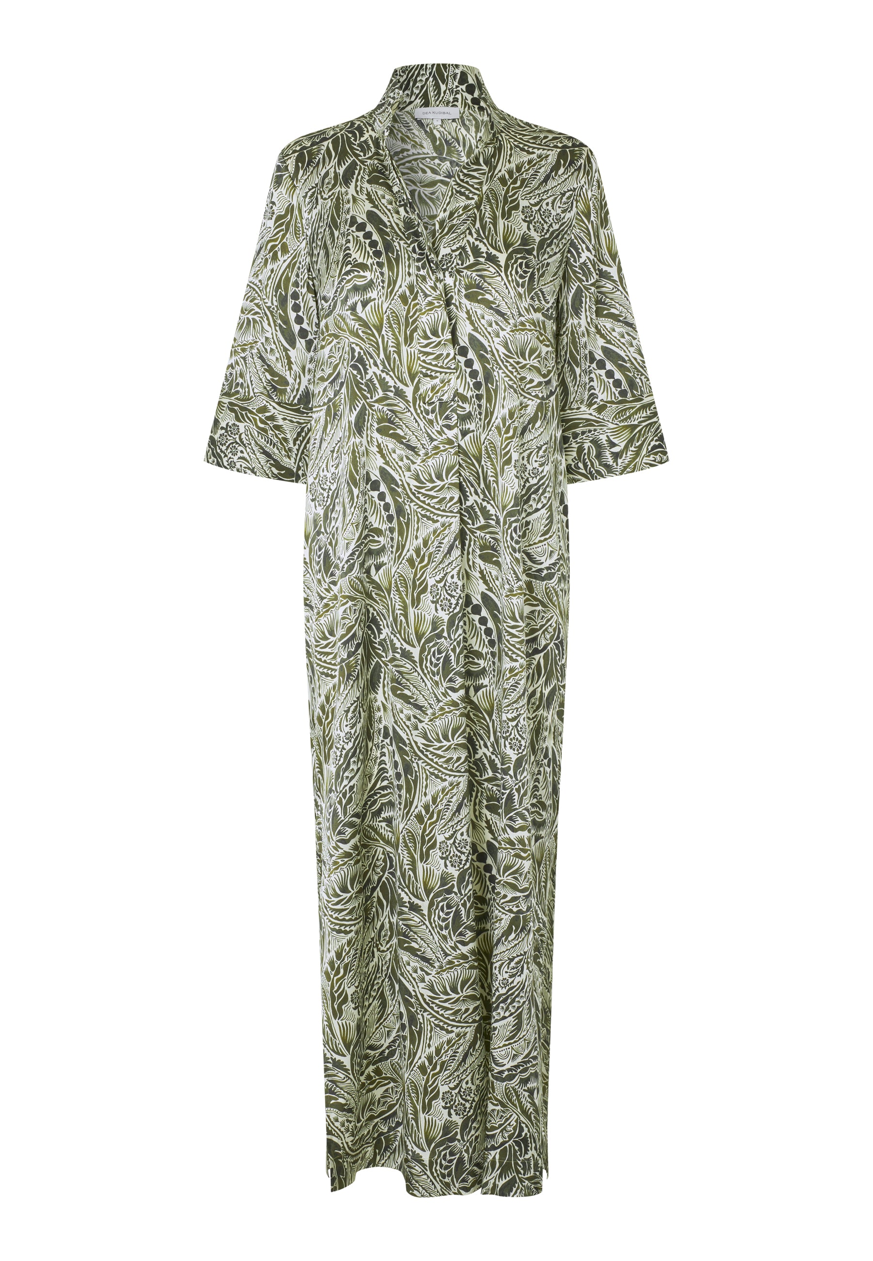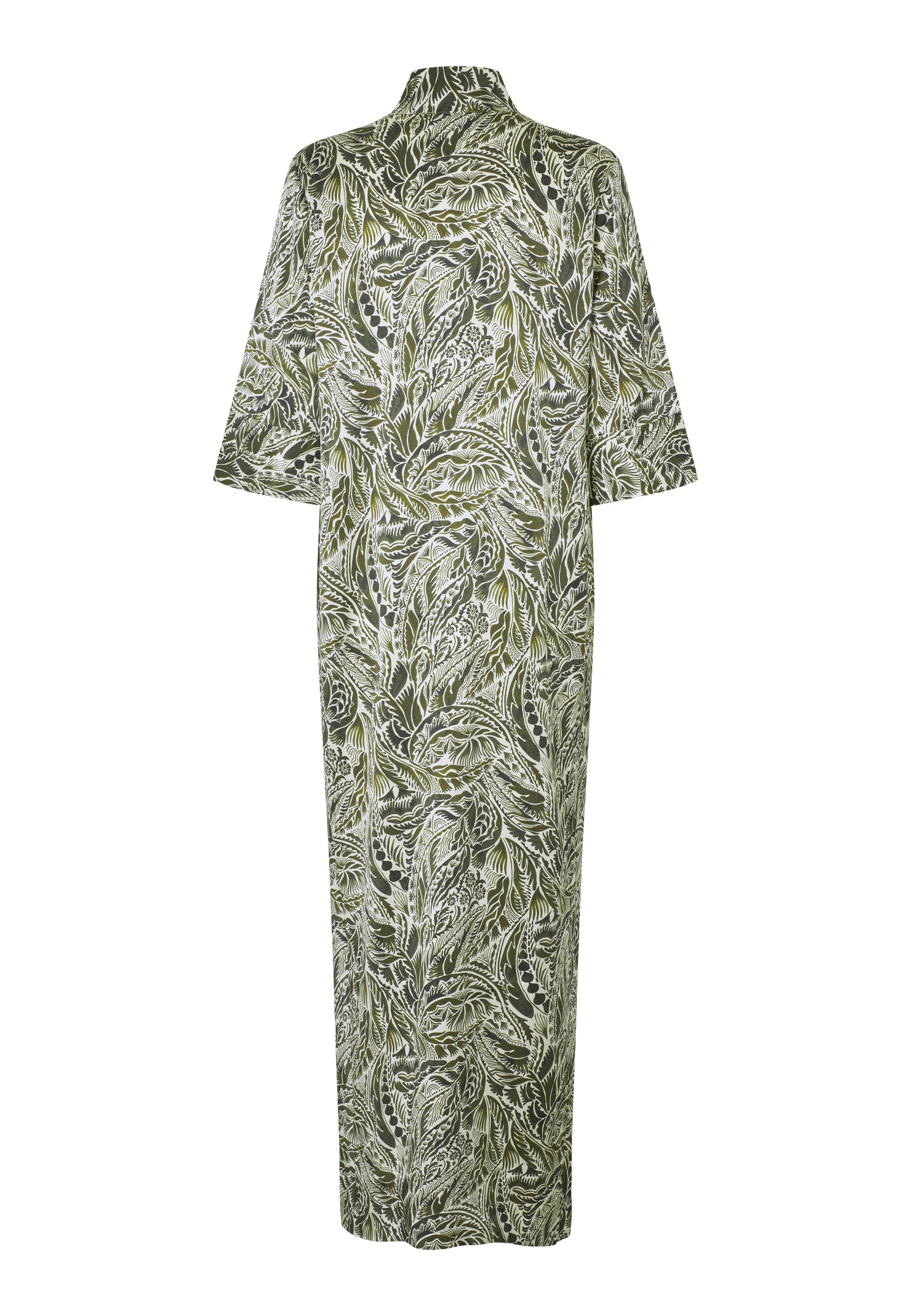 Smuk Lang silke tunikakjole i smukt print. Kjolen har stolpelukning, kinakrave og 3/4 ærmer med bred manchet, og er i et skønt eventyrligt tangplante-print bestånde af mørkegrønne nuancer på en cremefarvet bund.
