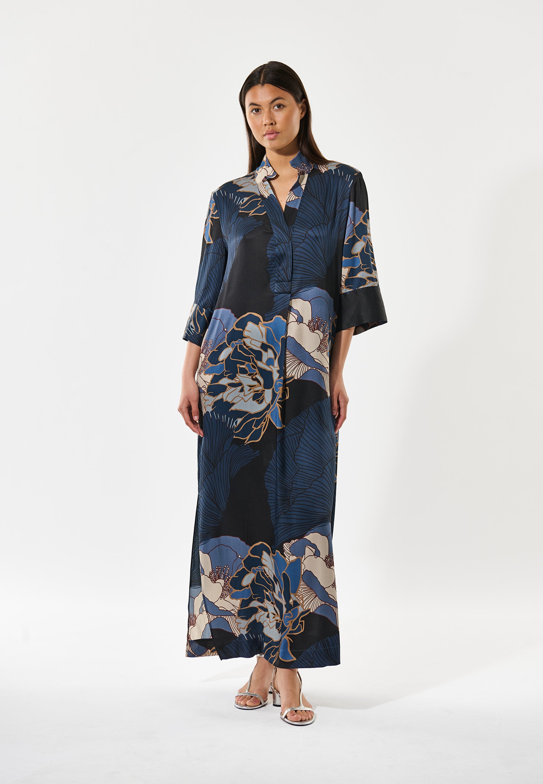 Smuk Lang silke tunikakjole i et cool. Kjolen har stolpelukning, kinakrave og 3/4 ærmer med bred manchet, og er i et skønt eventyrligt tangplante-print bestånde af mørkegrønne nuancer på en cremefarvet bund.