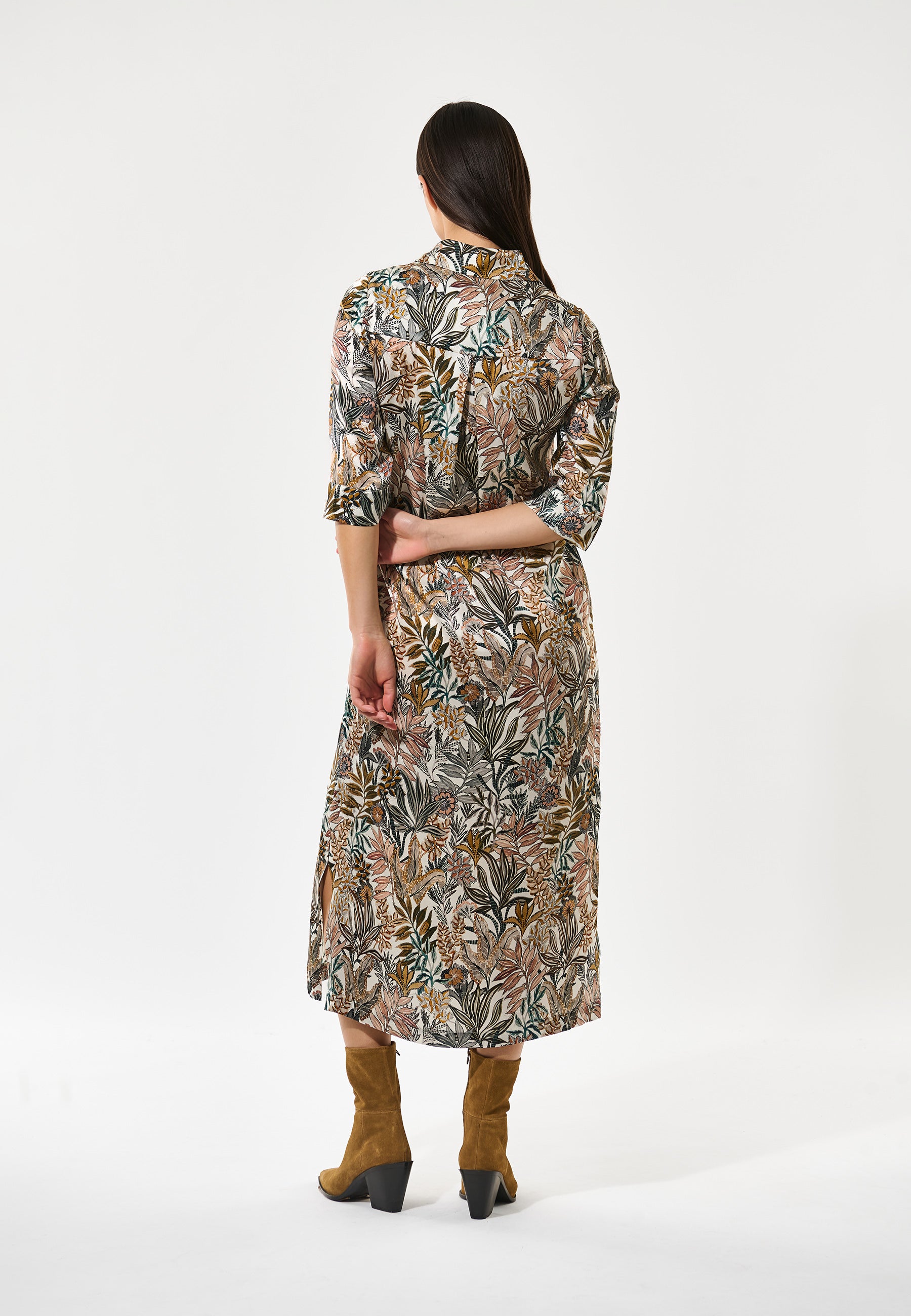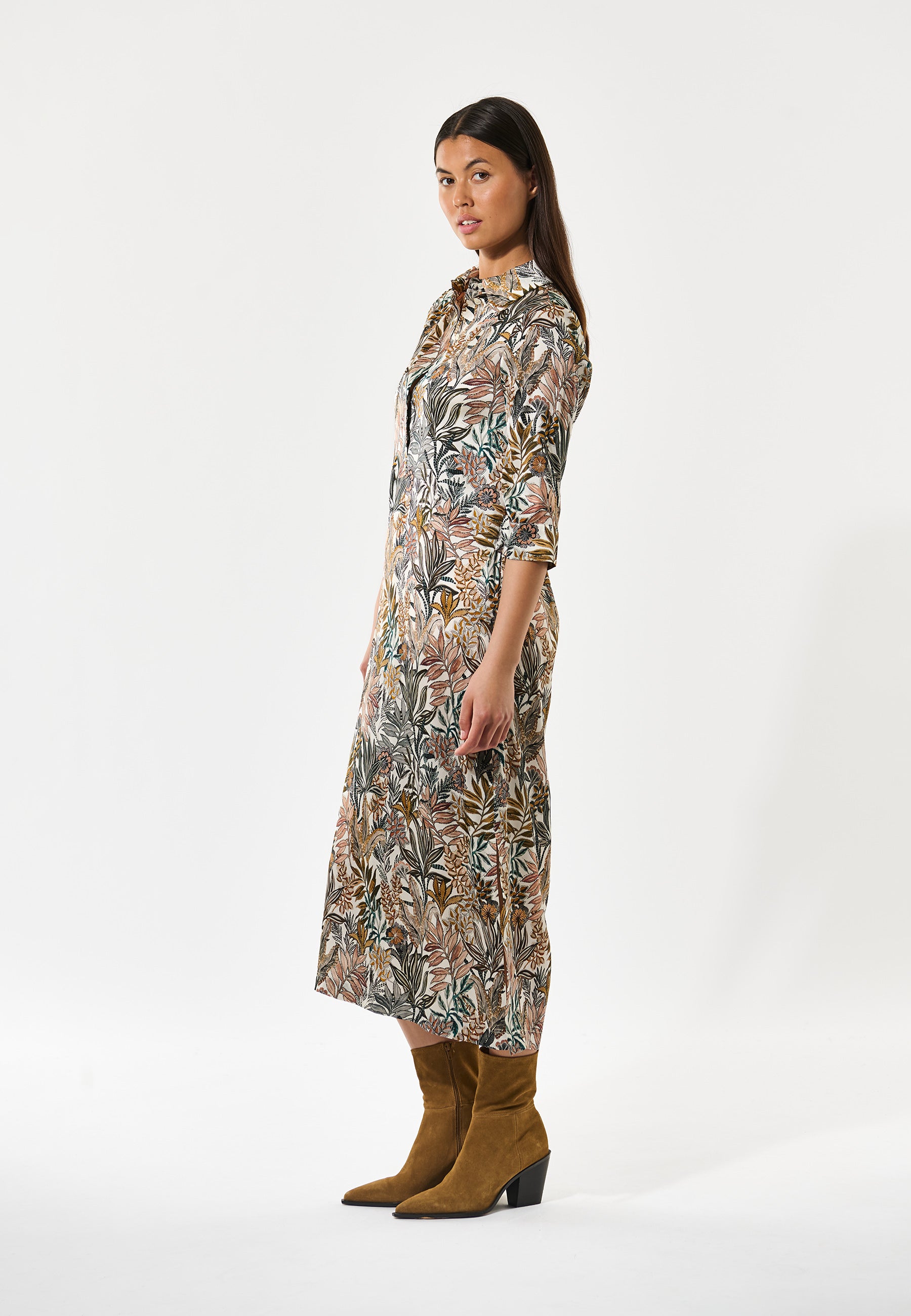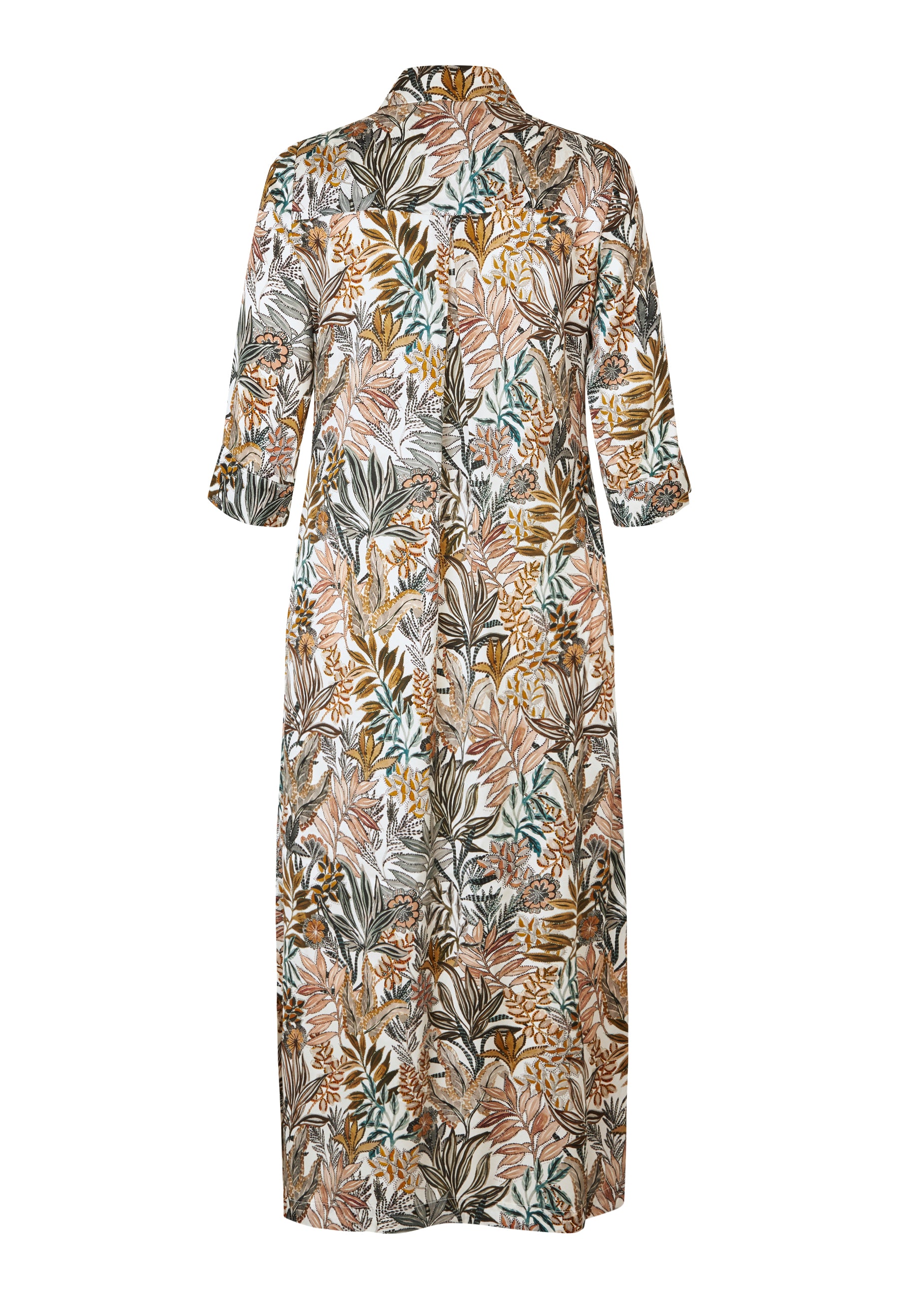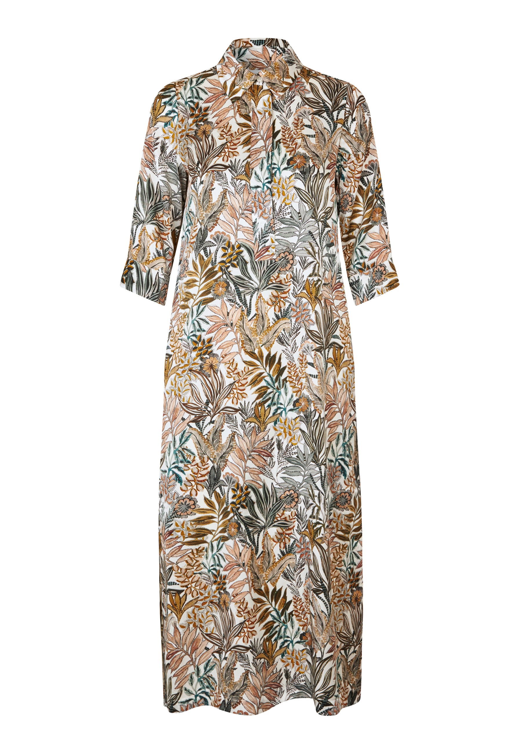Smuk lang silketunika kjole i gyldent print, bestående af creme, orange, grønne og brune nuancer. Kjolen har klassisk skjortekrave, stolpelukning med knapper, stiklommer og trekvartærme med manchet. Hvis du har været glad for Helgadea kjolen, er denne nye style helt sikkert noget for dig.