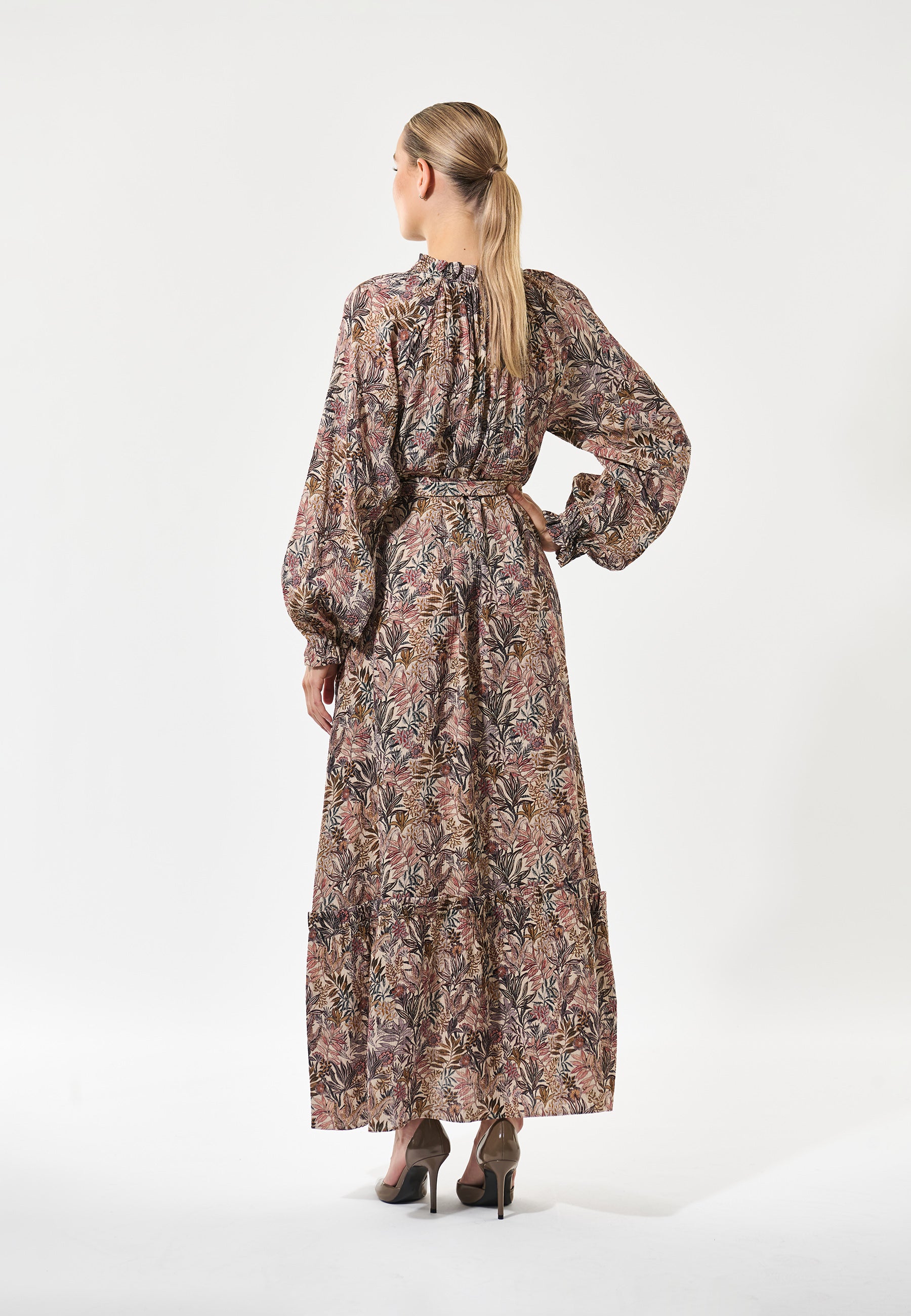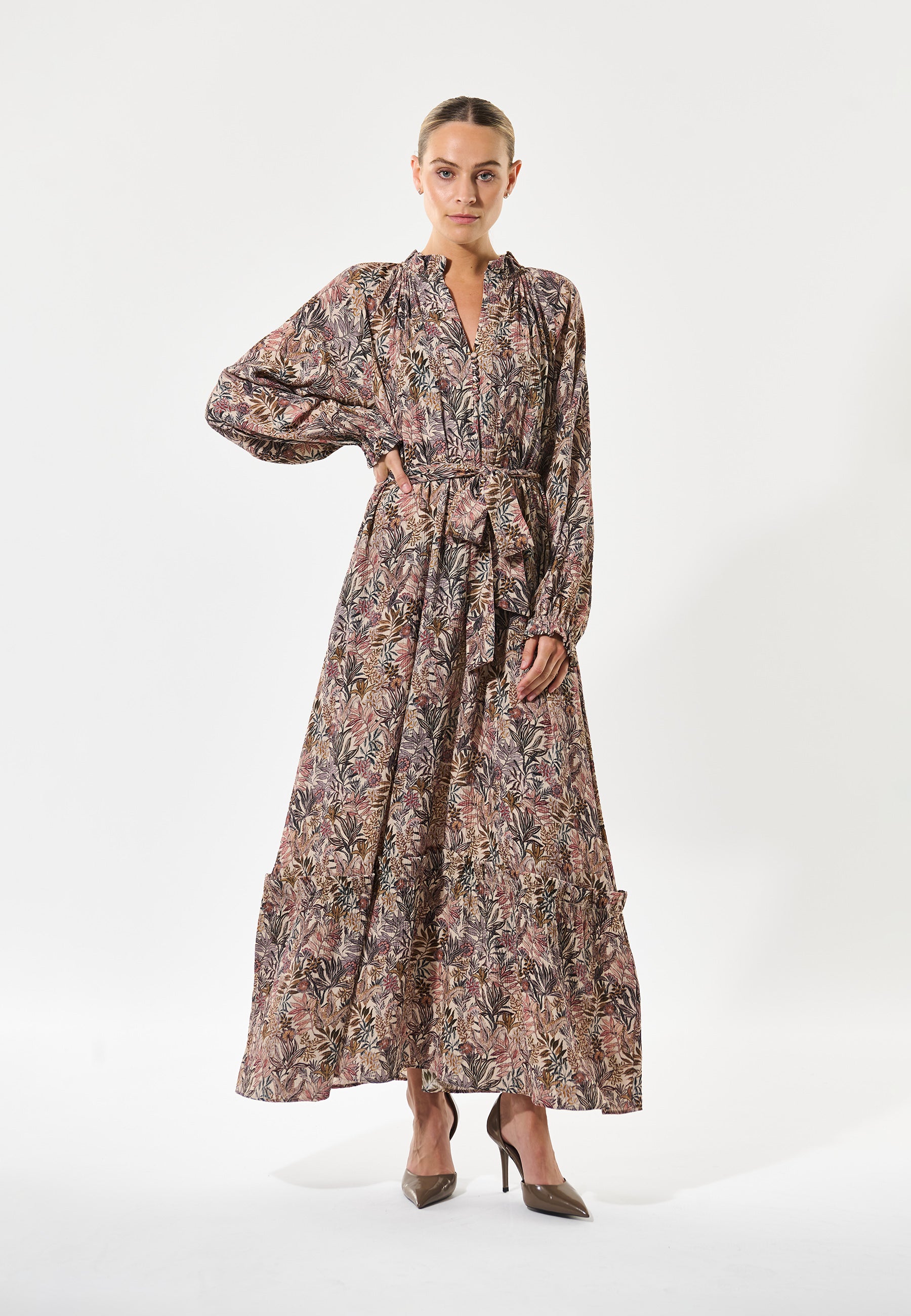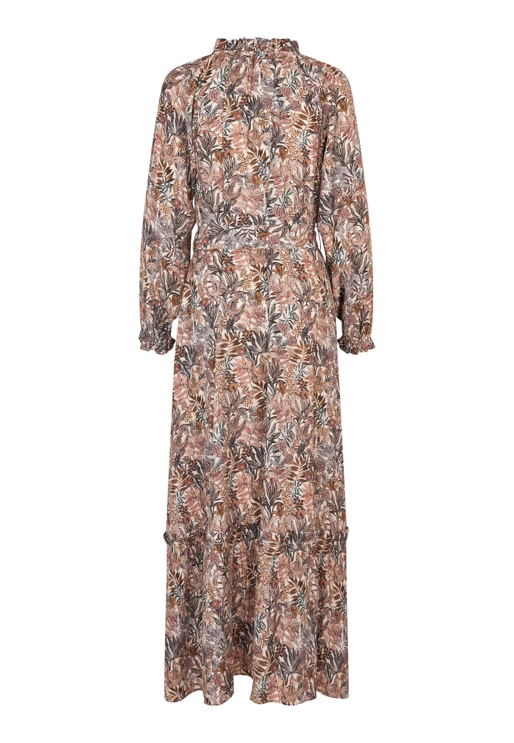 Skøn lang crepet viskose kjole med moderat vidde. Kjolen har flæse-kinakrave med hægte lukning, betrukneknapper nederst i udskæringen, fyldige raglanærmer med elastik-manchet, bred flæse forneden og bindebælte. kjolen kan evt tilføres et mere råt look, ved at style den med et læderbælte. Printet i gyldent, brunt og rødlige nuancer print består af blade, grene og blomsterfrø.
