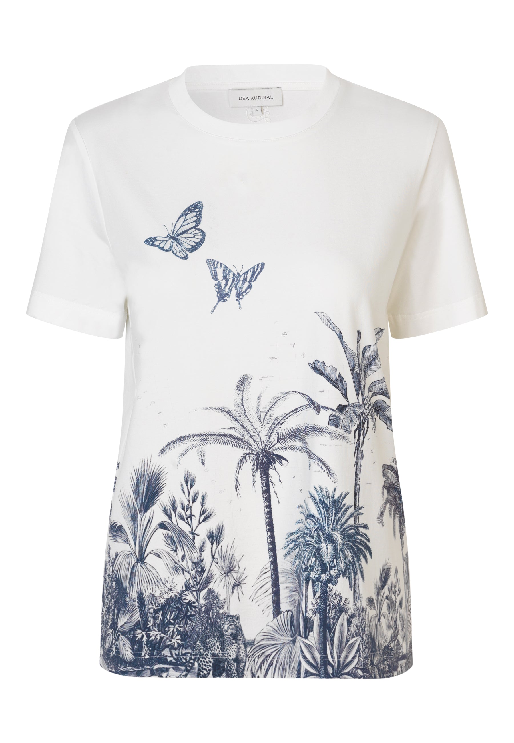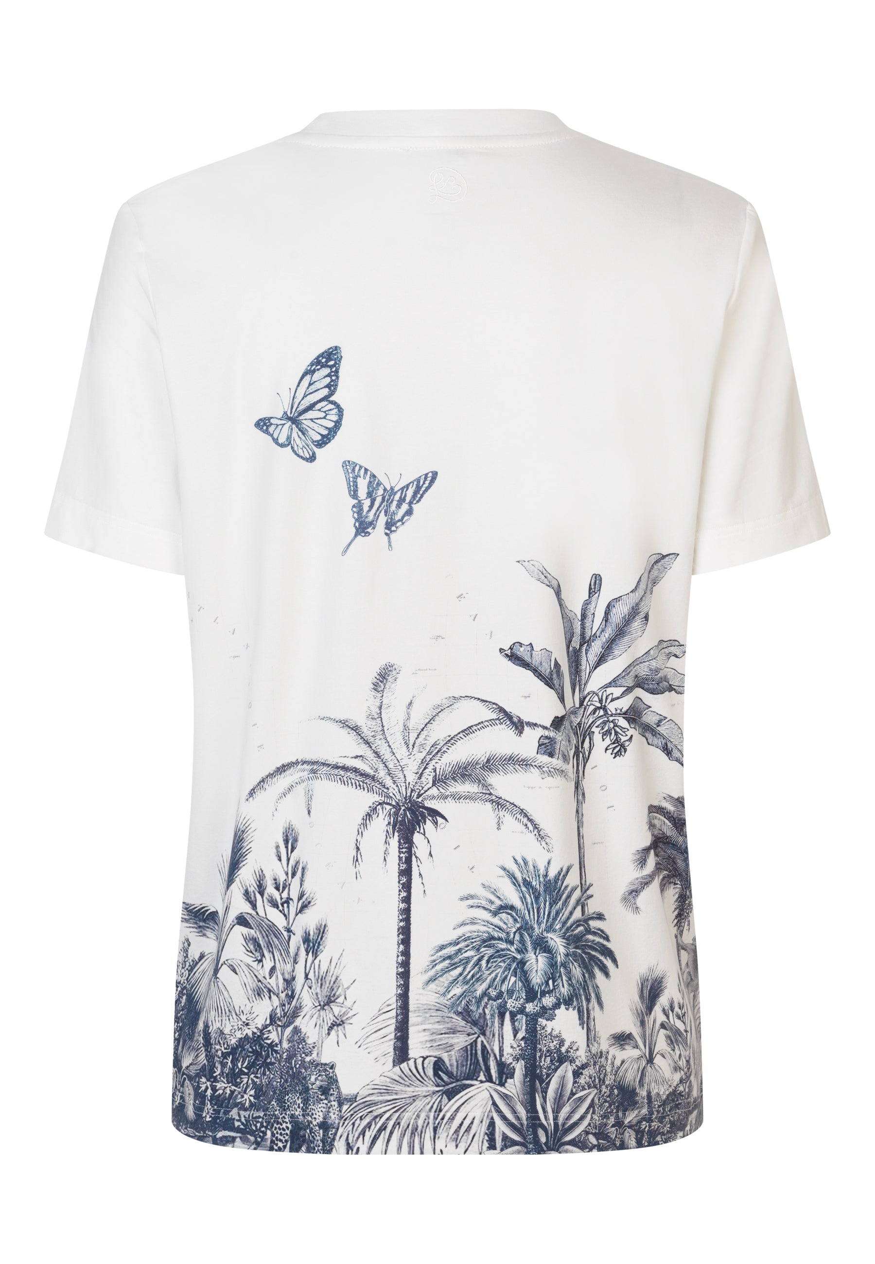 Lækker t-shirt i klassisk snit, påtrykt et fint grå/blåt print med palmer og sommerfugle samt en svag antydning af et gammelt sø-kort.