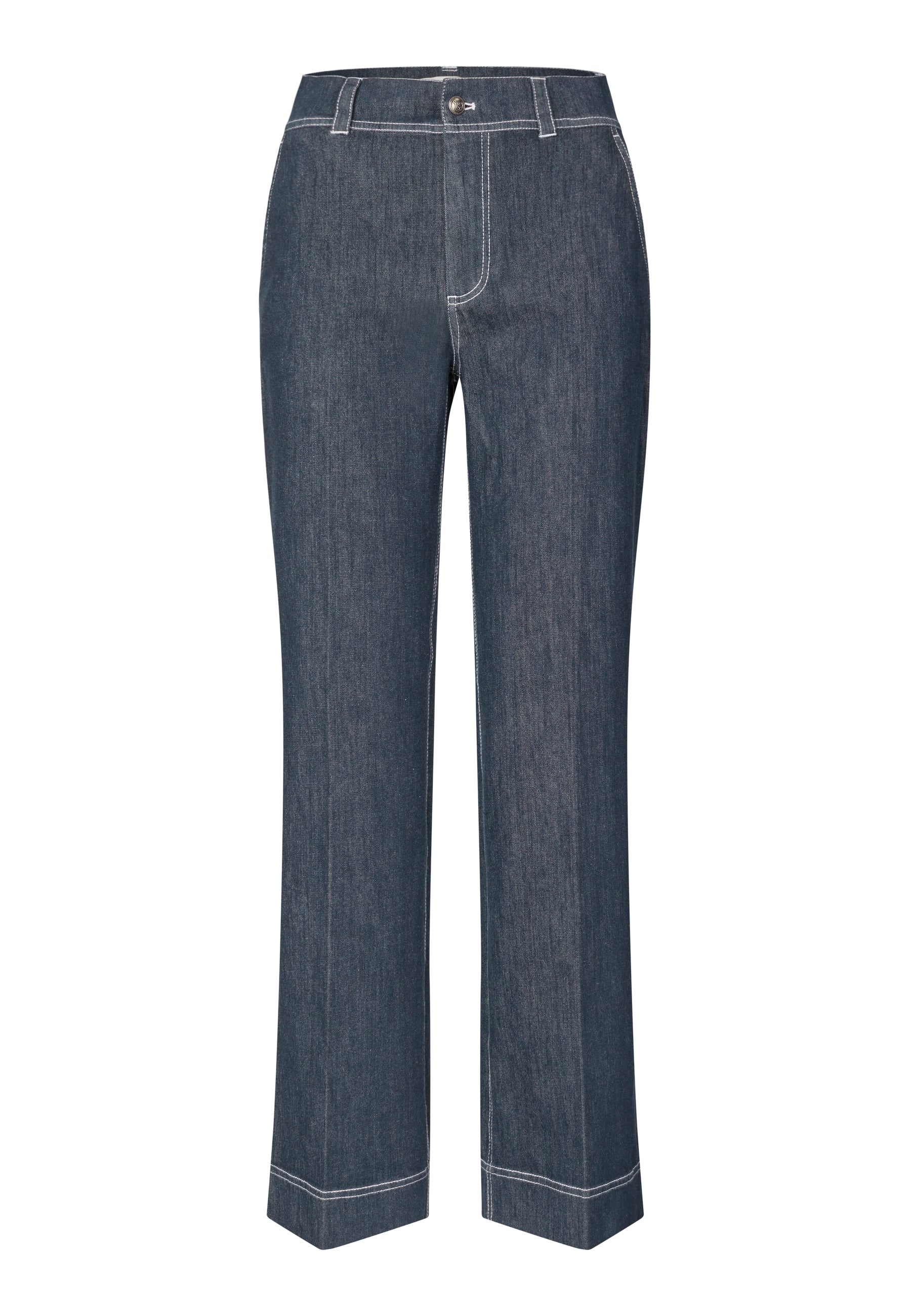 Klassiske jeans med løs benvidde, skrålommer, store påsyede baglommer og hvide stikninger.