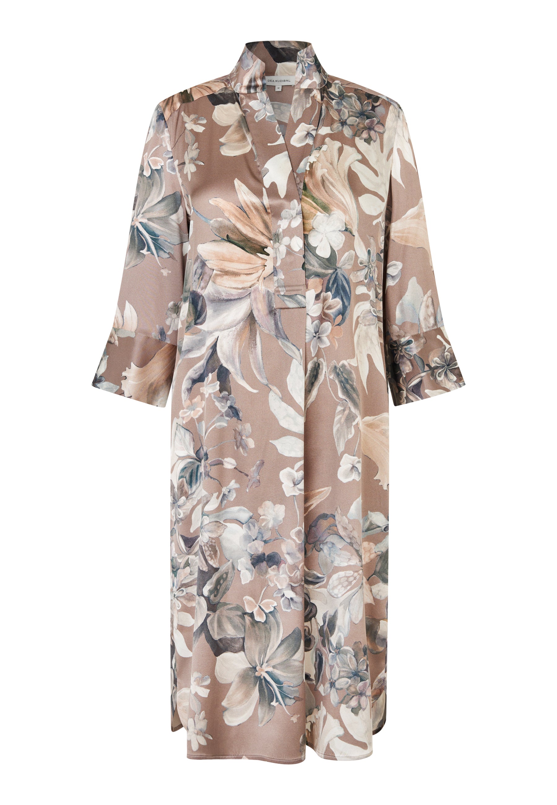 Skøn silketunikakjole i et douchet blomsterprint på karamelfarvet bund. Kjolen har brede manchetter, stolpelukningen og kina krave.