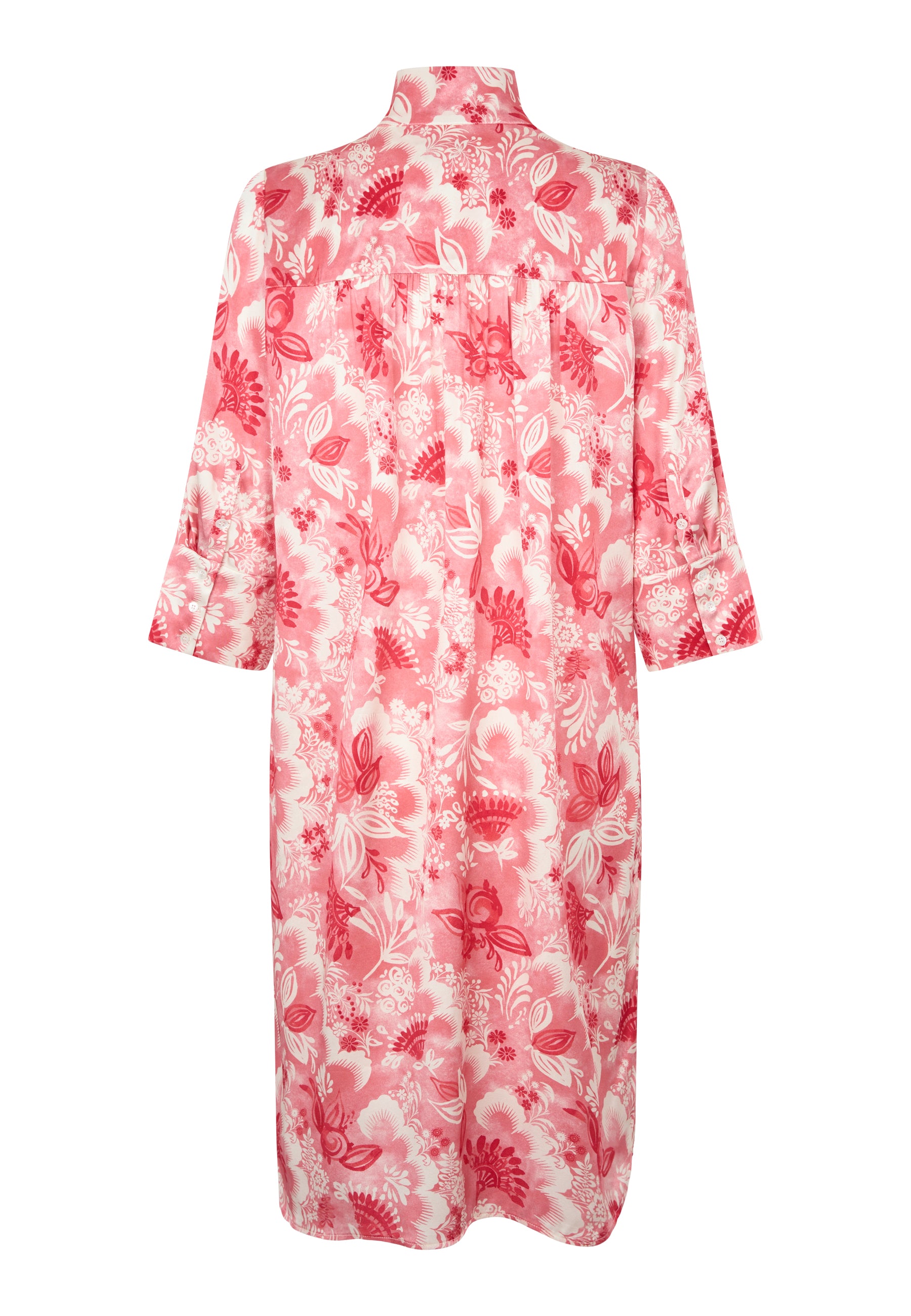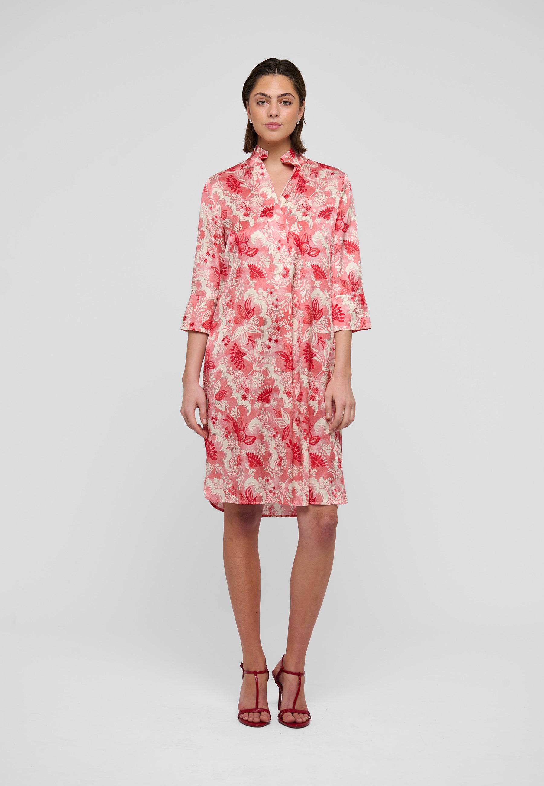 Skøn silke tunikakjole i fint blomsterprint bestående af røde nuancer og cremehvid.