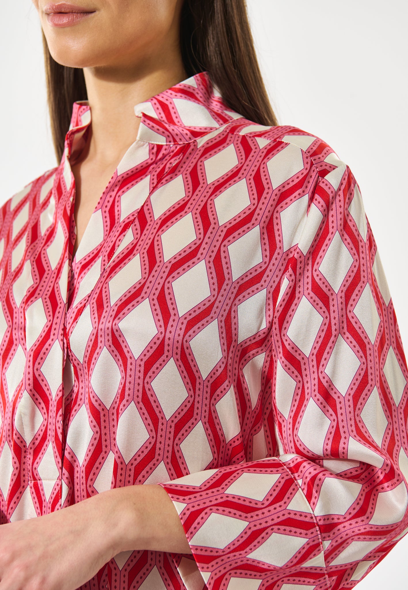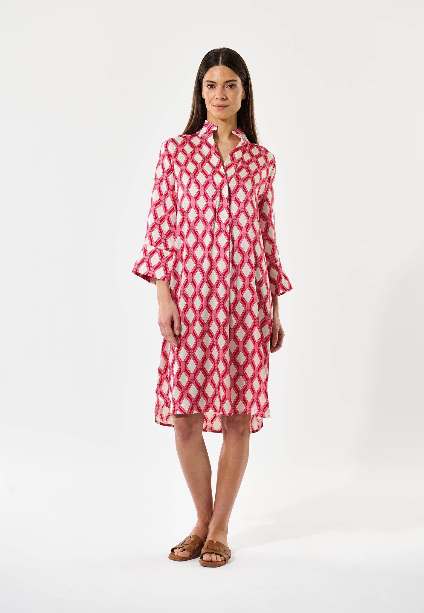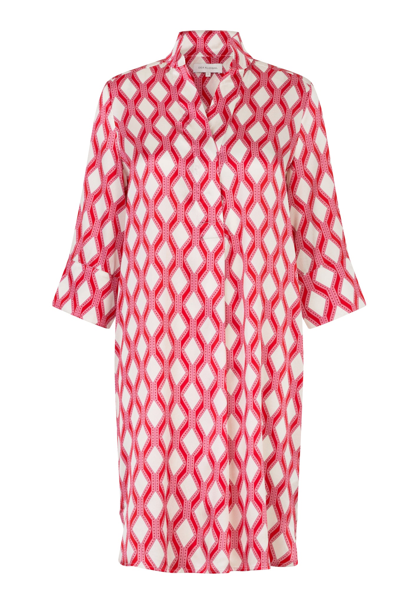 Smuk silketunika kjole i grafisk print bestående af røde, pink og hvide farver. Kjolen har stolpelukning, høj krave, trekvartærme med bred manchet og en rundet slids forneden