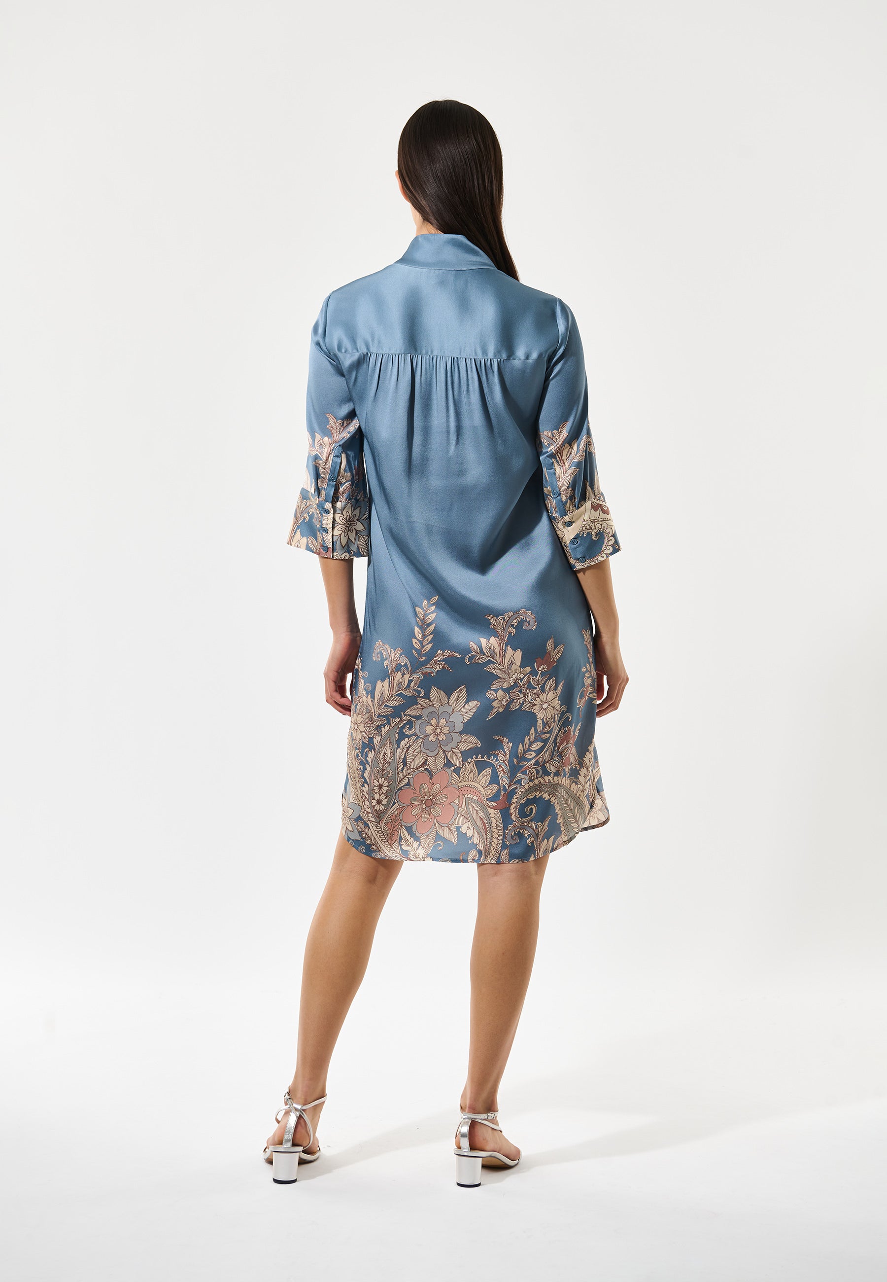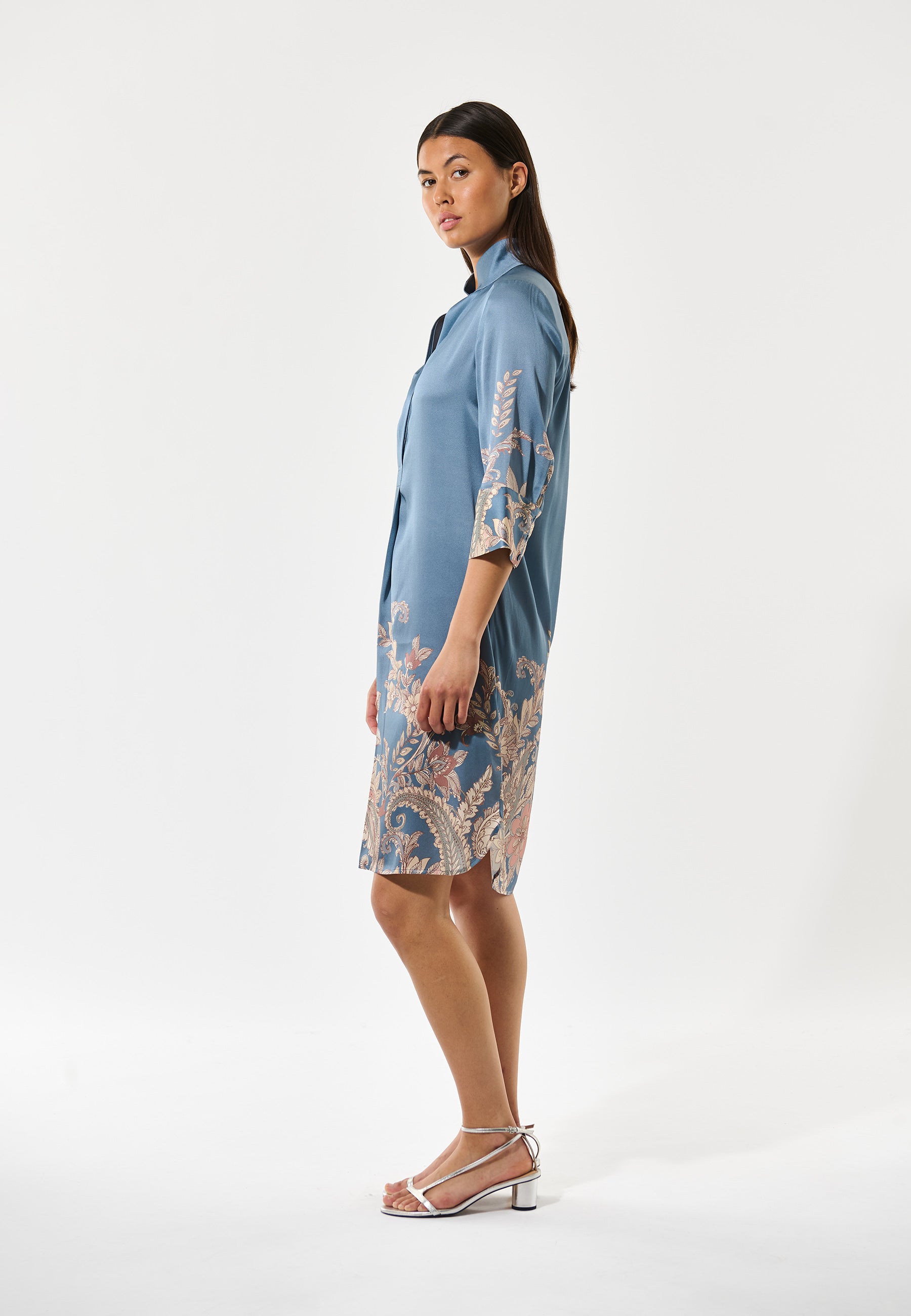 Skøn lyseblå silke kjole med smukt placement print i bestående af grafiske blomster i rosa, creme og rust farver. Kjolen har stolpelukning, høj krave, trekvartærme med bred manchet og en rundet slids forneden
