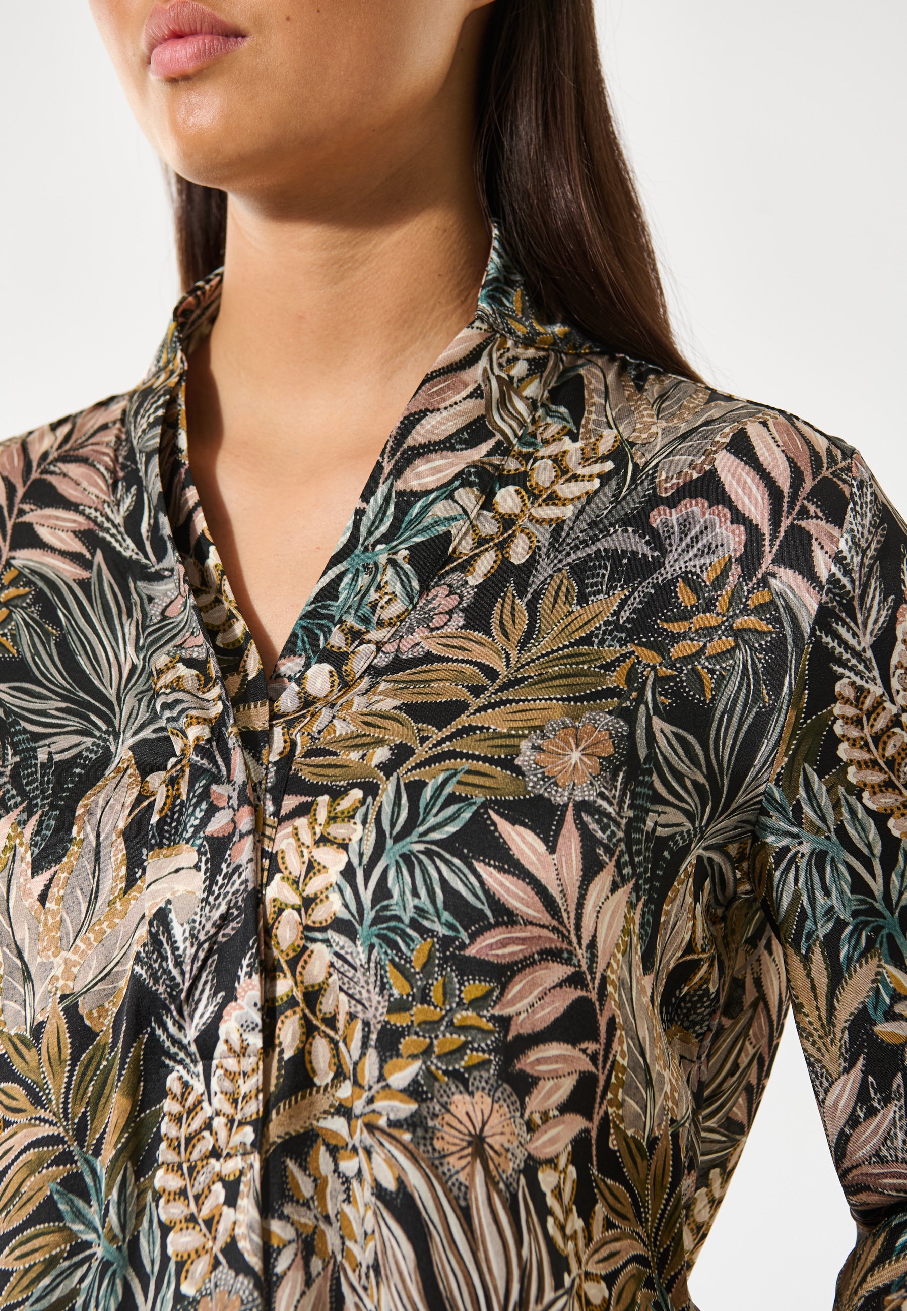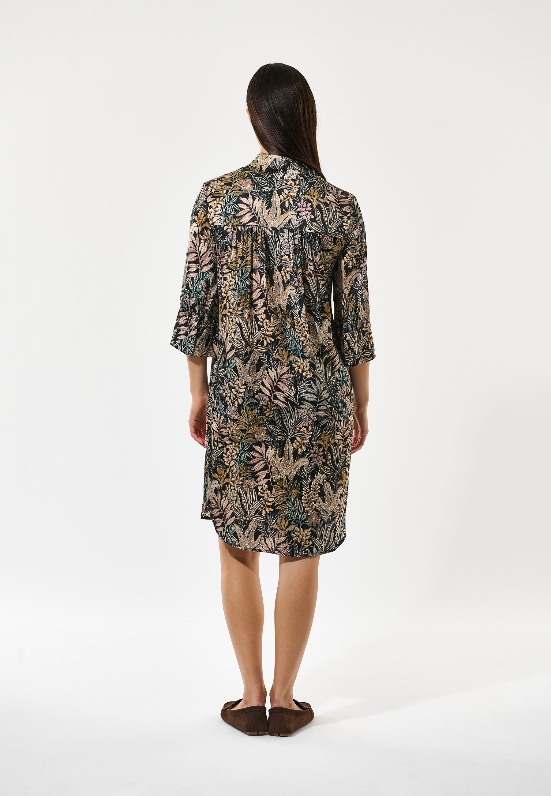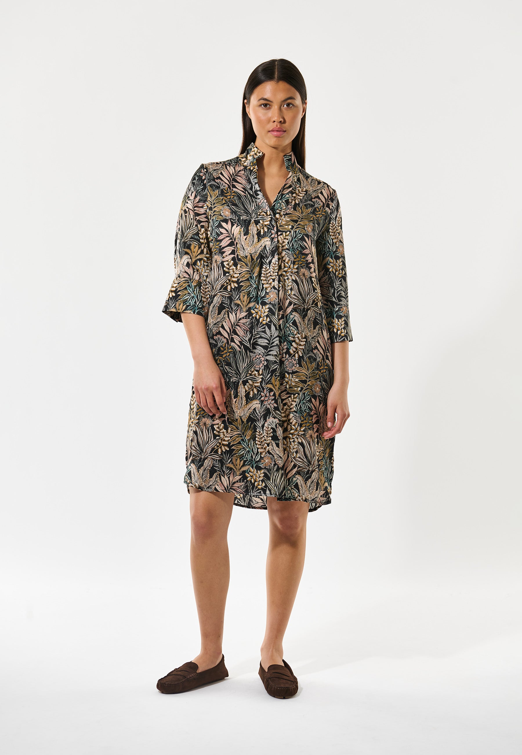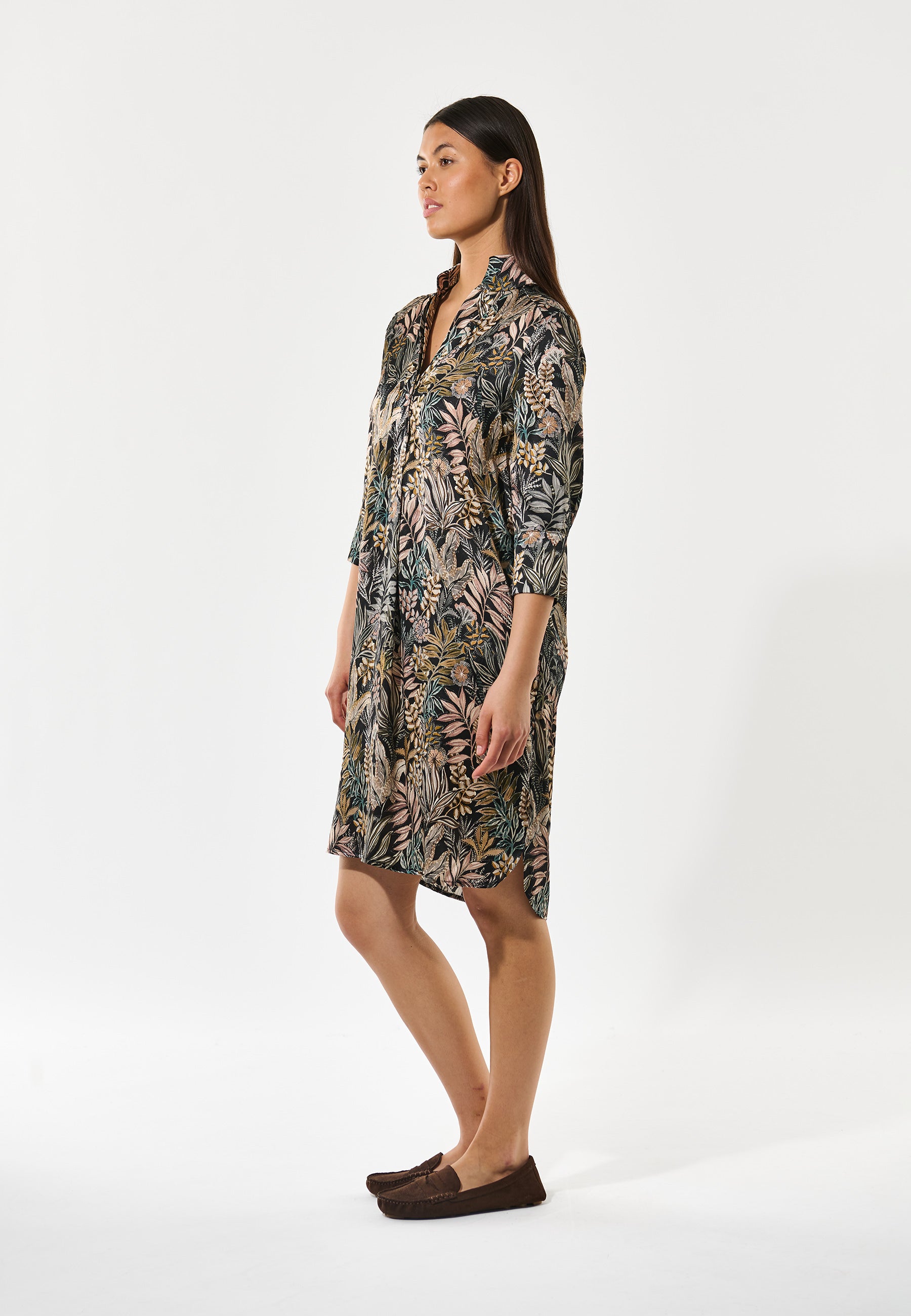 Deas klassiske tunikakjole med høj krave, trekvartærme med bred manchet og en rundet slids forneden. Kjolen er i et smukt blomsterprint bestånde af creme og gyldne nuancer på sort bund.