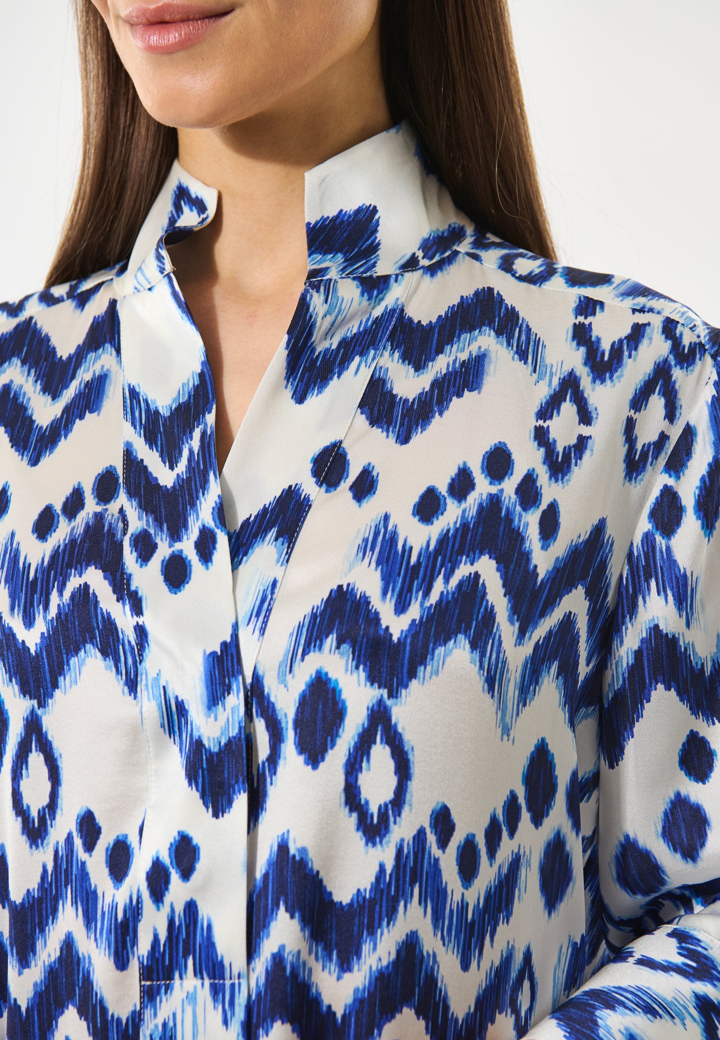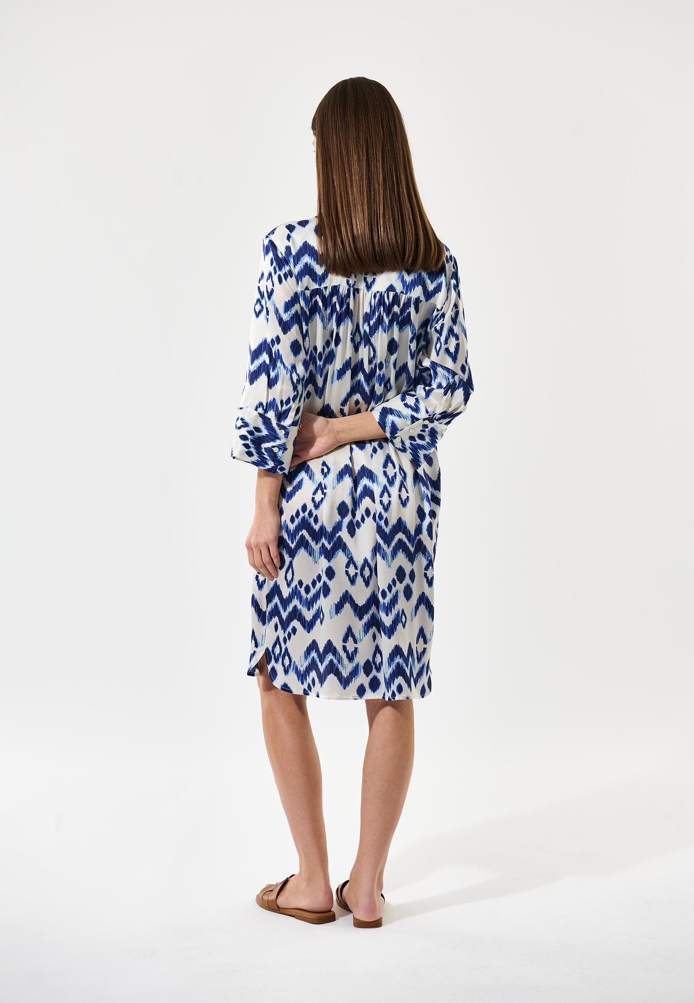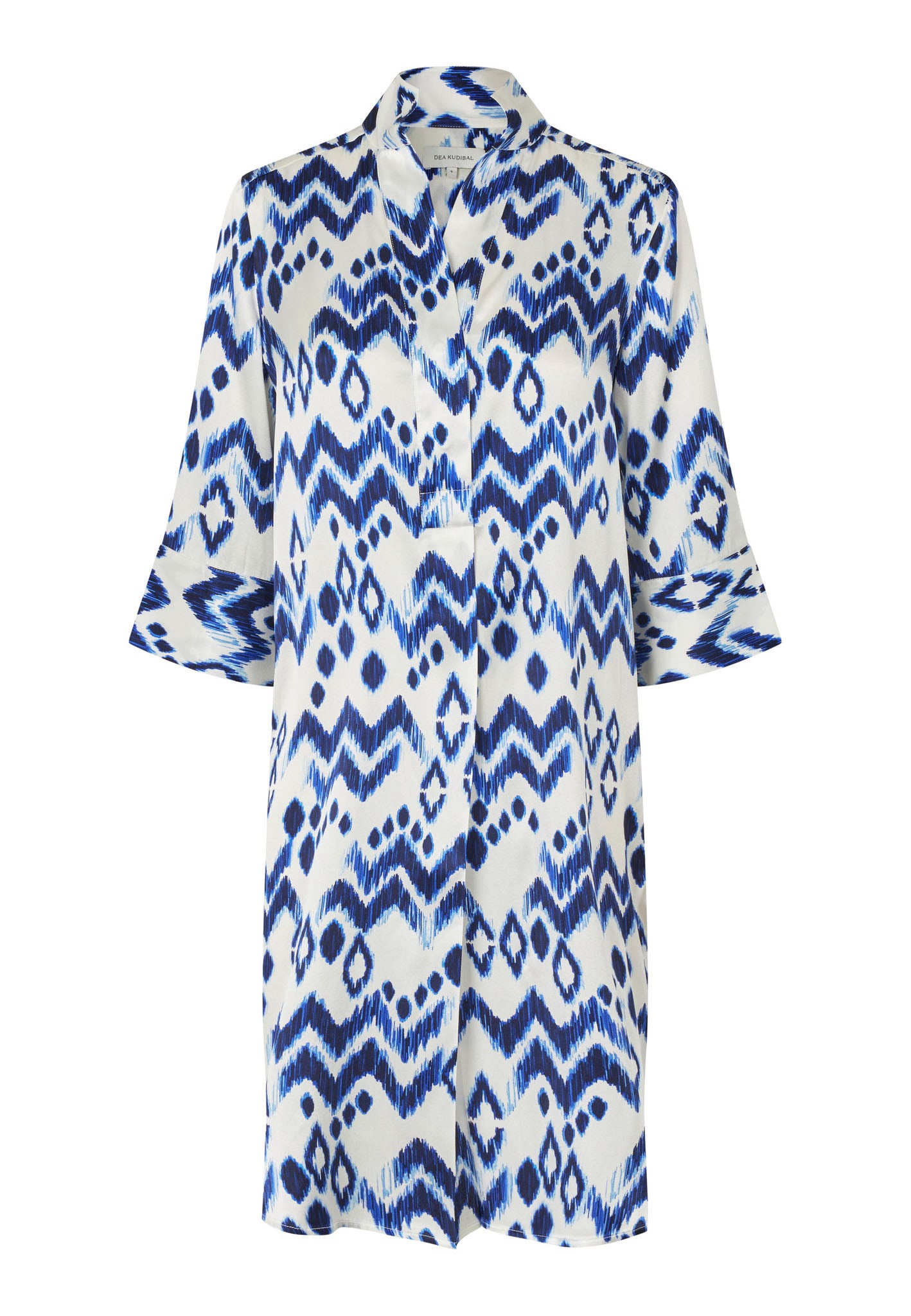 Smuk silketunika kjole i grafisk print bestående af blå og hvide farver. Kjolen har stolpelukning, høj krave, trekvartærme med bred manchet og en rundet slids forneden