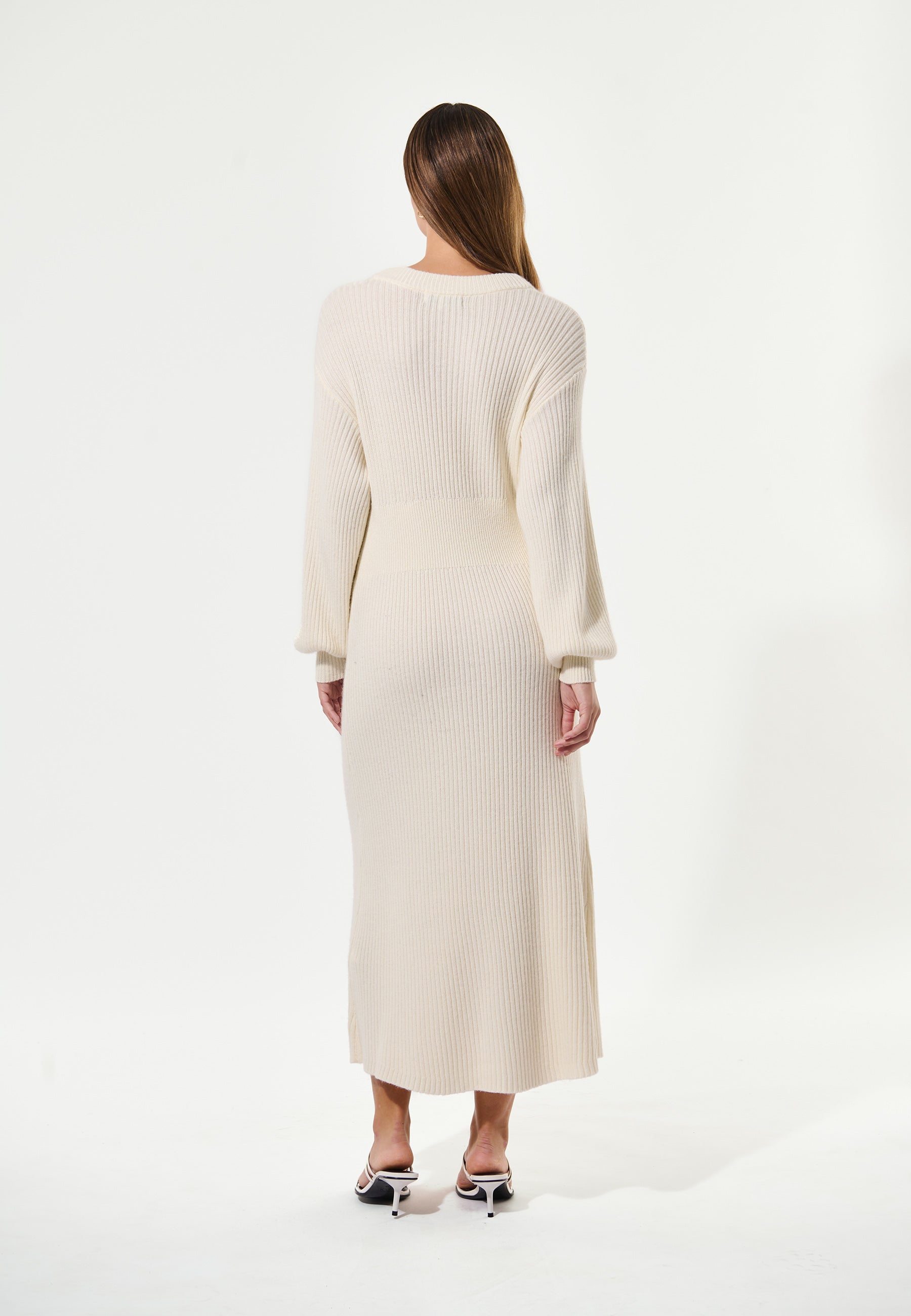 Lang strikkjole/cardigan i lækker blød lambswool blanding. Cardiganen har brede ærmer med rib manchet, bankede gyldne knapper, samt en rib-detalje i taljen som giver den et smukt feminint look. Lukket kan cardiganenbruges som kjole.