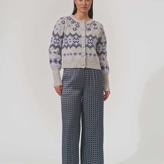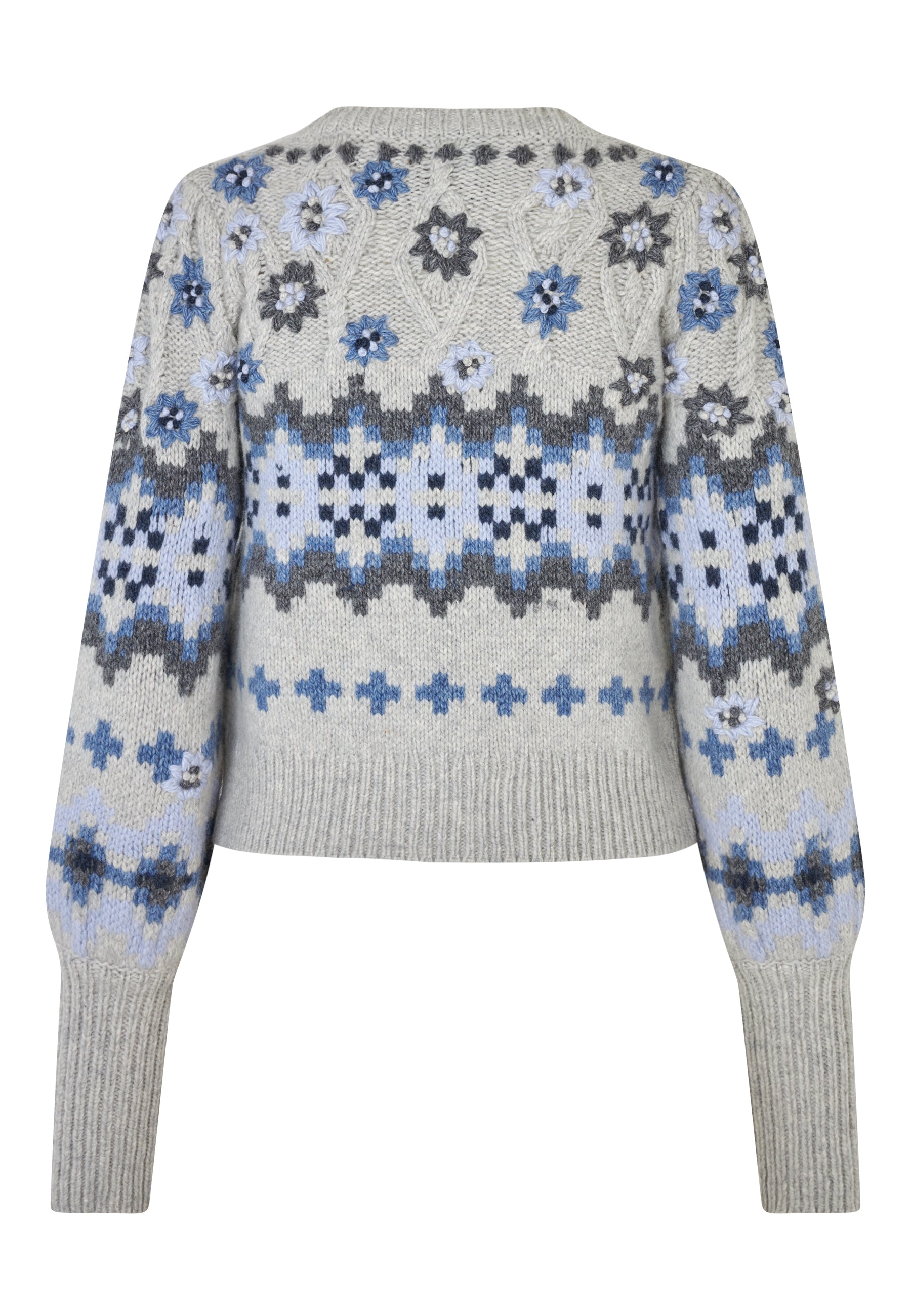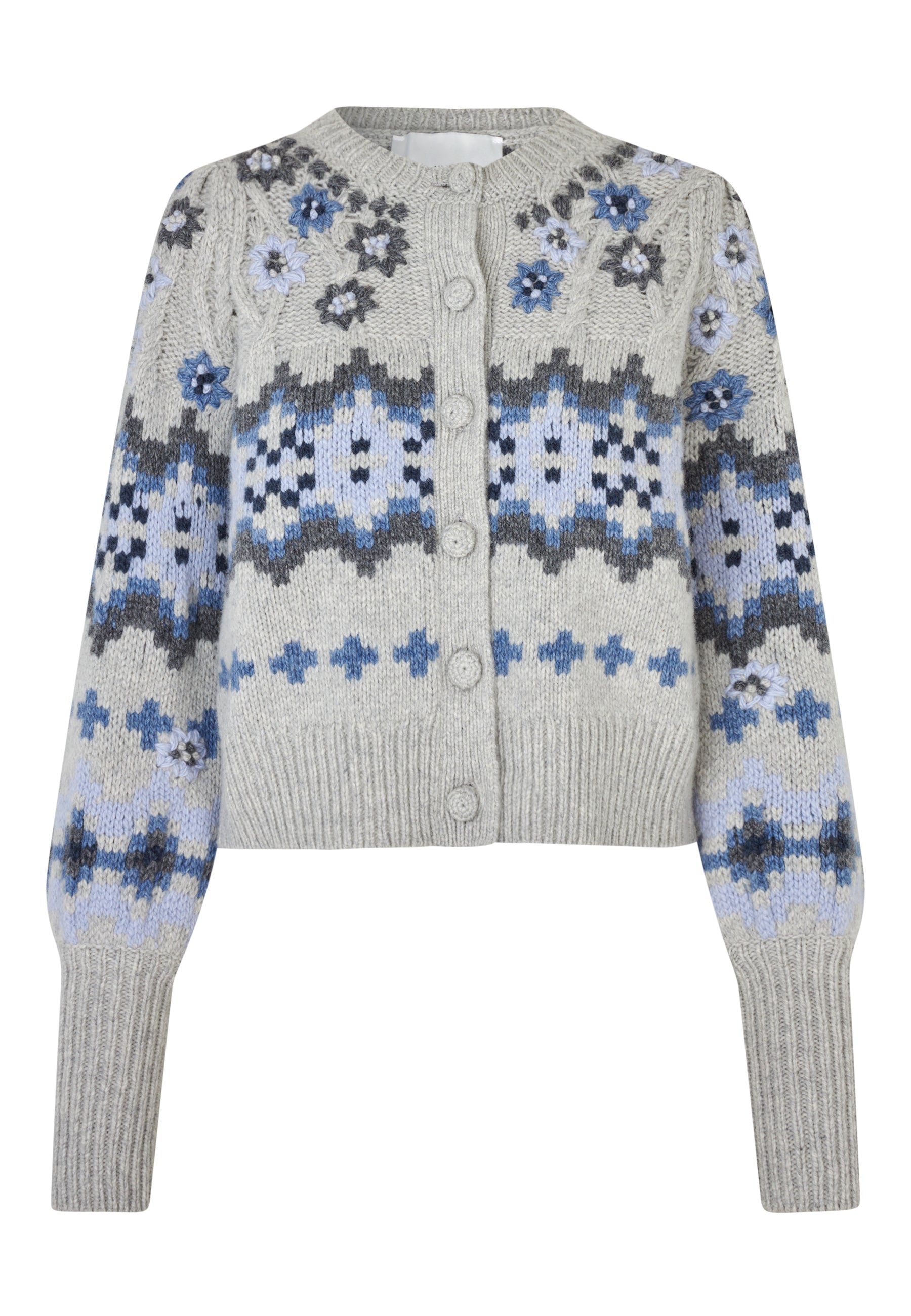 Smuk feminin strik med skønne broderier, brede rib manchetter, fine hæklede knapper.