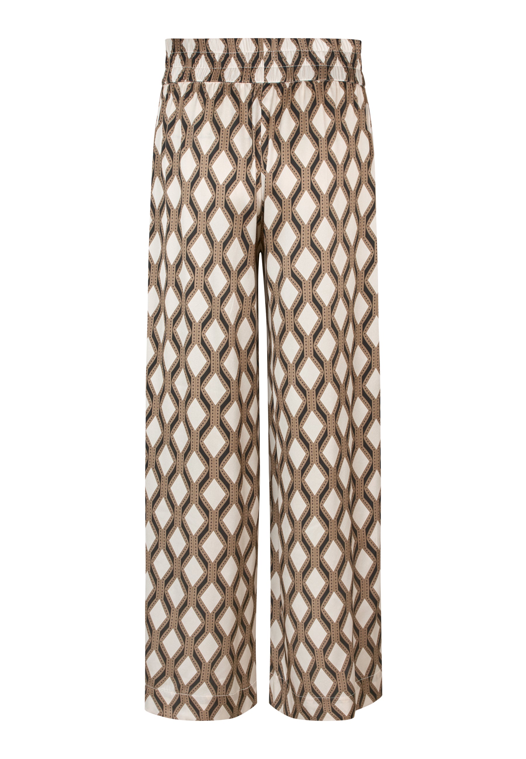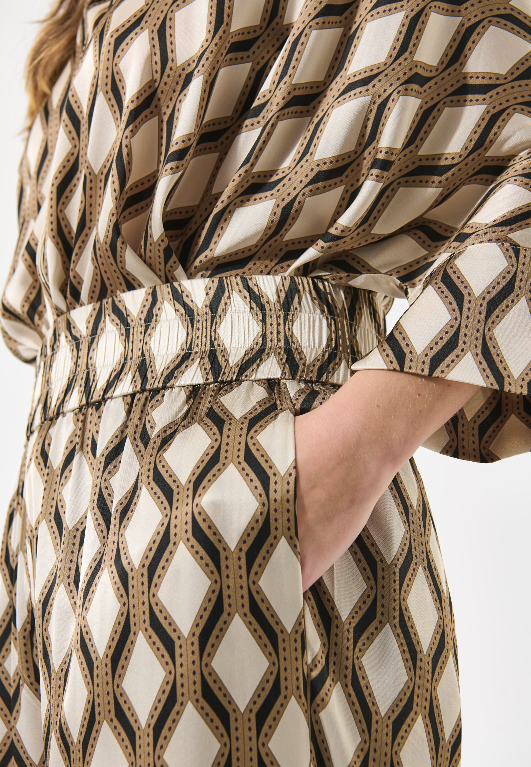 Skønne silkebukser med bred elastik linning i smuk grafisk print bestående af sort, camel og creme nuancer.