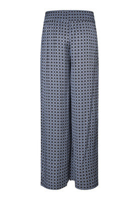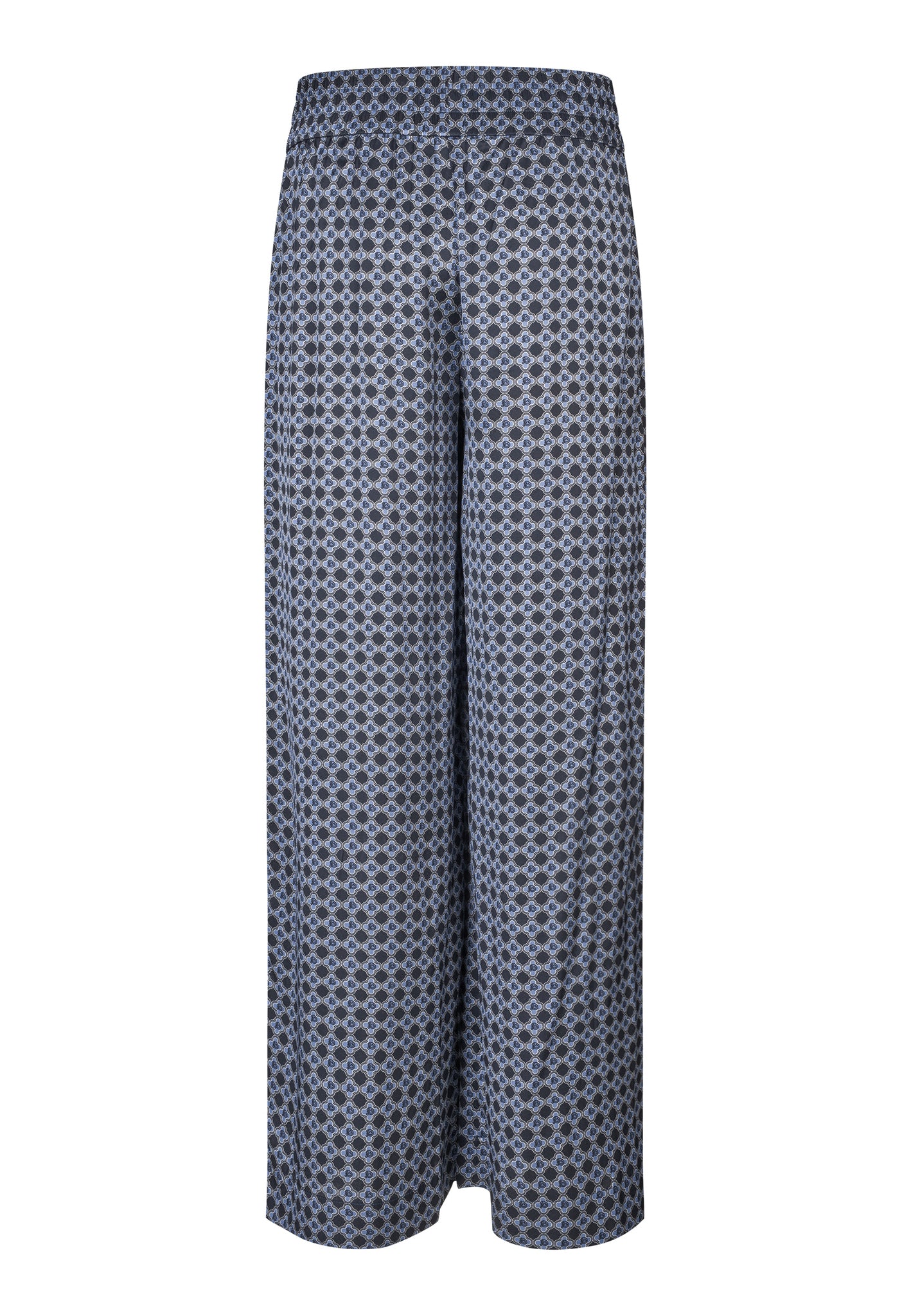 Skønne silkebukser med bred elastik linning i et eventyrligt tangplante-print bestånde af blå nuancer på en cremefarvet bund.
