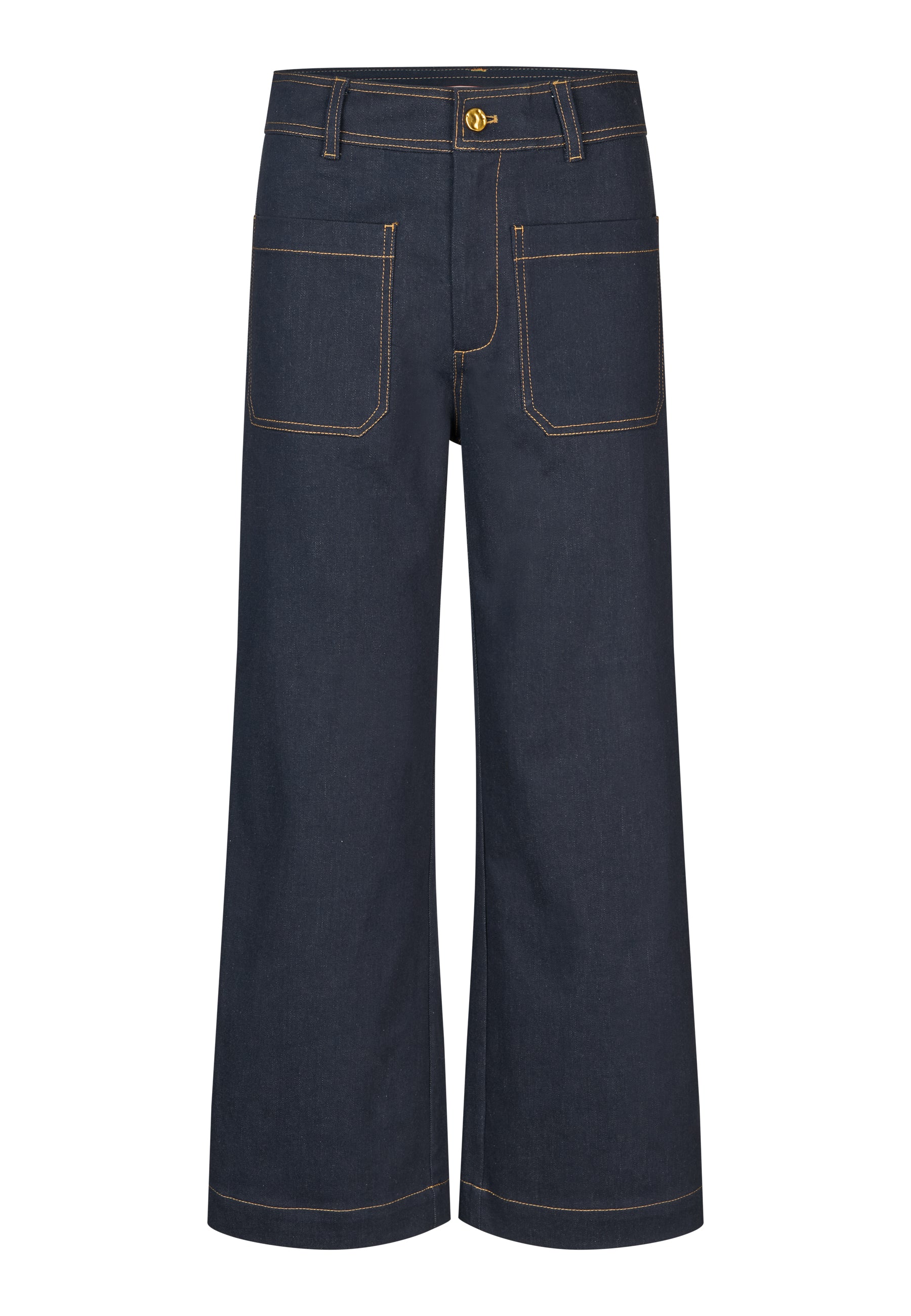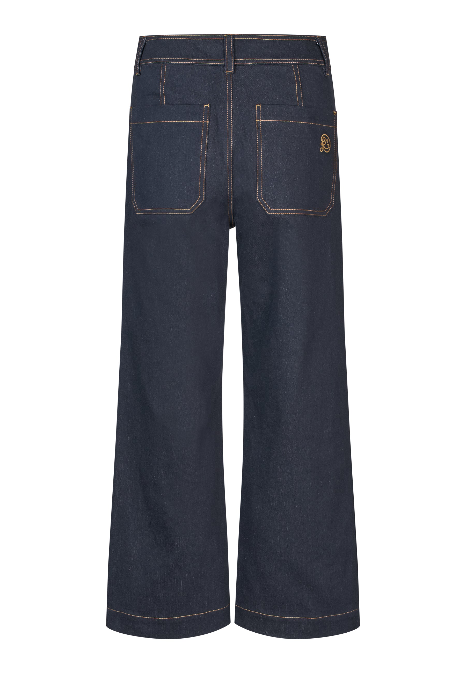Cool jeans med 70ér inspirerede detaljer, såsom brede lige og påsyede forlommer. Jeansne er i den klassiske mørkeblå jeansfarve, med orange stikninger.