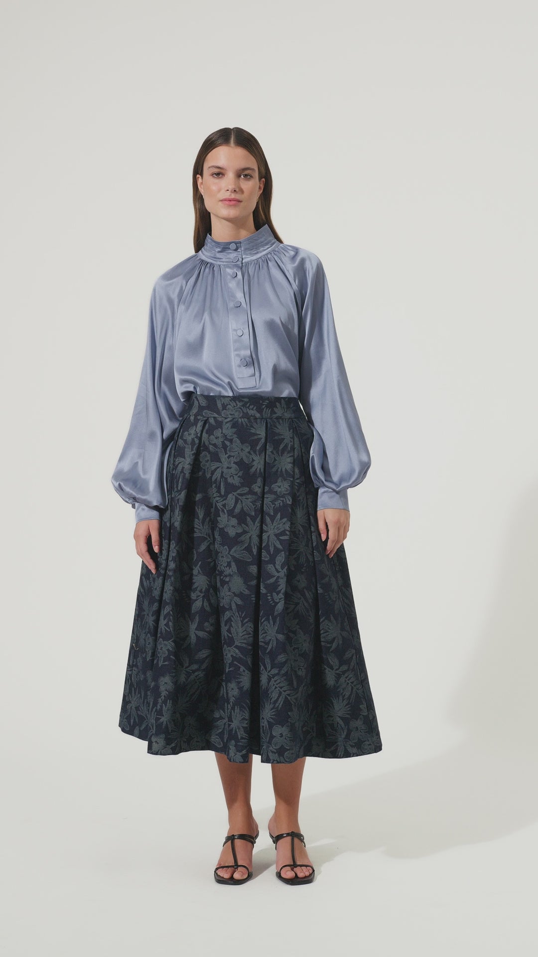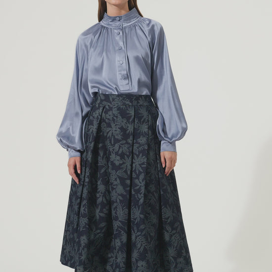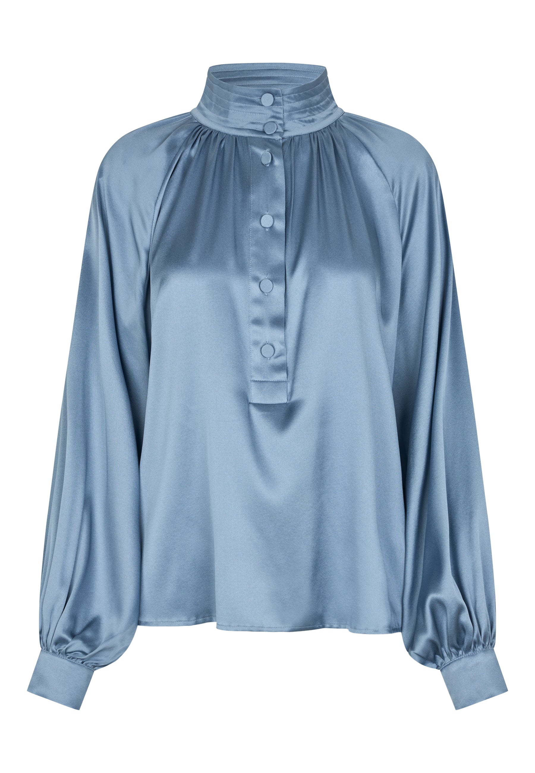 Smuk lyseblå tunika med vidde ærmer og betrukne knapper.
