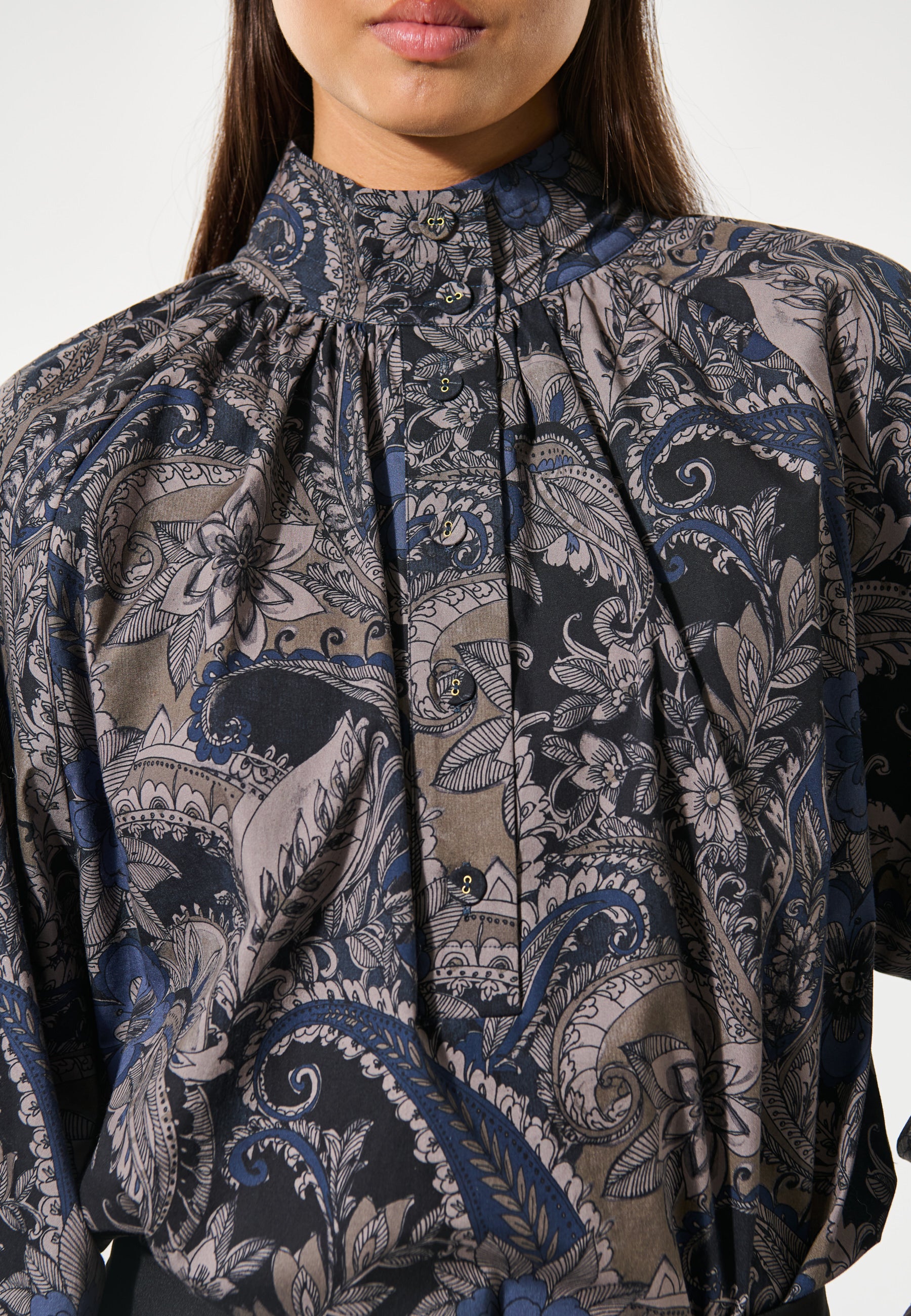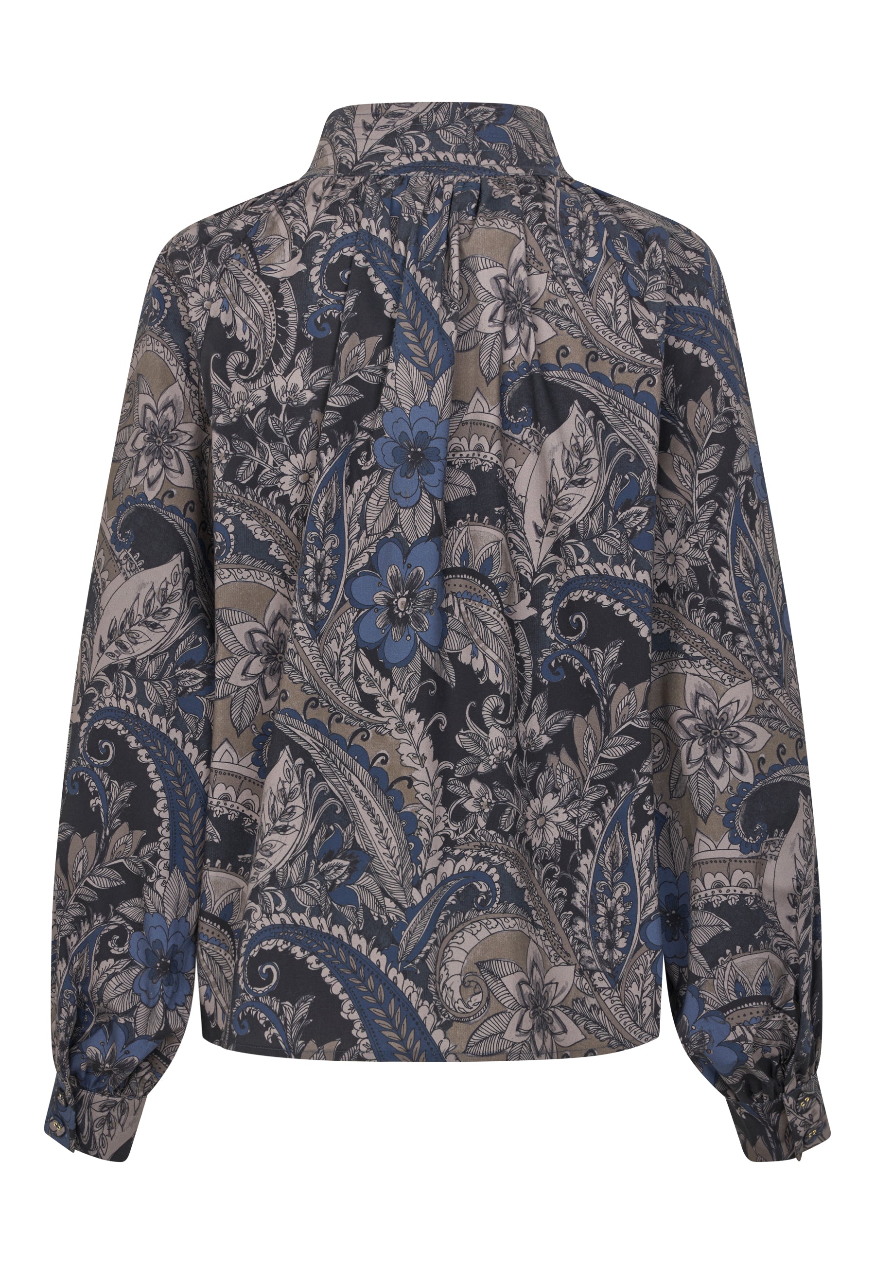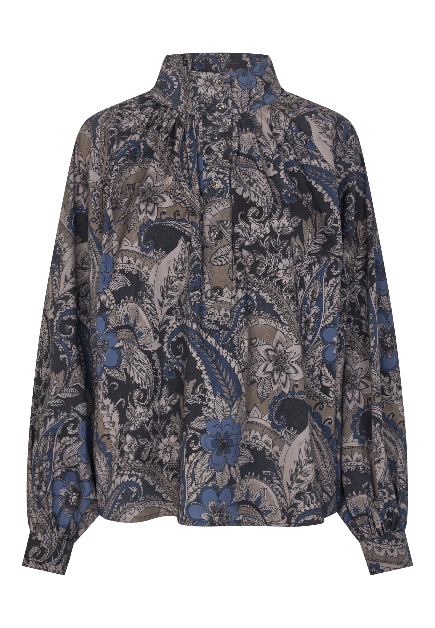 Smuk hørskjorte med smukt placement-print bestående af gyldne blomster på smuk lyseblå bund. Skjorten har vidde ærme og betrukne knapper.