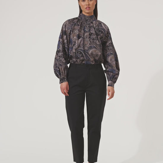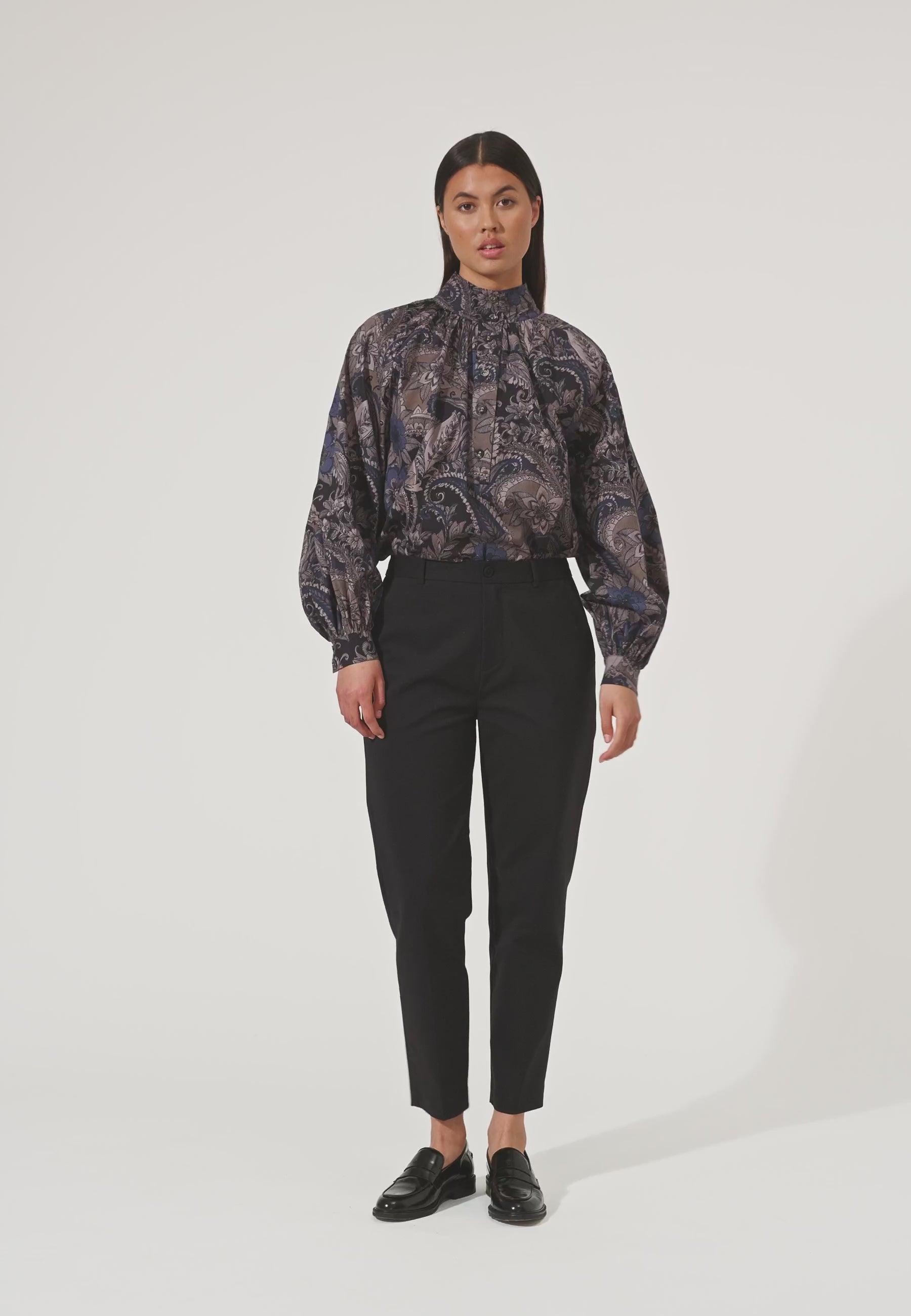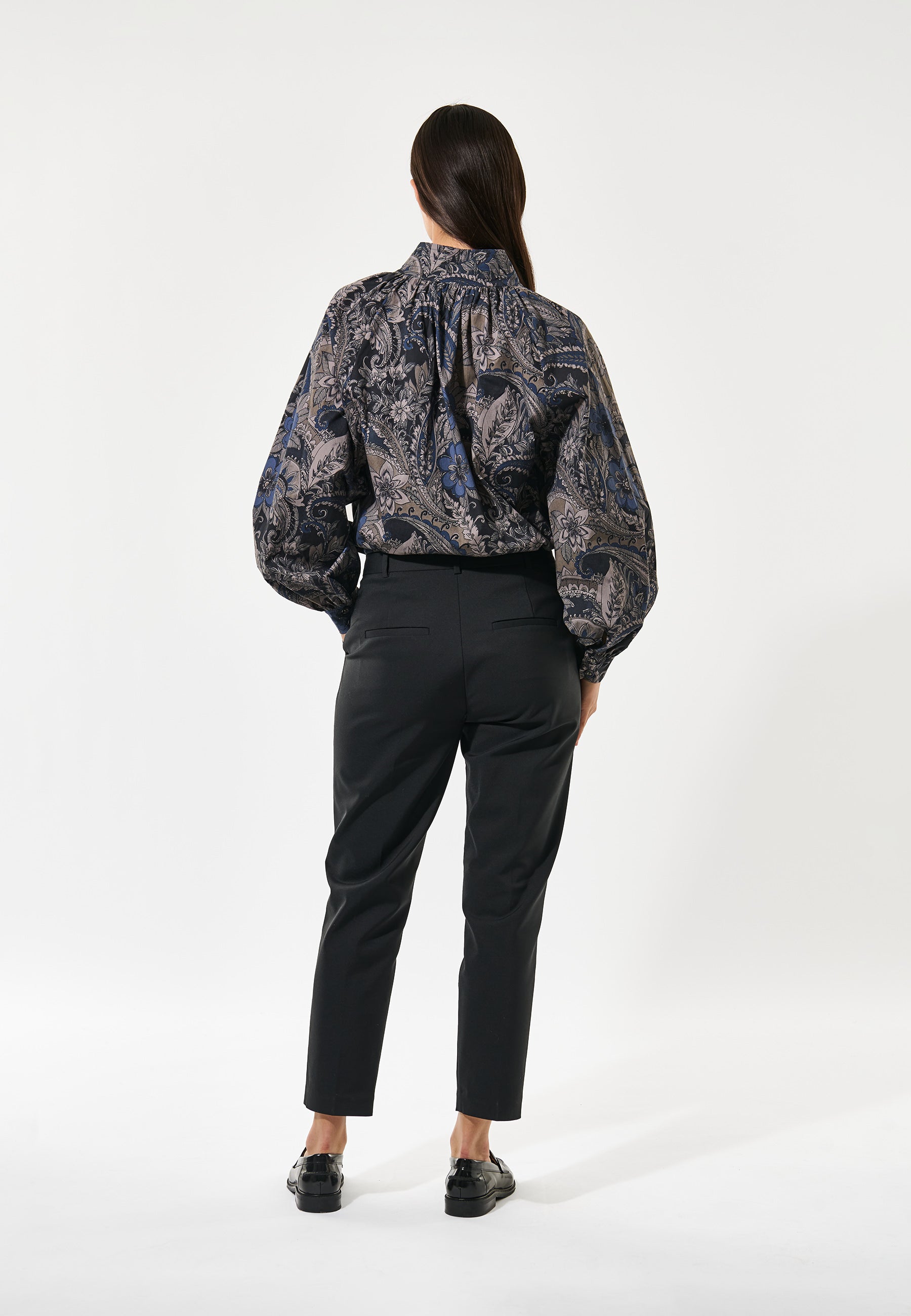 Smuk hørskjorte med smukt placement-print bestående af gyldne blomster på smuk lyseblå bund. Skjorten har vidde ærme og betrukne knapper.
