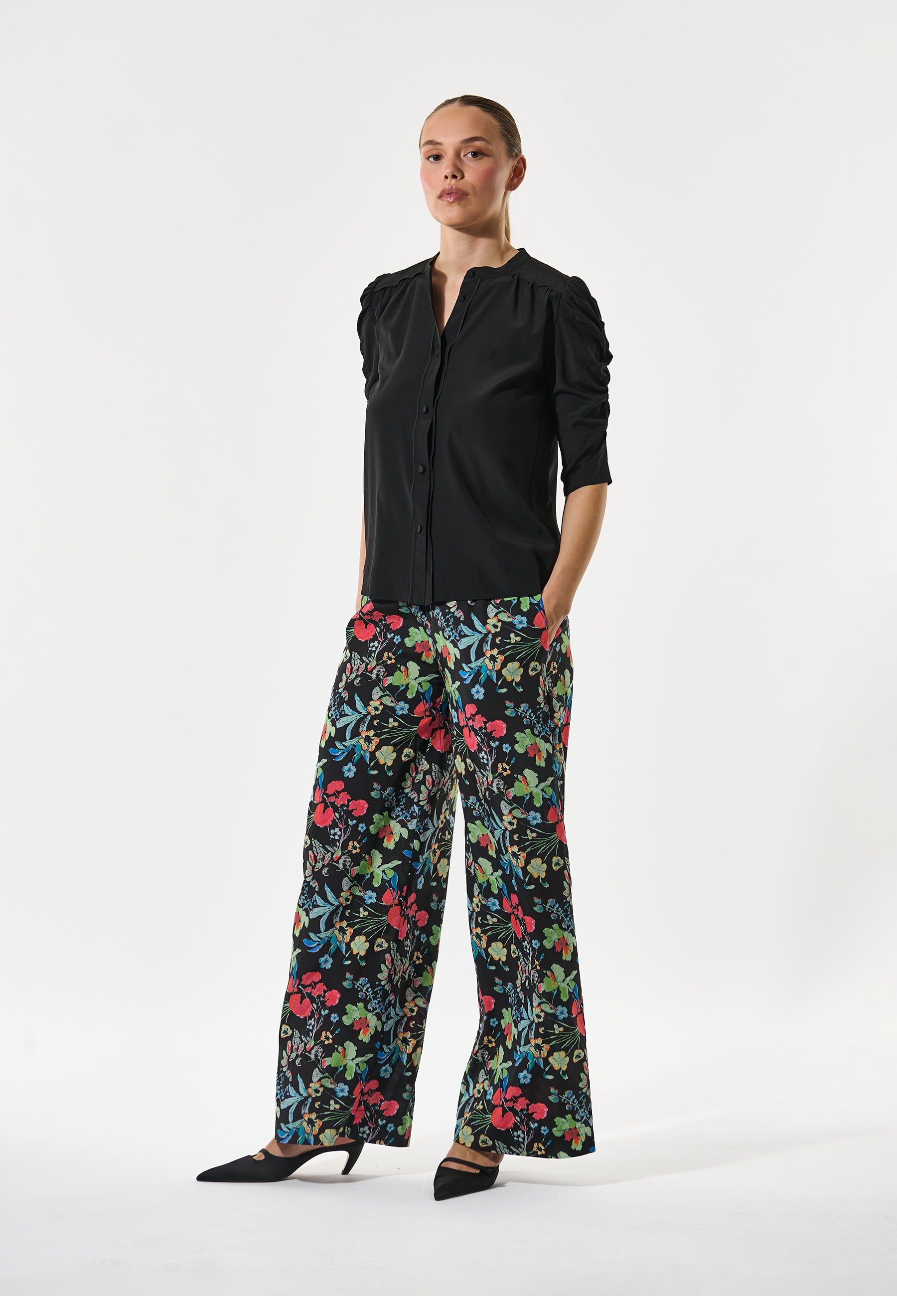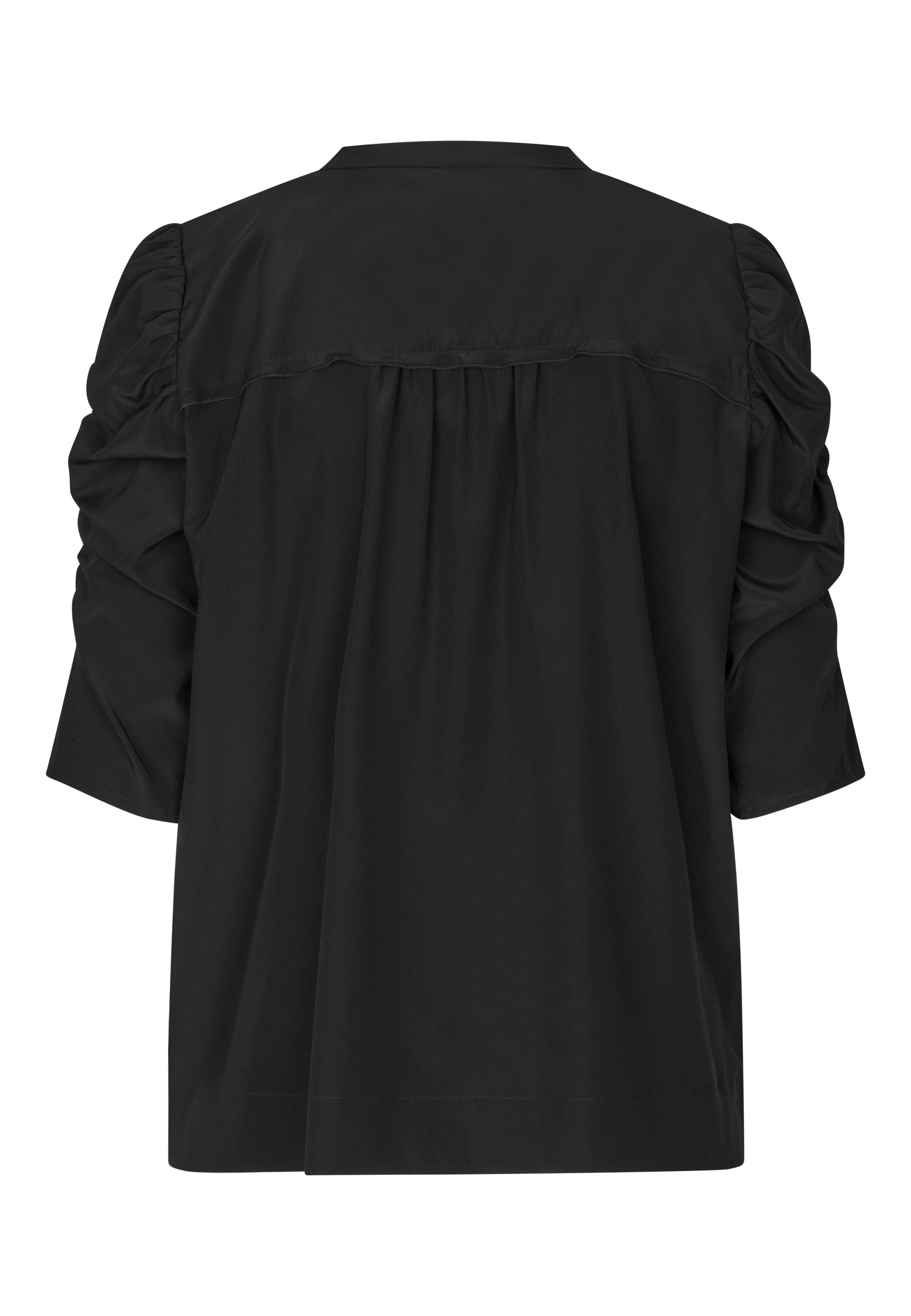 Skøn kortærmet silkeskjorte med rund halsudskæring, betrukne knapper, pufærmer med rynkedetalje samt fine diskrete piping detaljer fortil og på bærestykket.