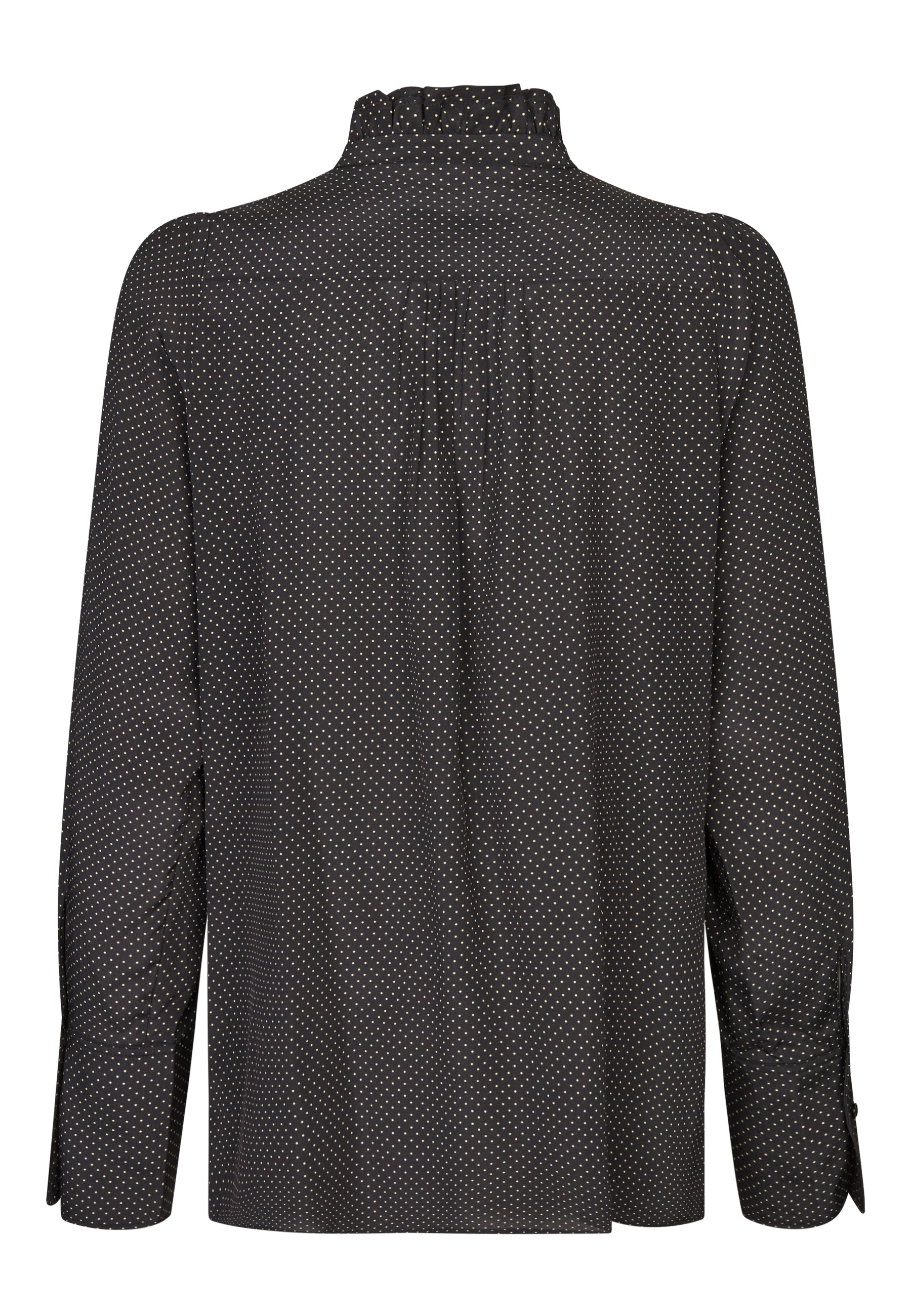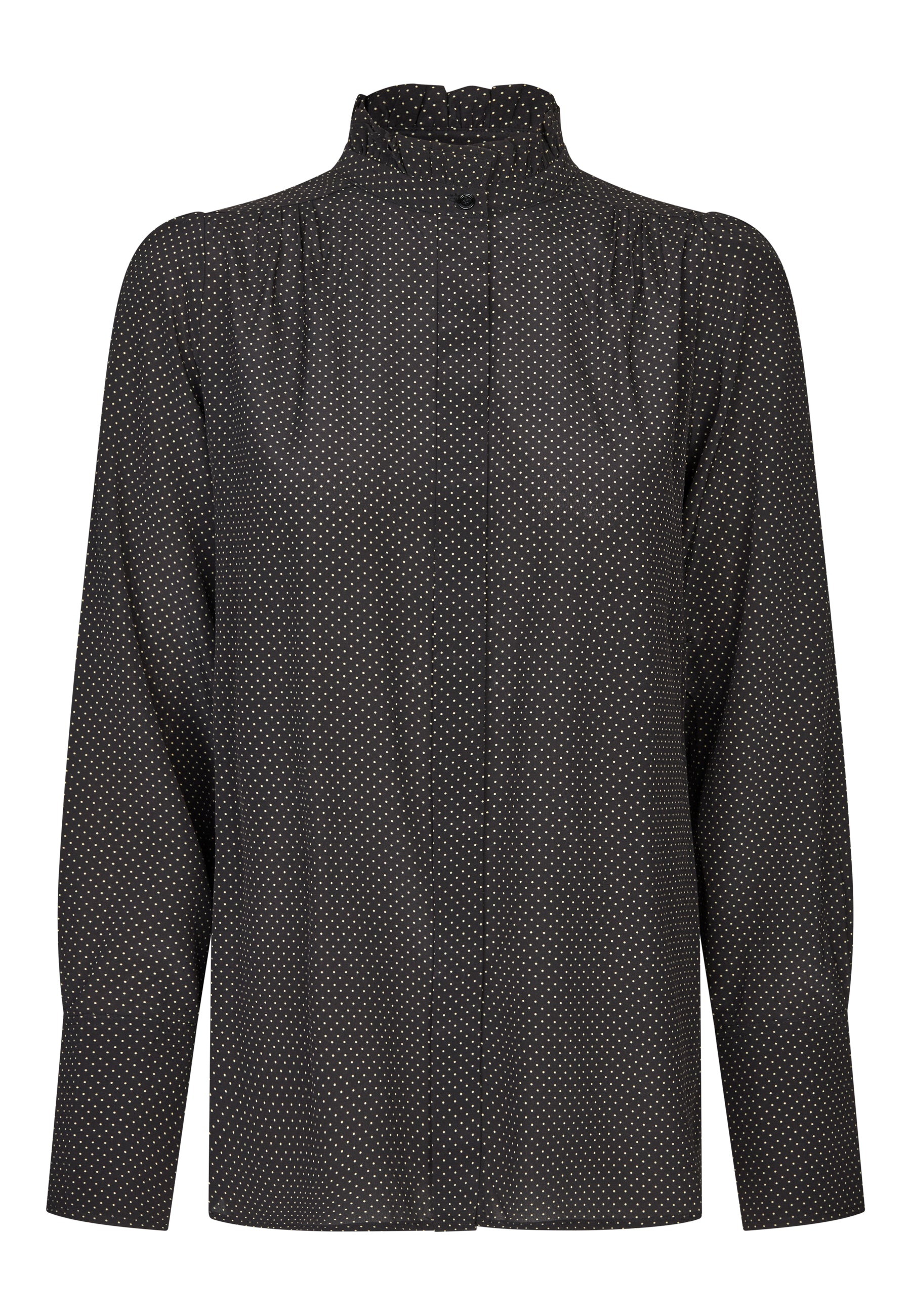 Skøn sort silkeskjorte med små hvide prikker. Skjorten har ærme med puf og bred manchet med buet kant, aftagelige skulderpuder, skjultknaplukning og smal flæse i halsen.