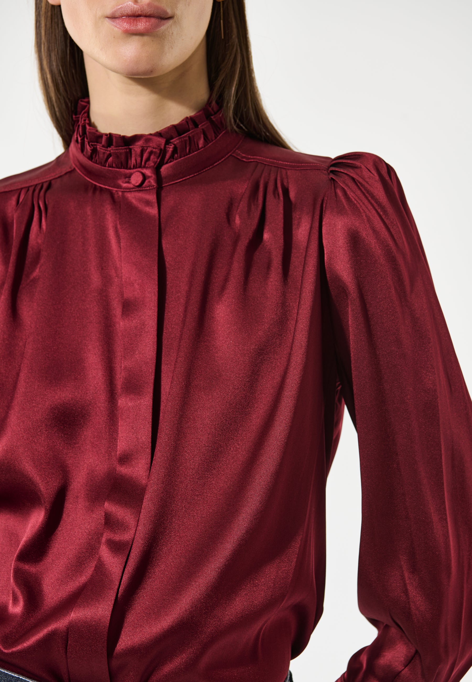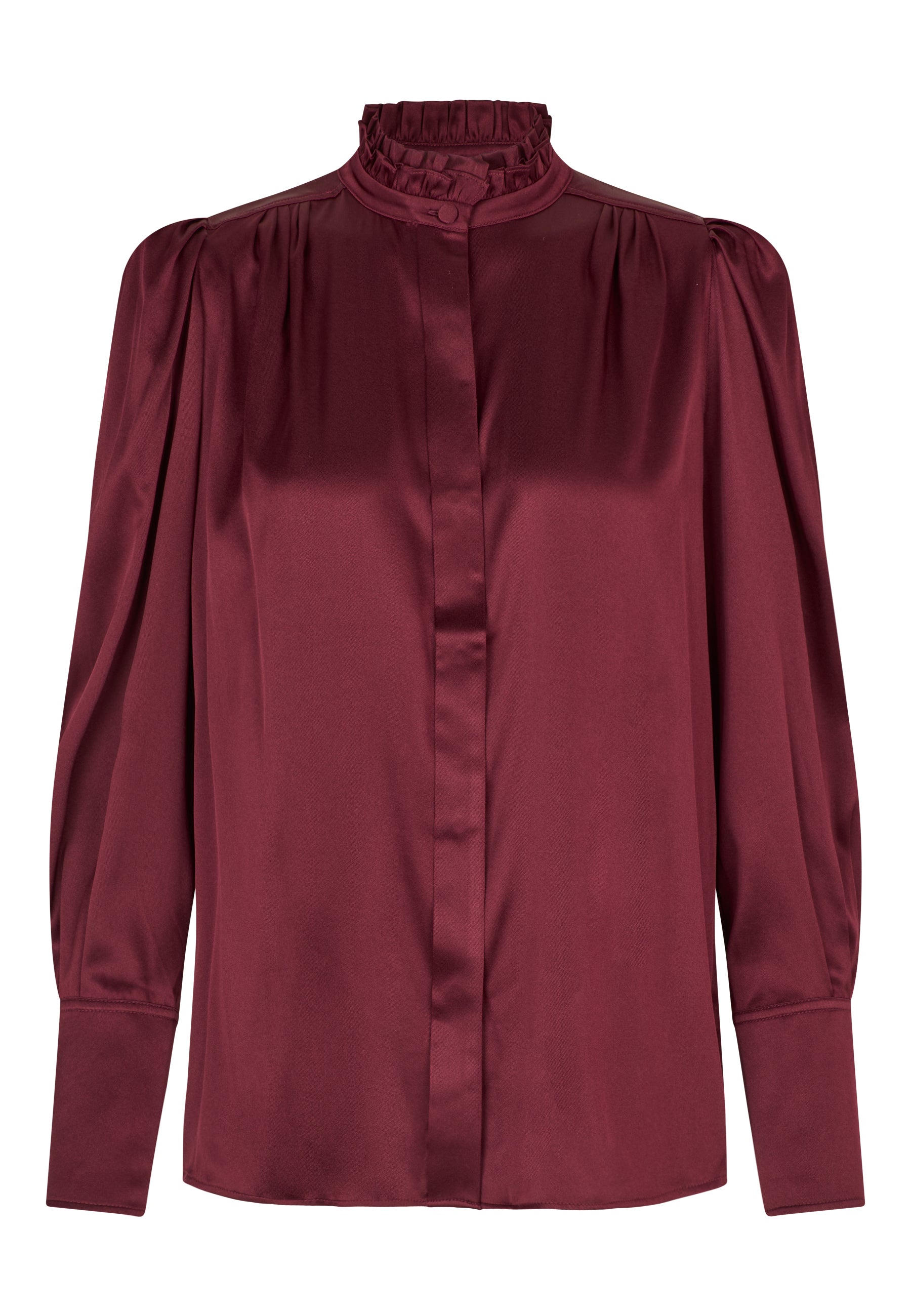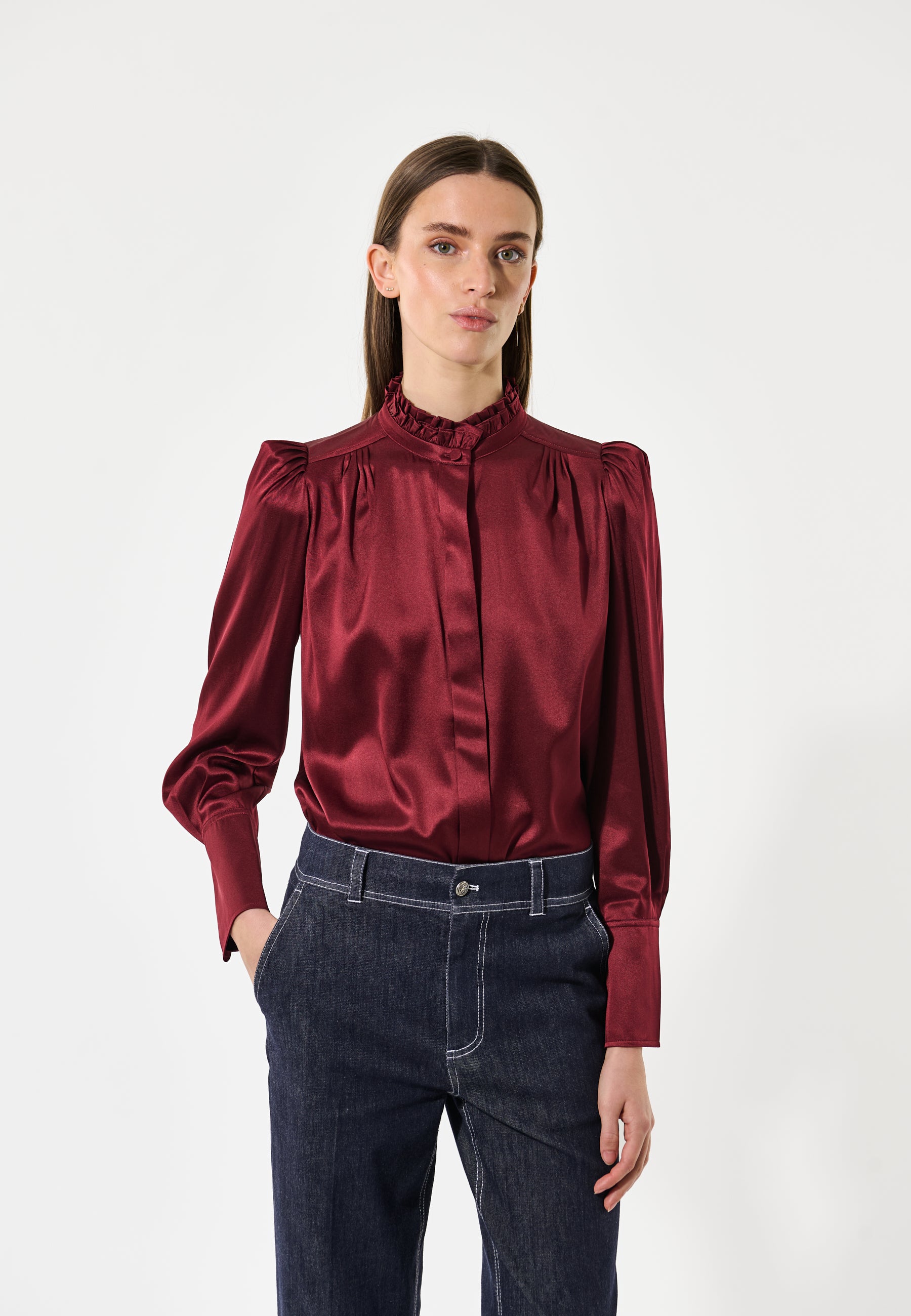 Skøn silkeskjorte i smuk vinrød farve farve. Skjorten har ærme med puf og bred manchet med buet kant, aftagelige skulderpuder, skjultknaplukning og smal flæse i halsen.