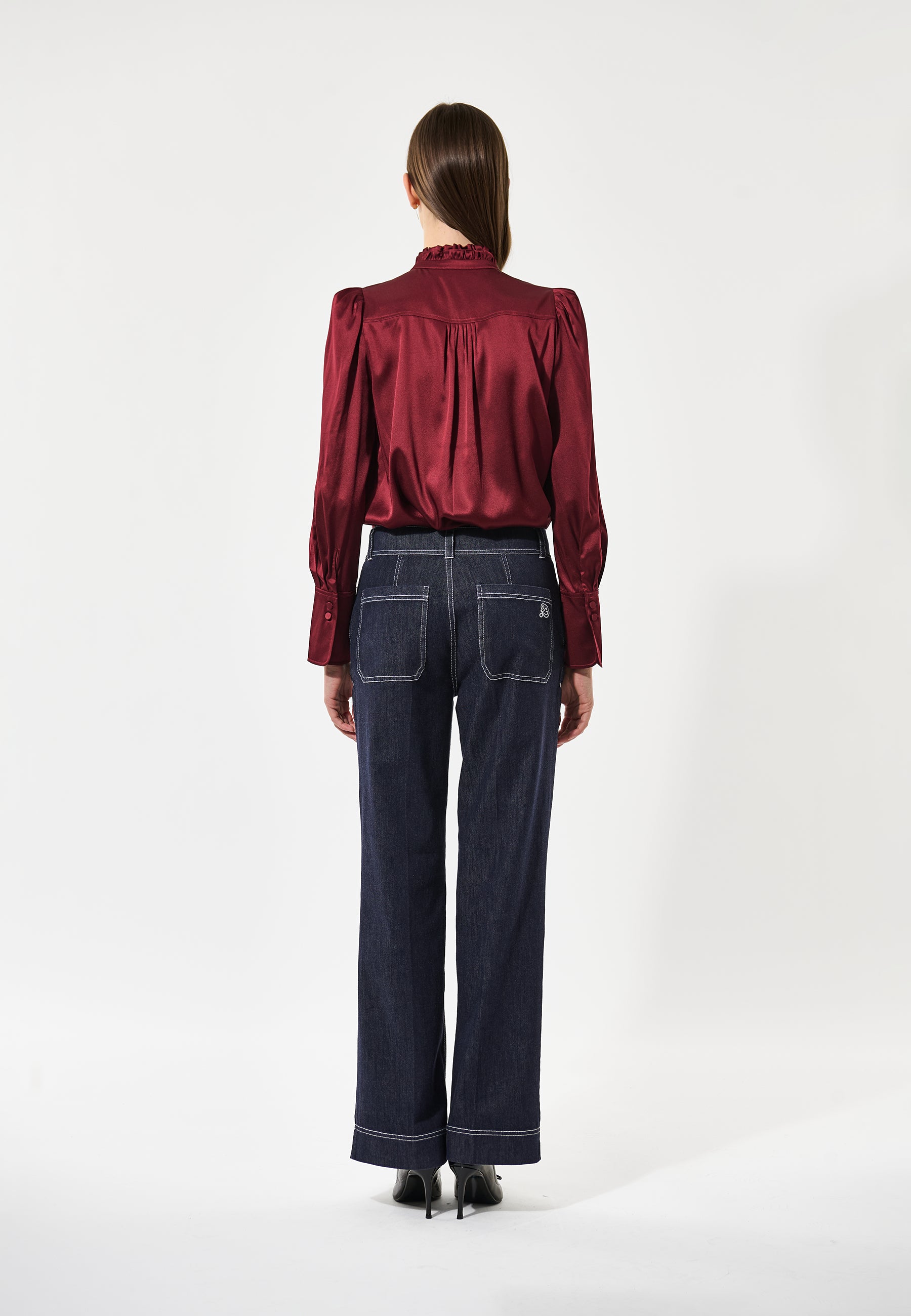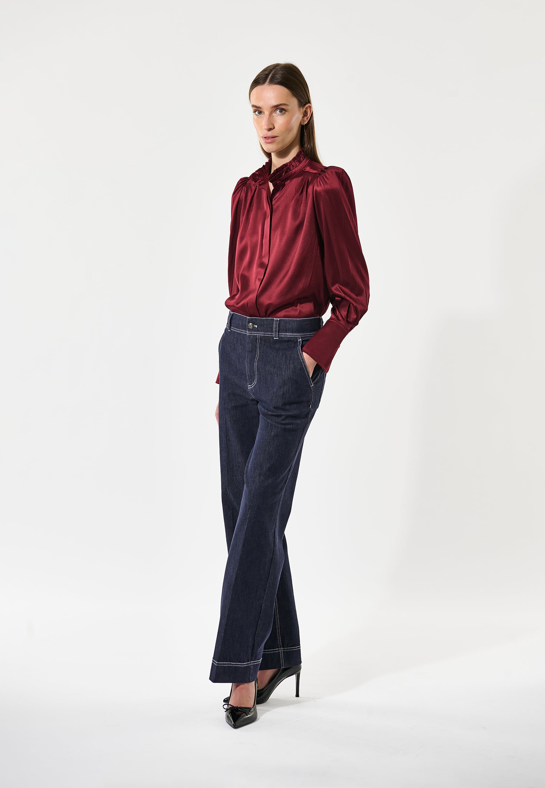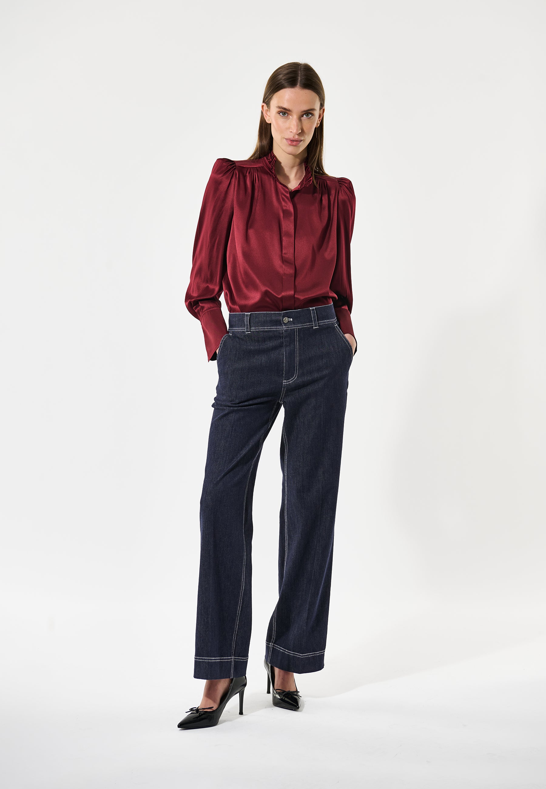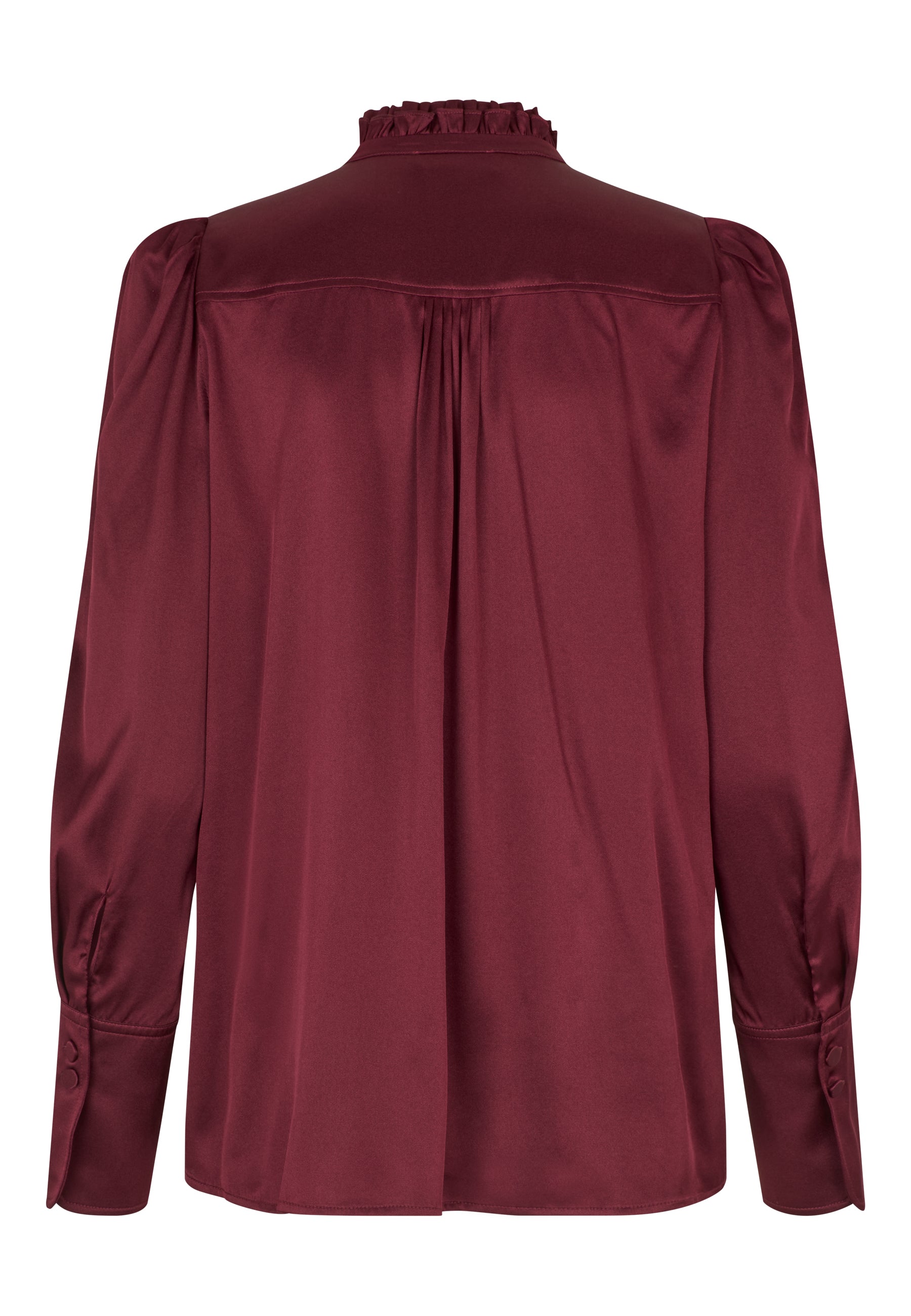 Skøn silkeskjorte i smuk vinrød farve farve. Skjorten har ærme med puf og bred manchet med buet kant, aftagelige skulderpuder, skjultknaplukning og smal flæse i halsen.