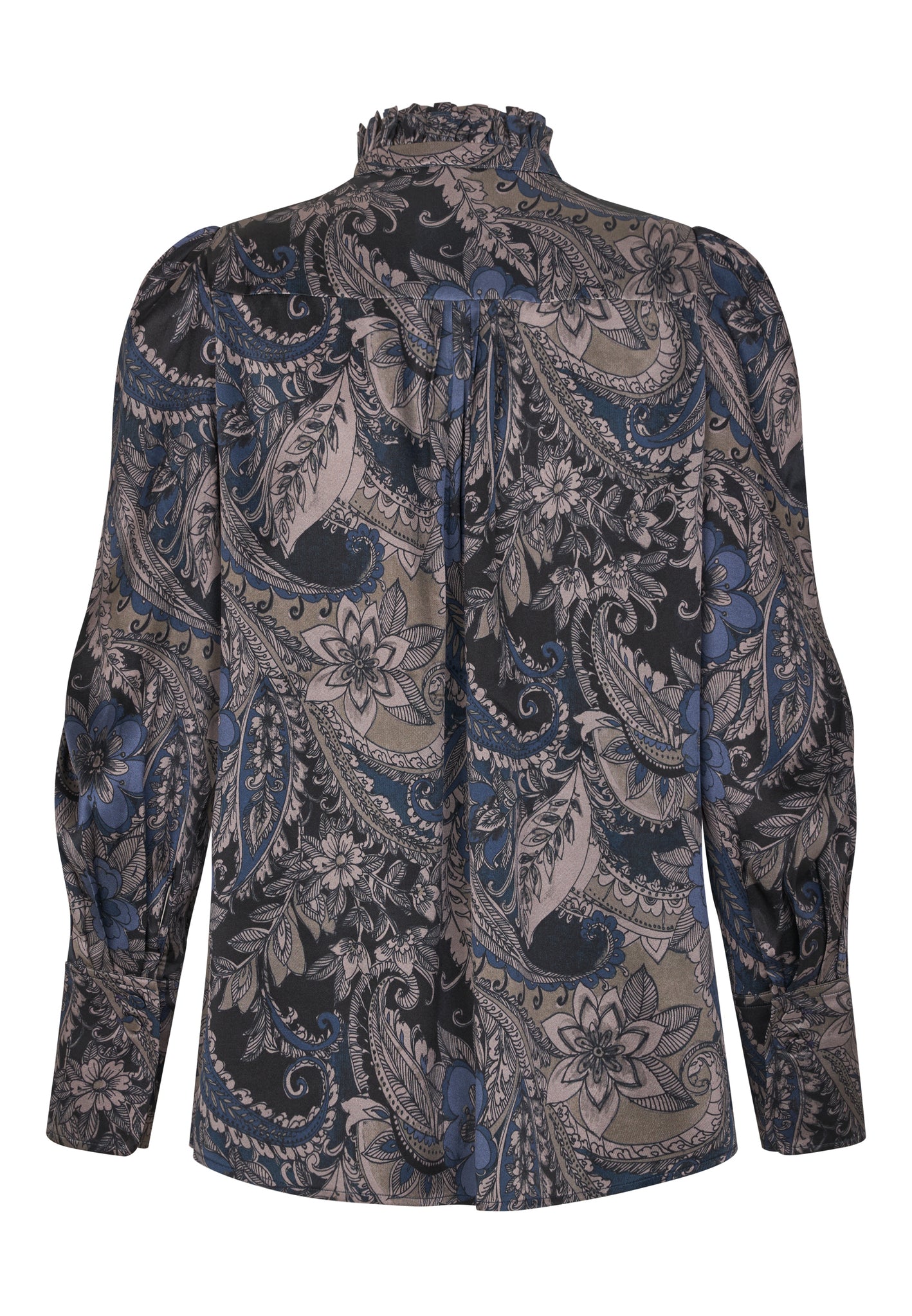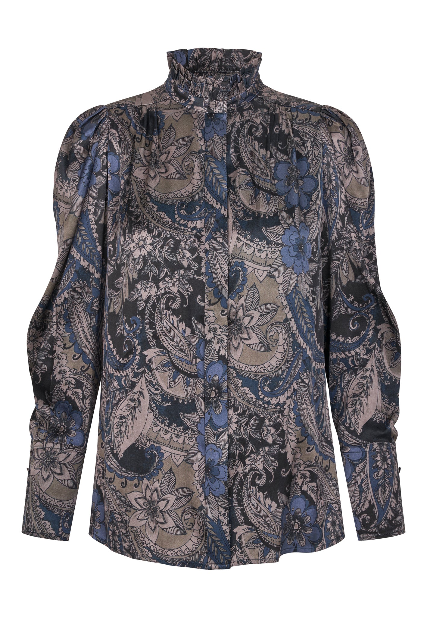 Skøn silkeskjorte i smukt beige, blåt, sort  paisleyprint. Skjorten har ærme med puf og bred manchet med buet kant, aftagelige skulderpuder, skjultknaplukning og smal flæse i halsen.
