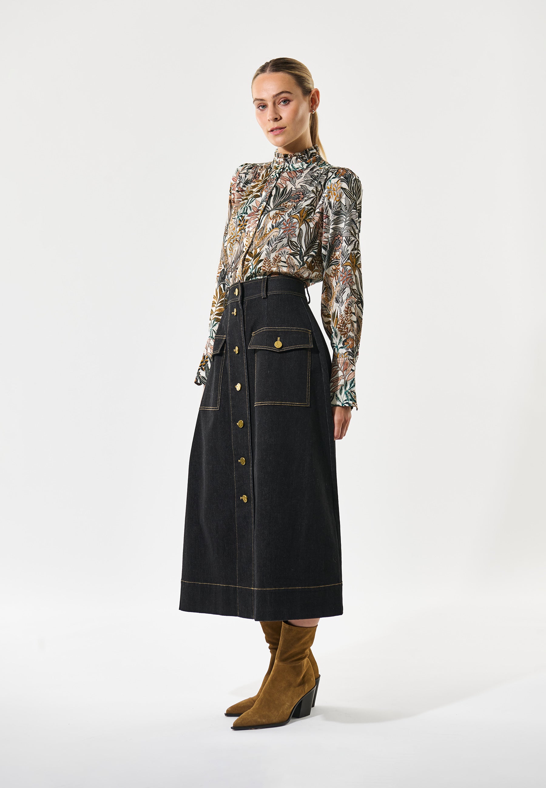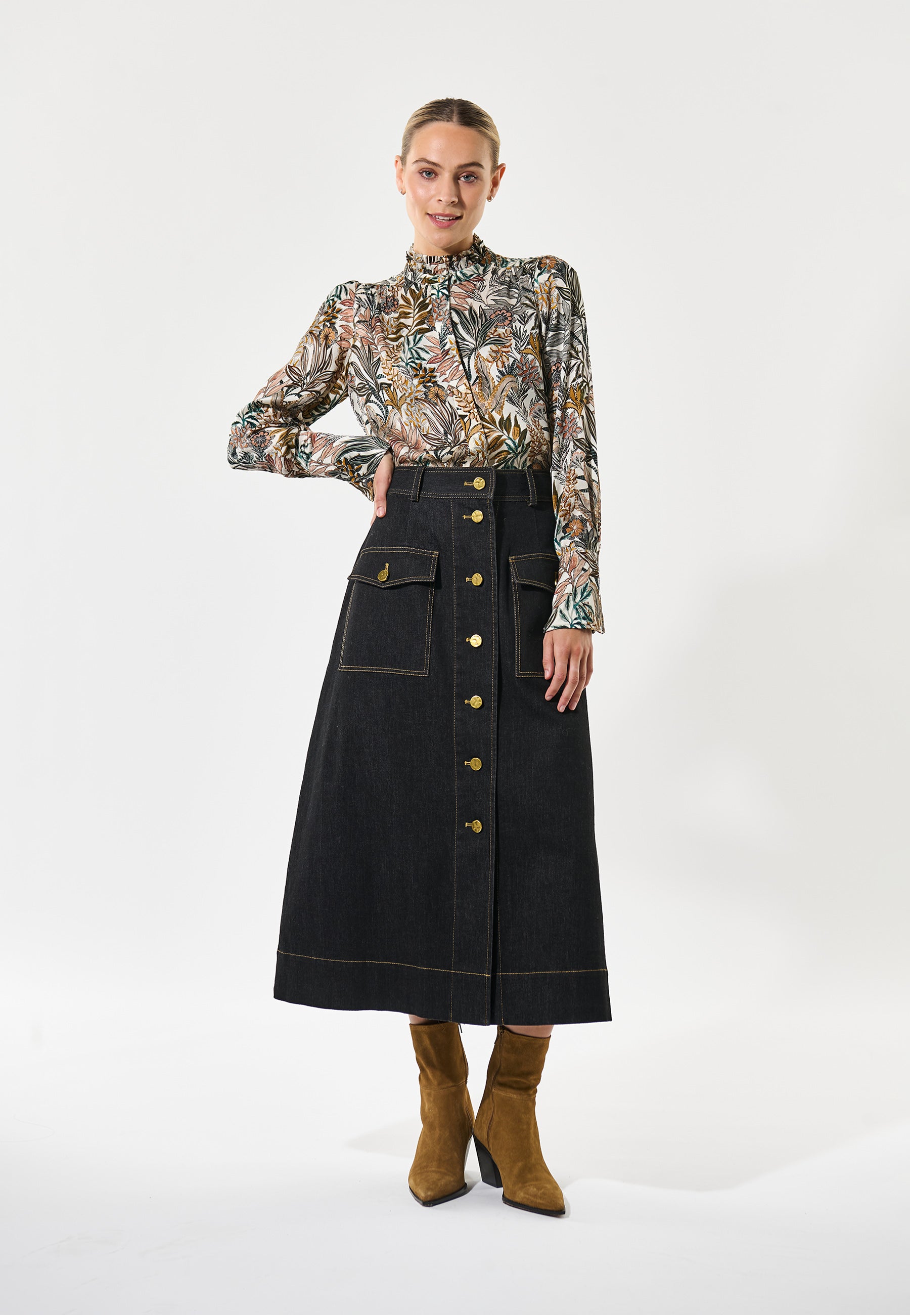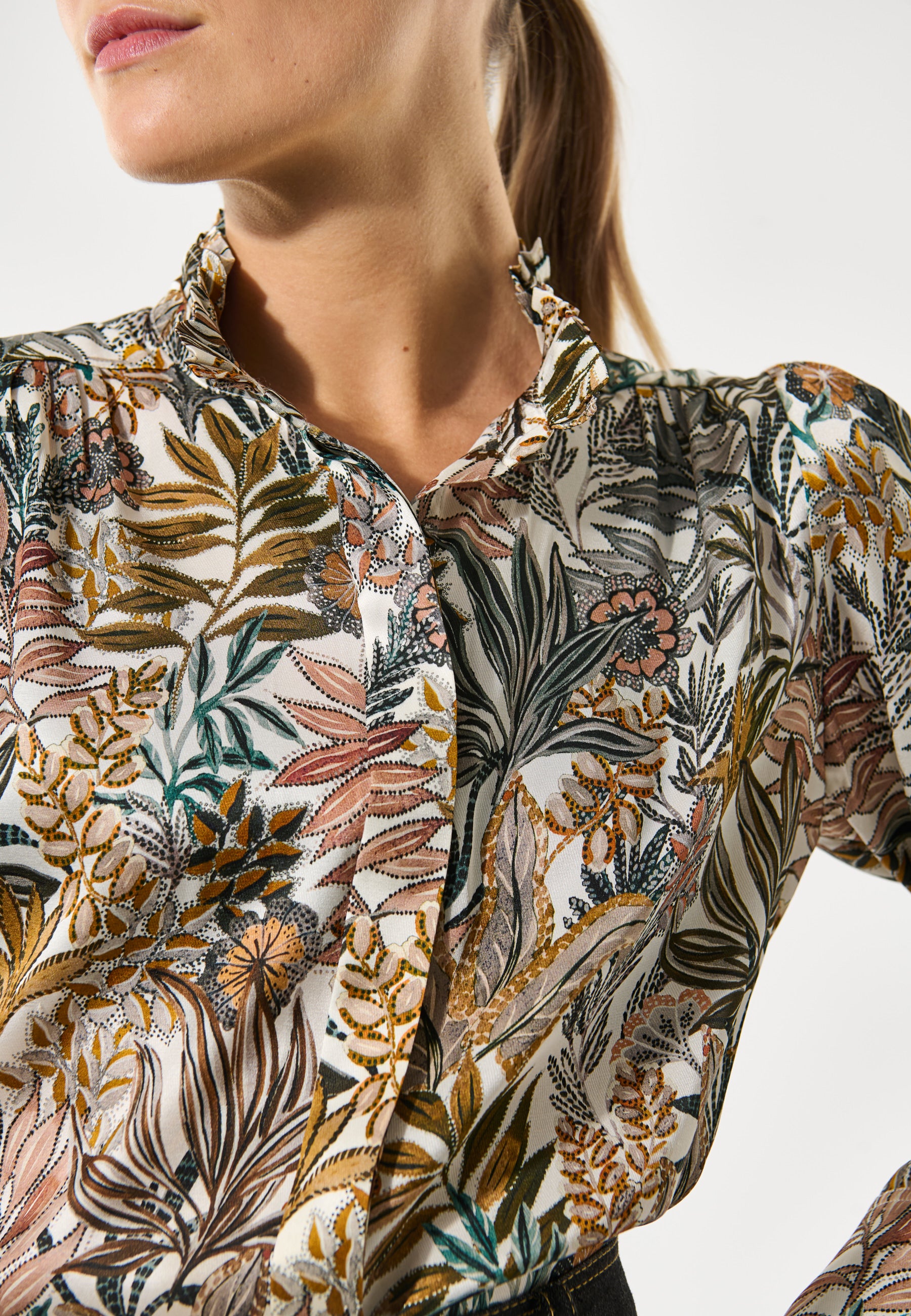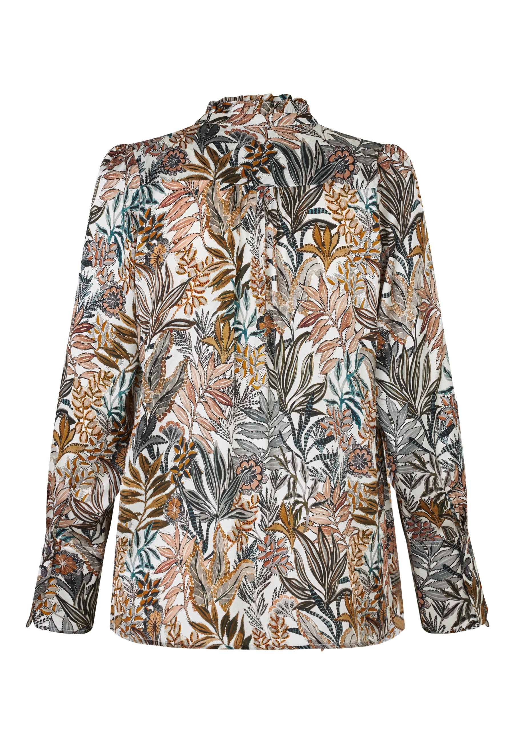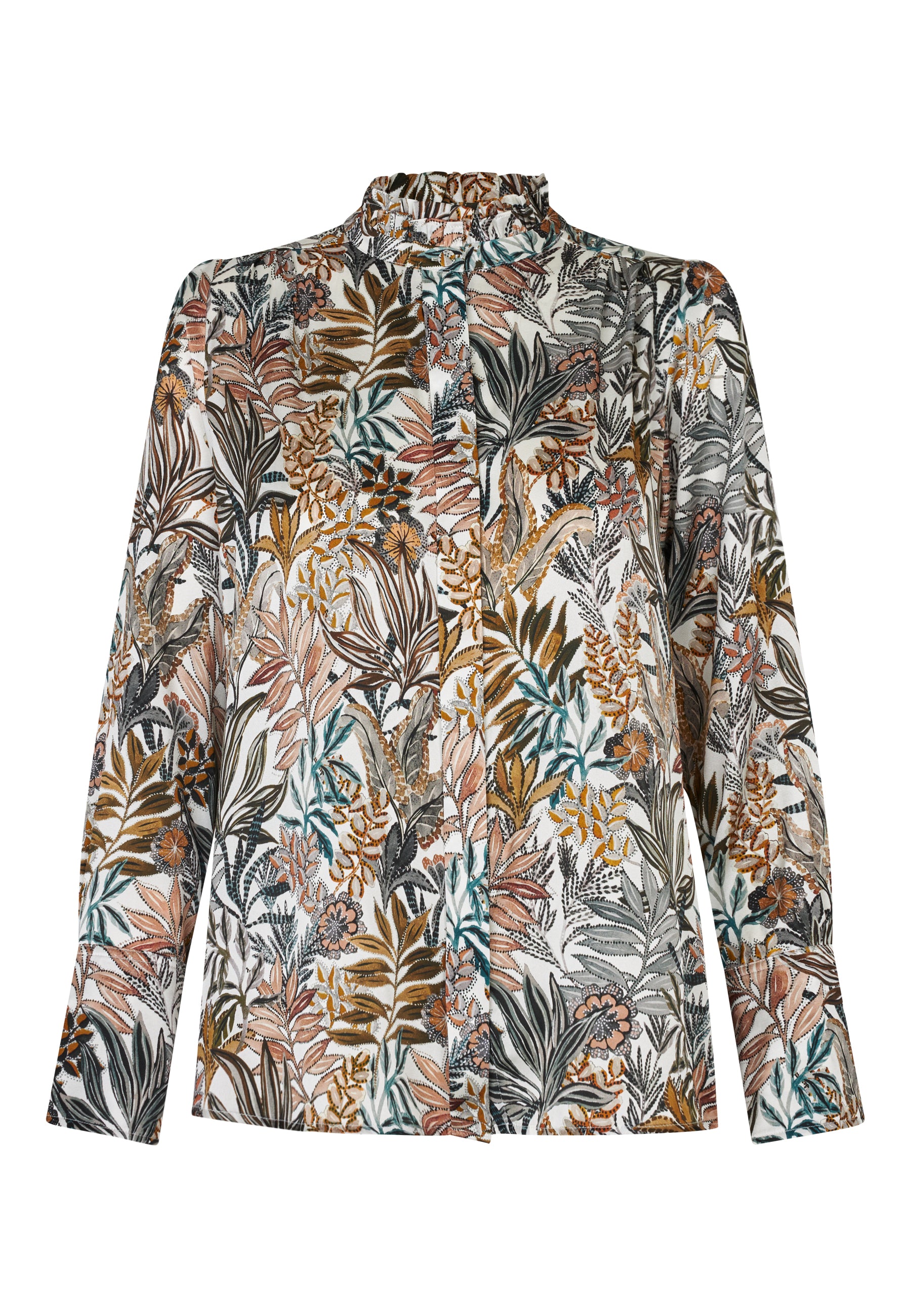 Skøn silkeskjorte i smukt blomsterprint bestående af beige, orange, sort og grønne nuancer. Skjorten har ærme med puf og bred manchet med buet kant, aftagelige skulderpuder, skjultknaplukning og smal flæse i halsen.