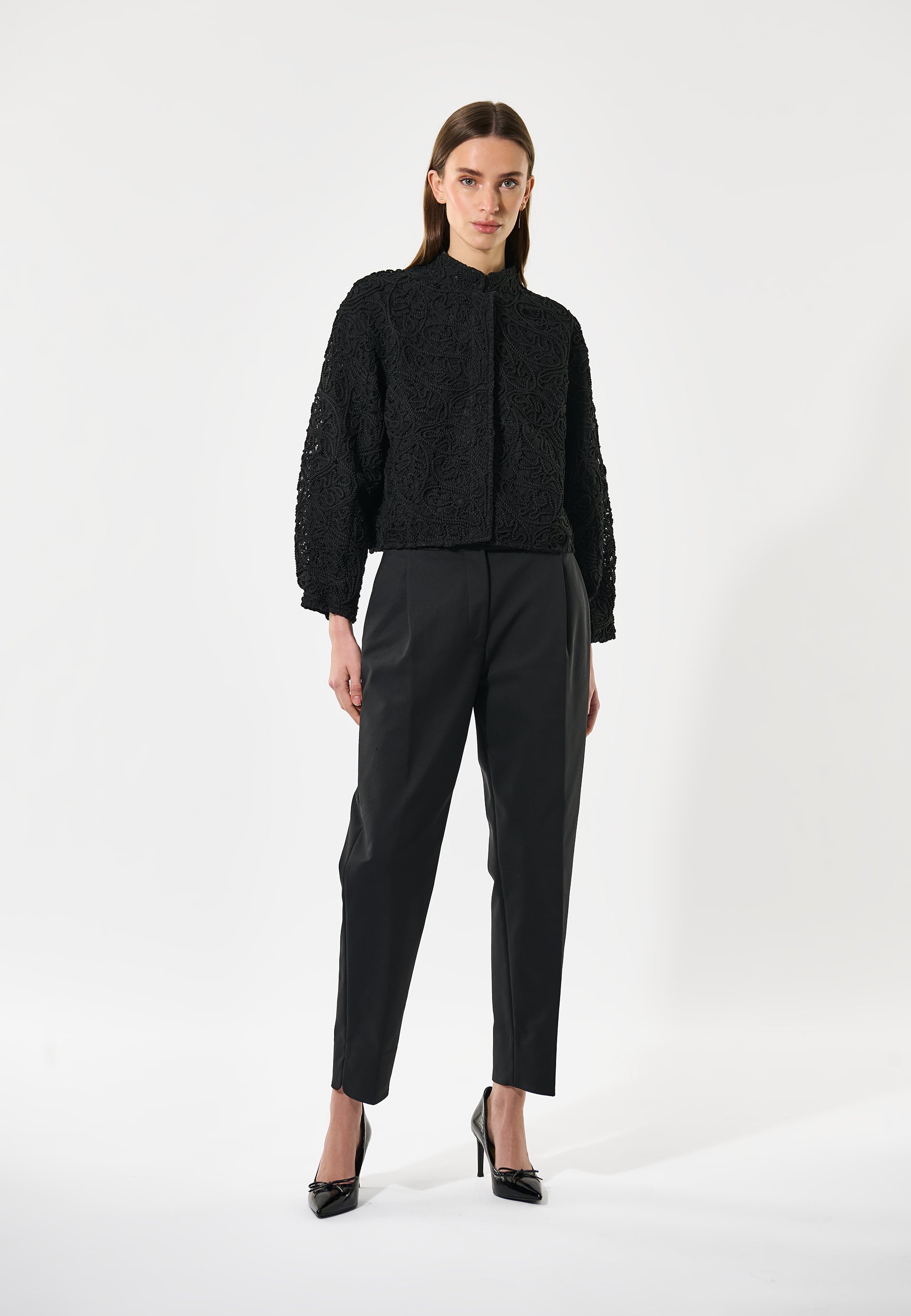 Kort jakke i rustik blonde. Jakken er i et enkelt snit, med kinakrave, tryklås lukning og volumiøse ærmer som snævre ind ved håndleddet.