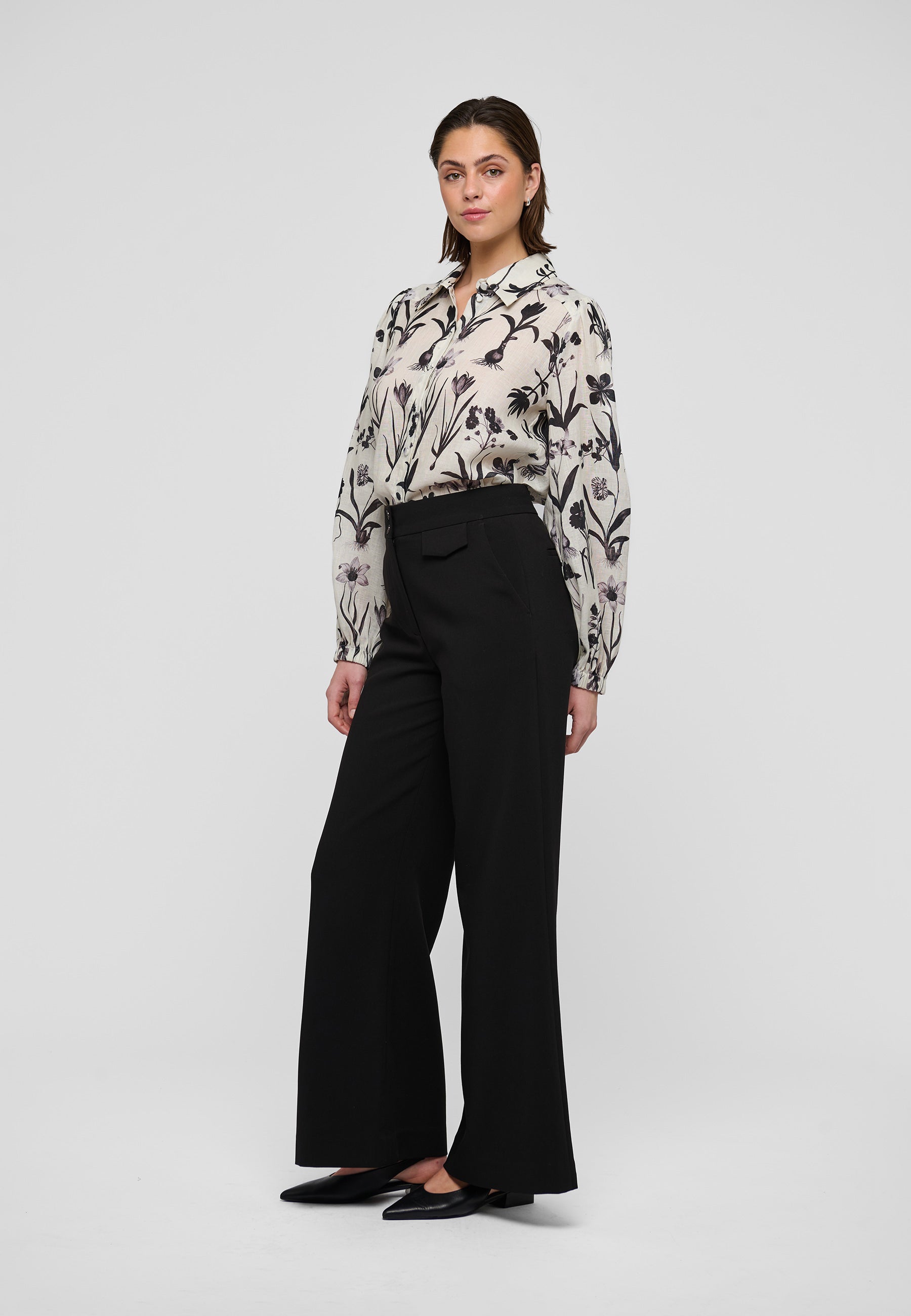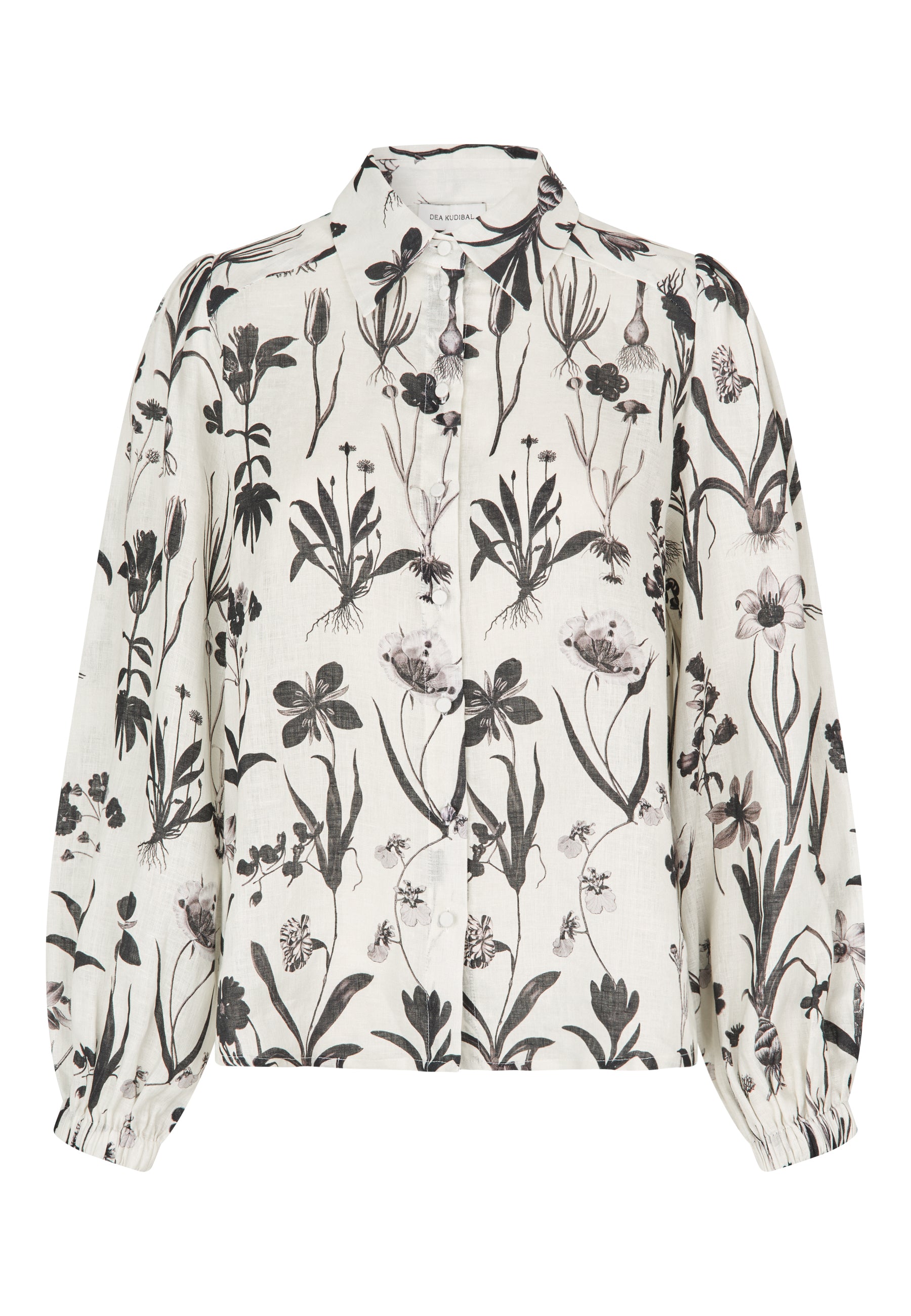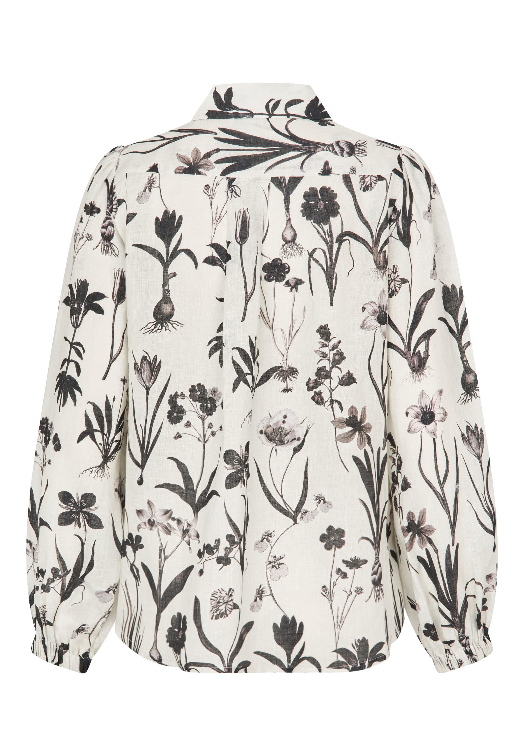 Smuk hørskjorte med har krave, klassisk bærestykke på skulderen, brede ærmer med elastikmanchet og fine betrukne knapper. Skjorten er i en lækker hør-kvalitet med et smukt og enkelt blomster print inspireret af gamle plante opslagsværke.